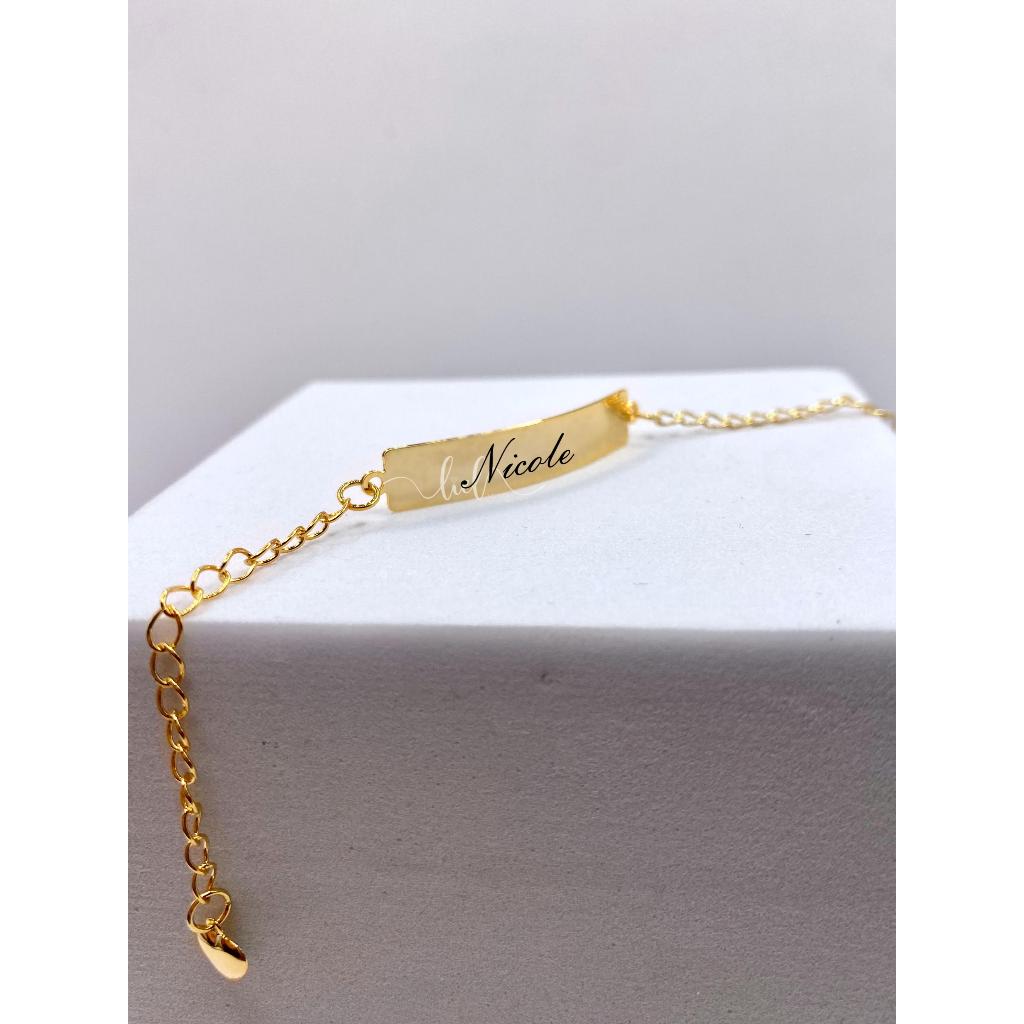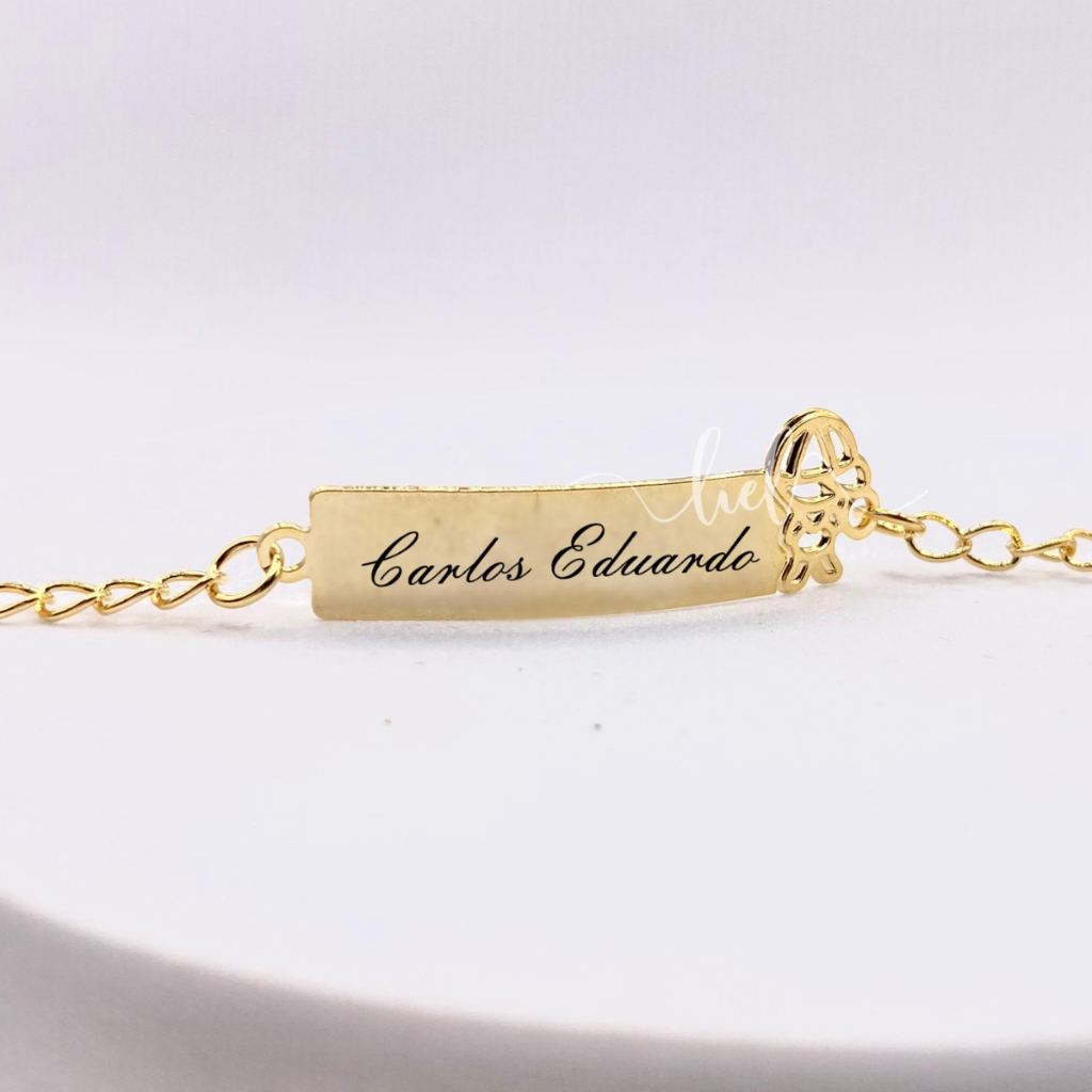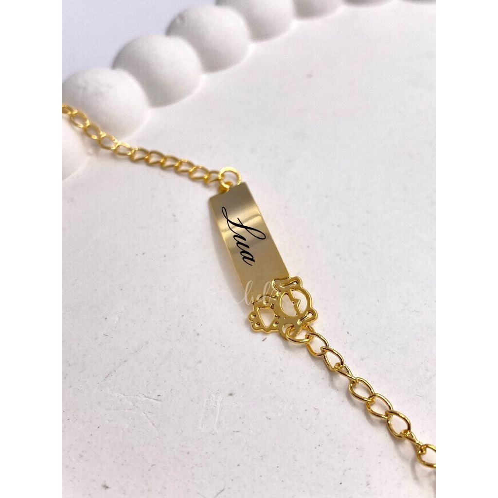 Pulseira Plaquinha Infantil Boneco Menino Menina Personalizada Gravação Nome Banhada a Ouro 18k