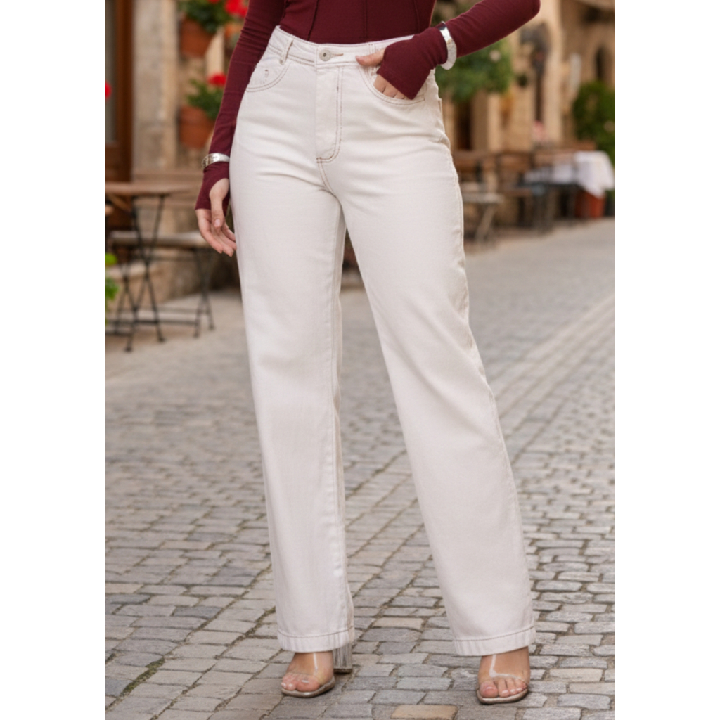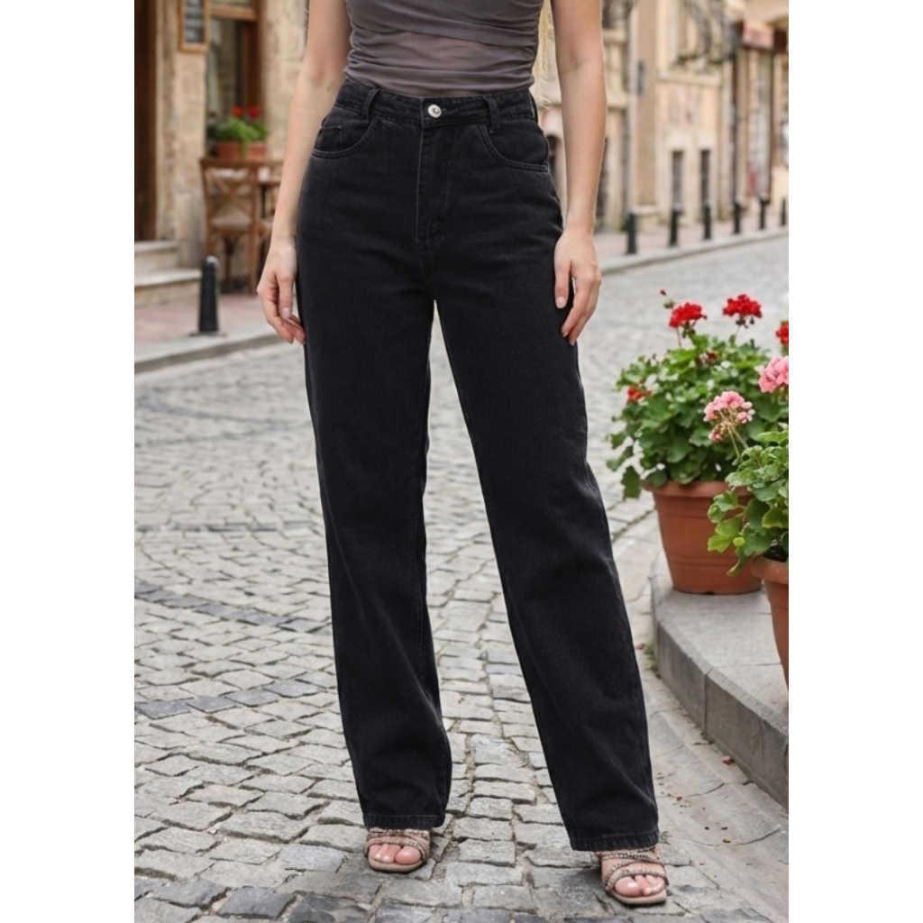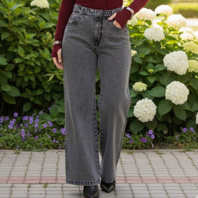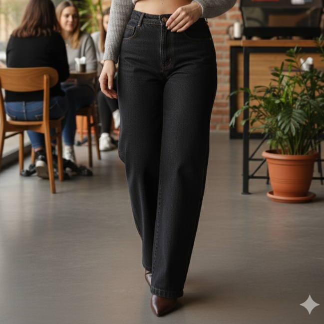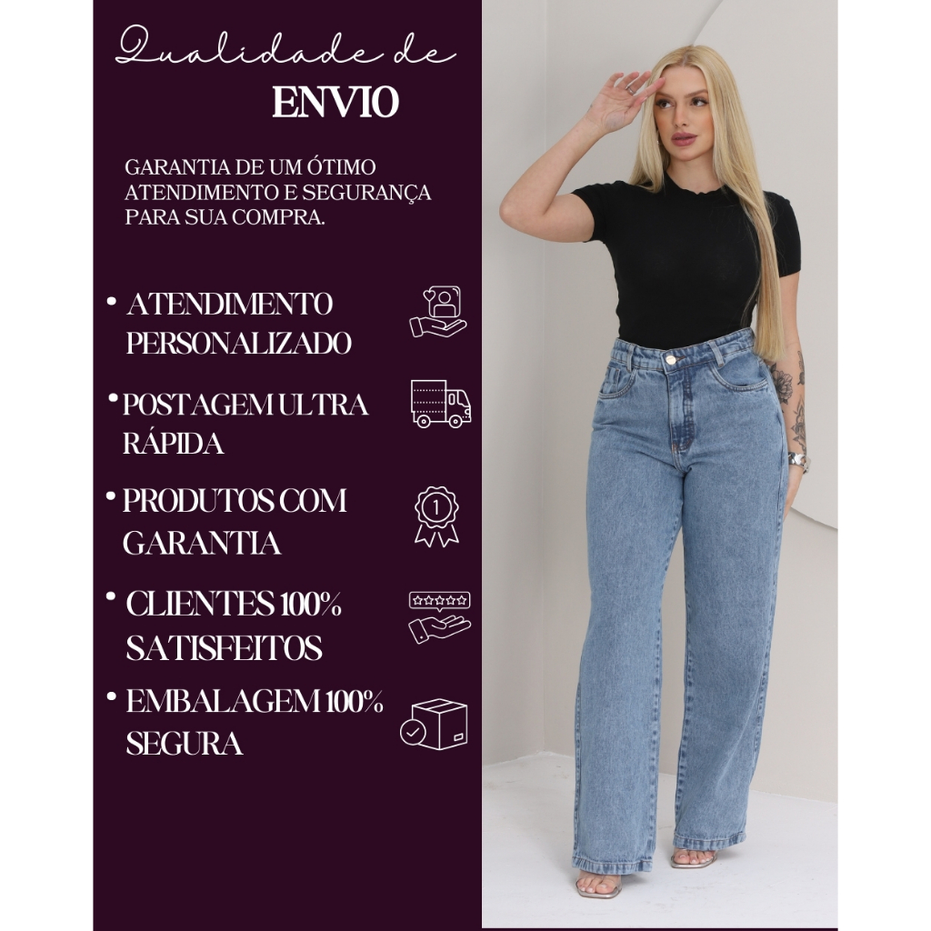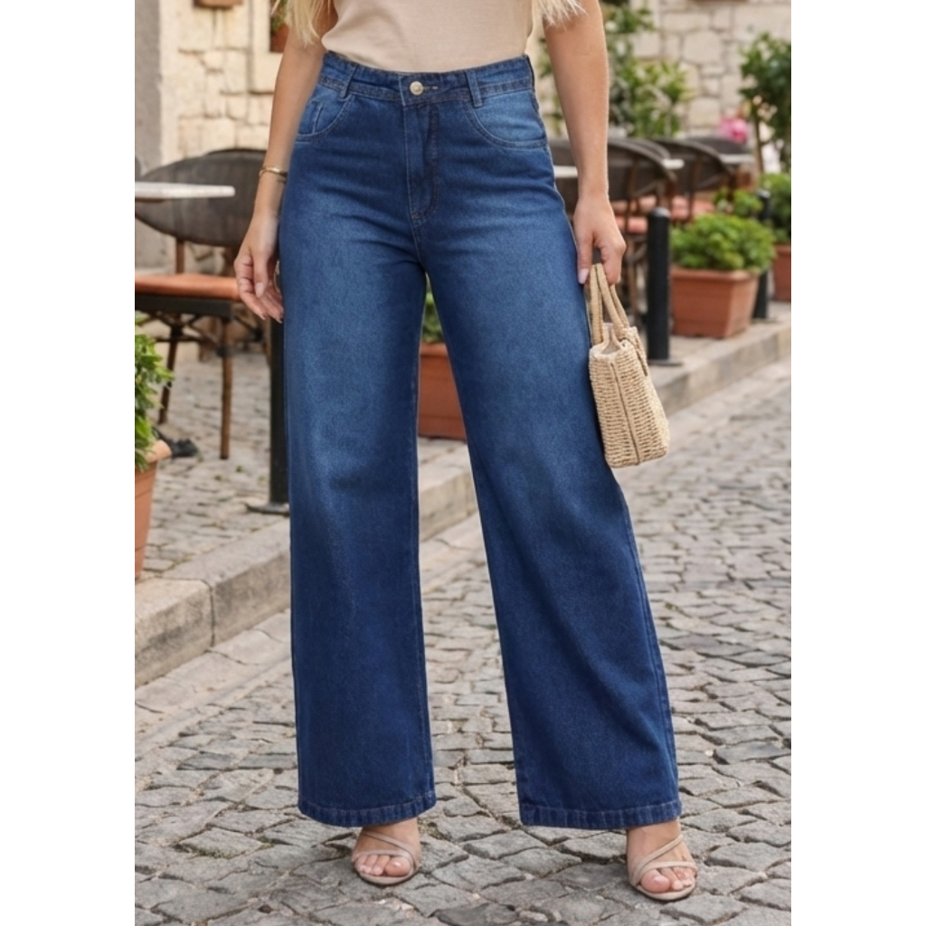 Calça Jeans Feminina Wide Leg Pantalona Cintura Alta Tecido Grosso Básica Lisa Marmorizada