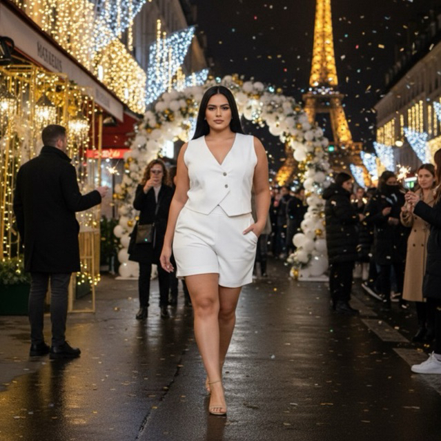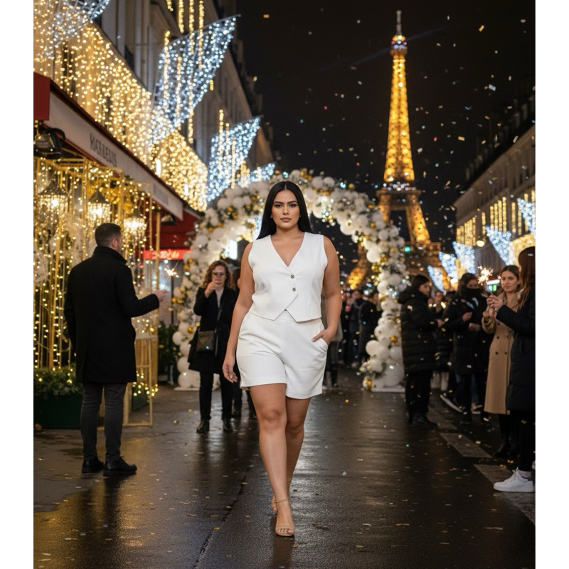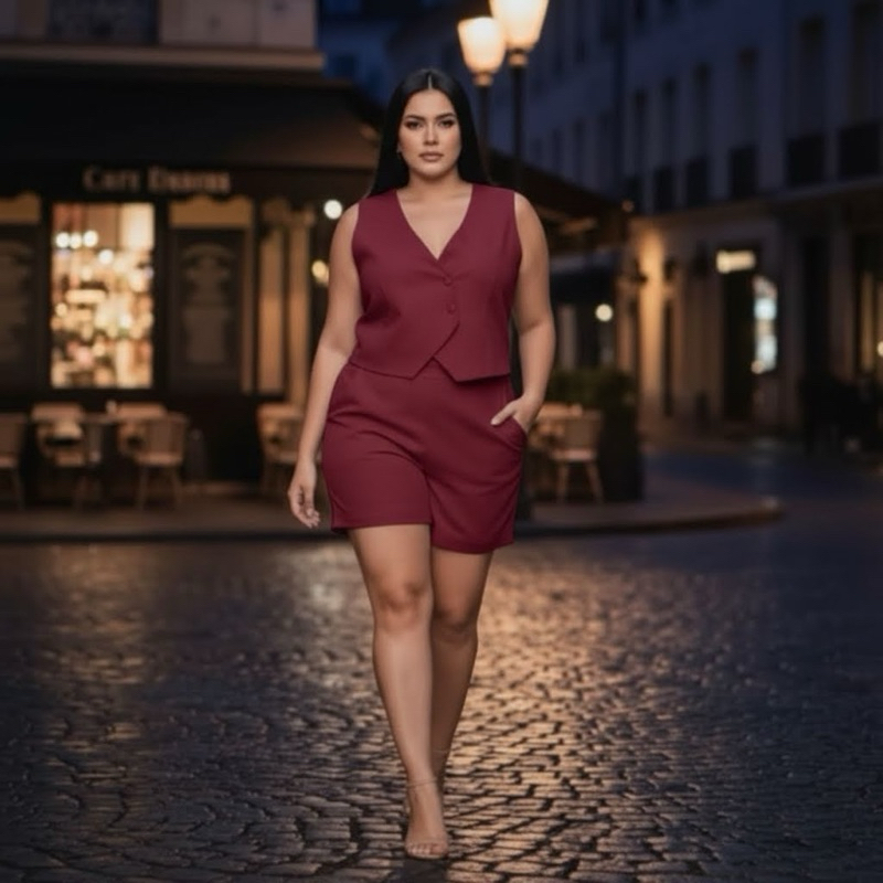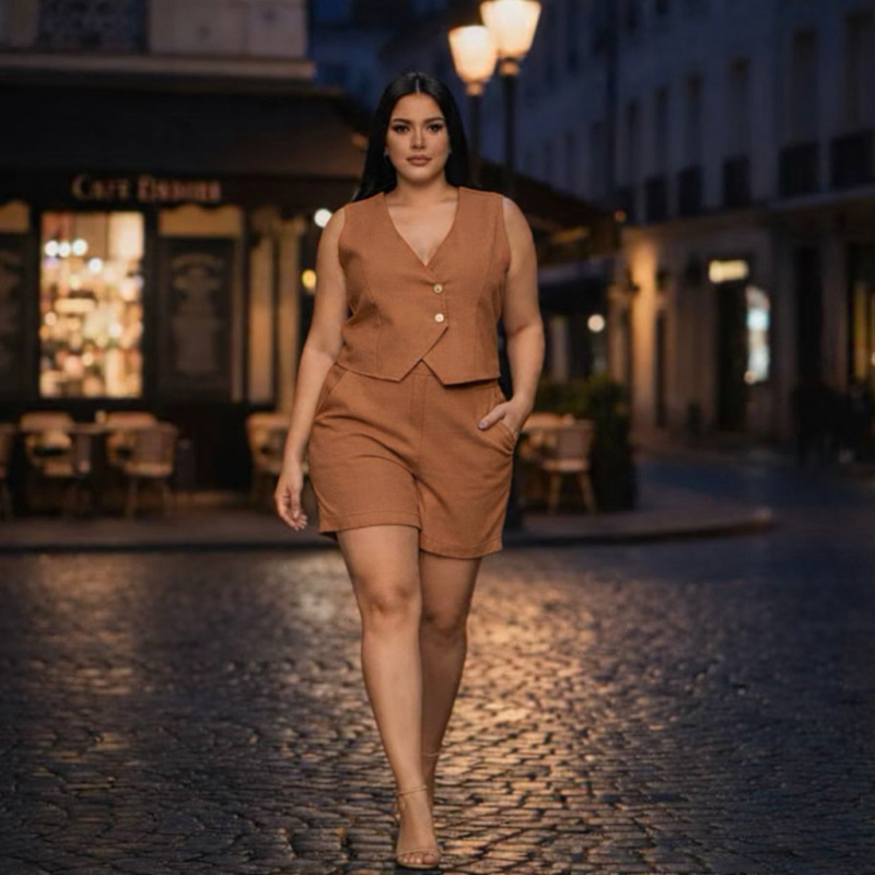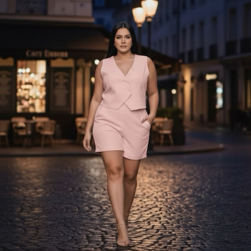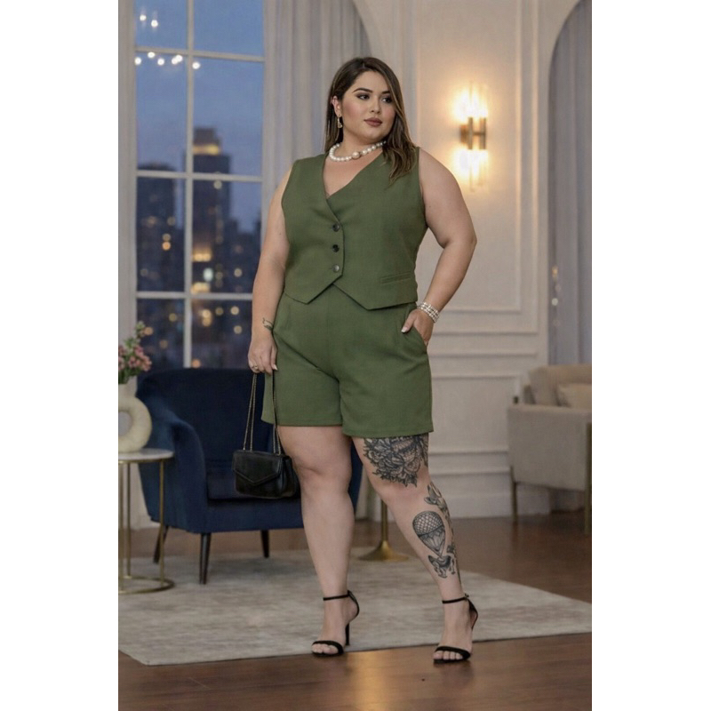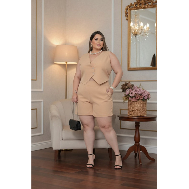 Conjunto Plus Size Alfaiataria Feminino – Colete Decote V + Short com Bolsos