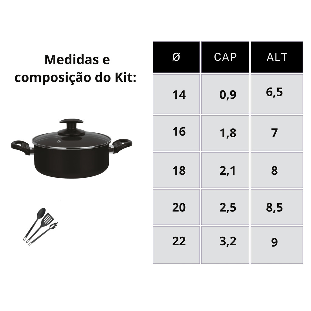 Conjunto De Panela 8 Pçs Teflon Antiaderente Tampas De Vidro 14 a 22 preto