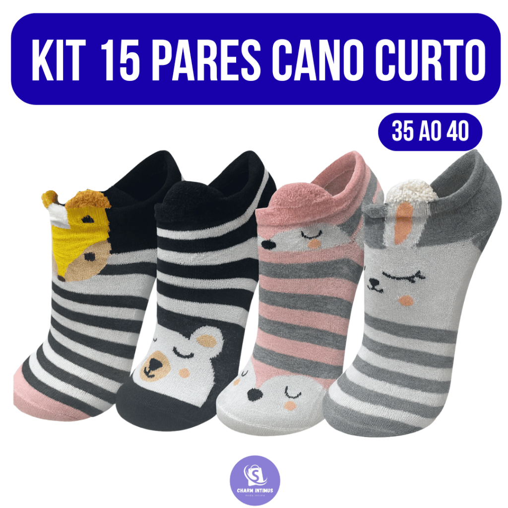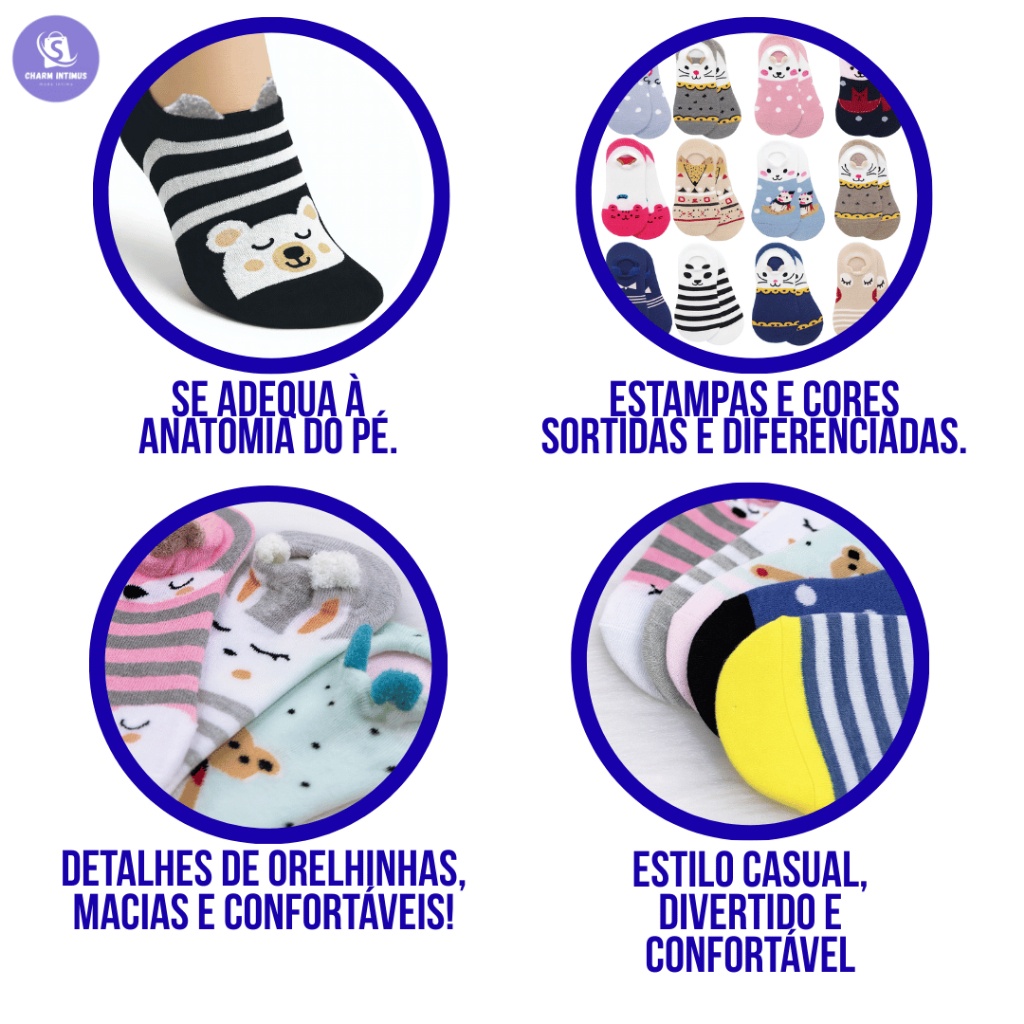 Kit Pares de Meias Soquete Bichinho Adulto Feminina Estampada