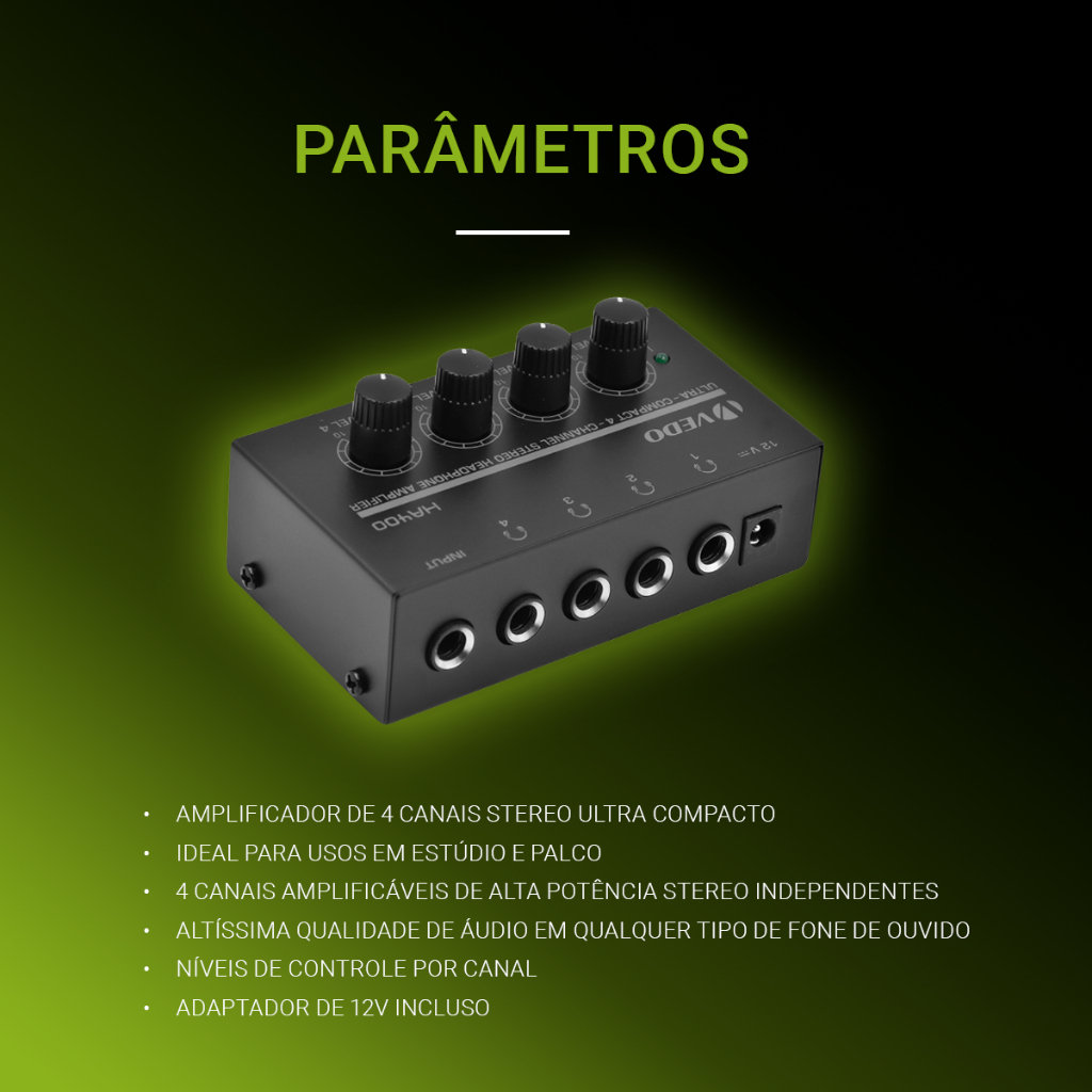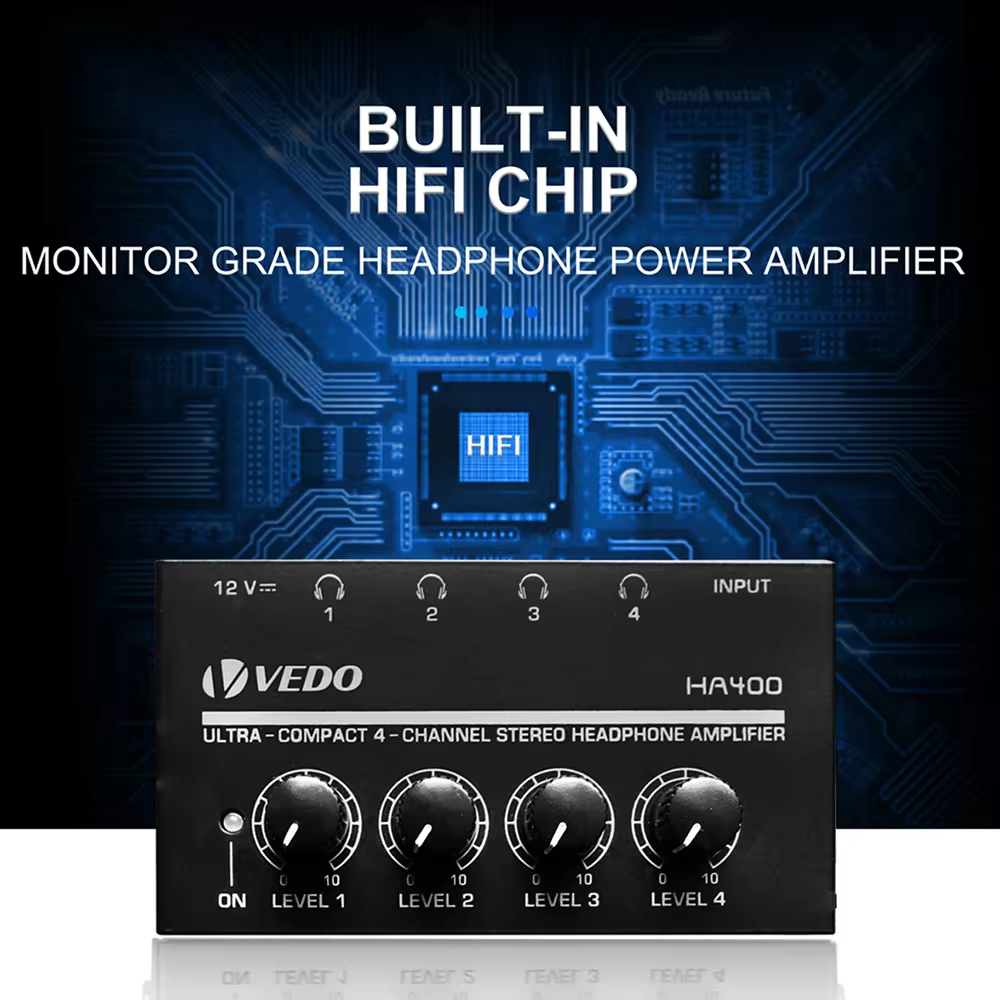 Amplificador de auscultadores VEDO HA400 Amplificador estéreo de áudio de 4 canais ultra-compacto com adaptador de