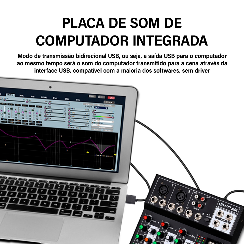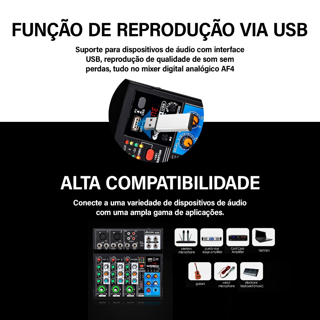 VEDO AF4 Mixer Misturador analógico Placa de som digital fundida 4 canais Definições de funções personalizadas Consola