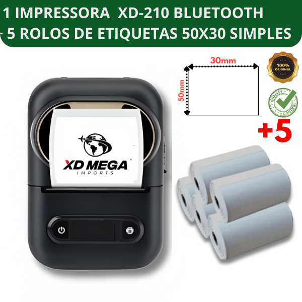 1 Impressora XD-210 + 5 rolos de etiqueta adesiva 50x30 simples