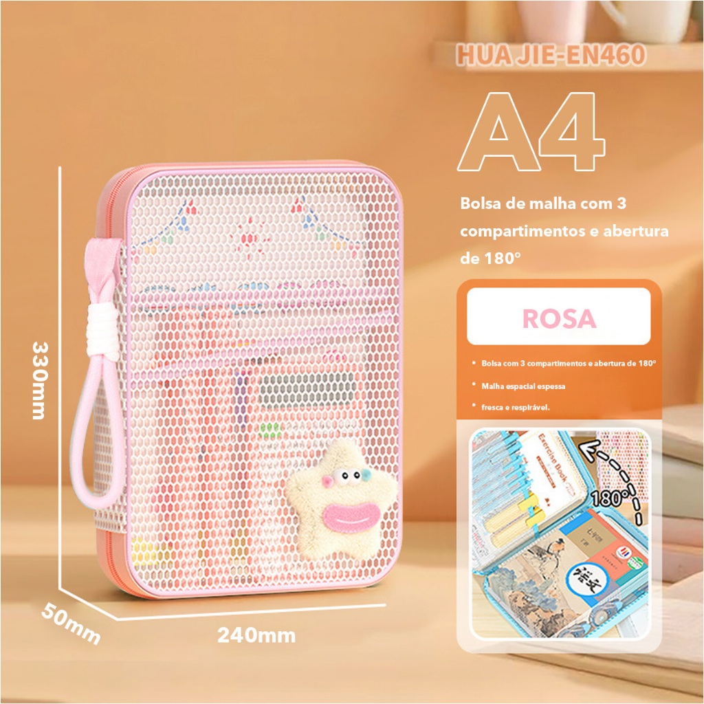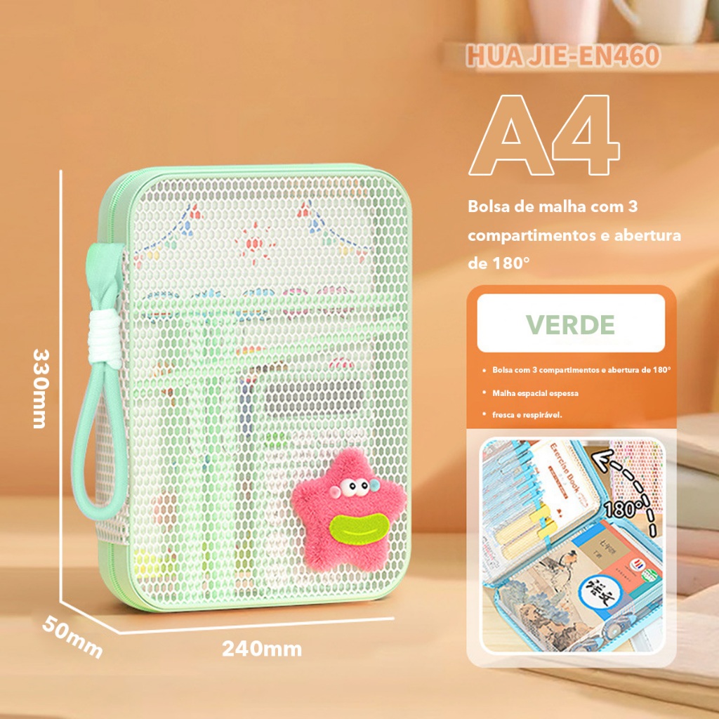 Organizador A4 com 3 Compartimentos, Alça de Mão e Abertura de 180° - Bolsa para Livros, Material Escolar e Documentos