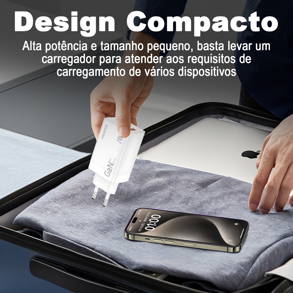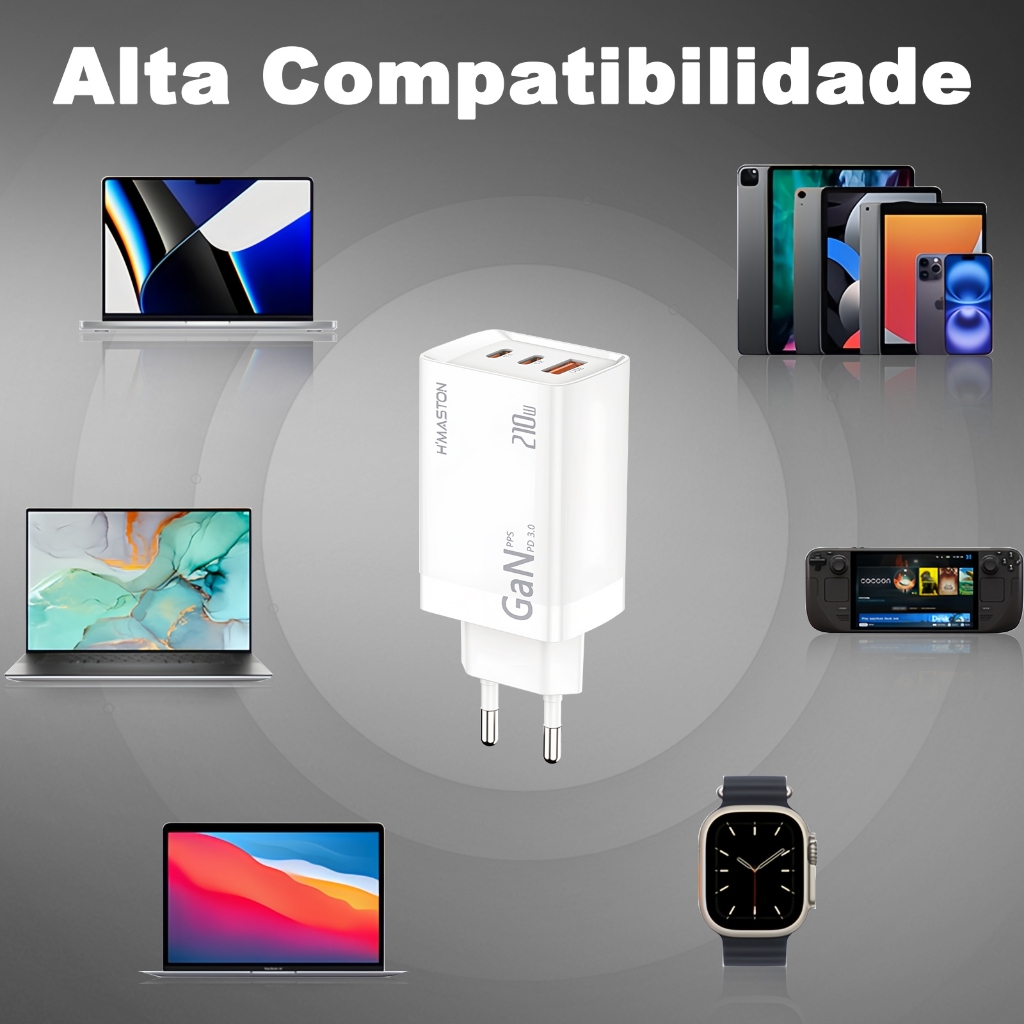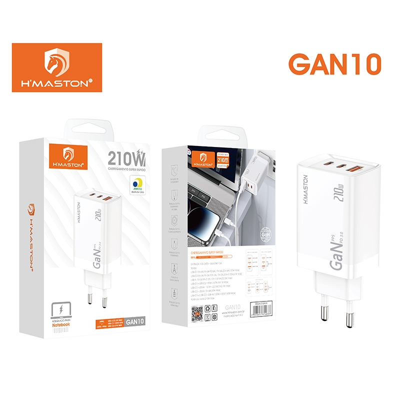 Carregador GaN 210W Turbo USB-C+USB-A 3 Portas Carga Rápida Cor Branco Gan10