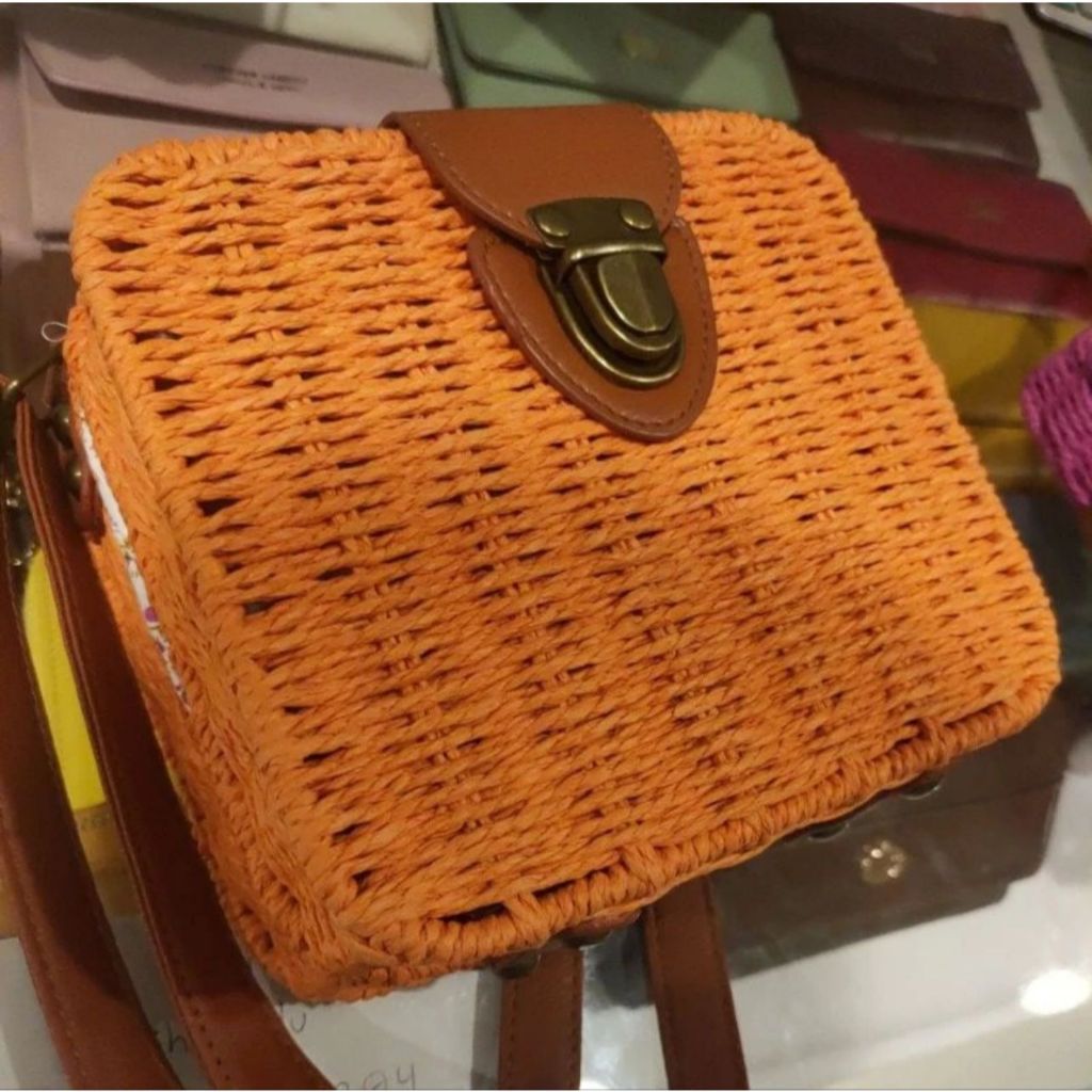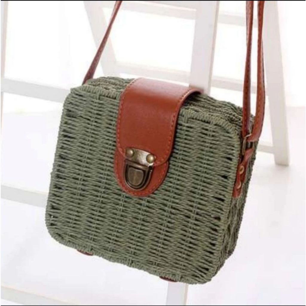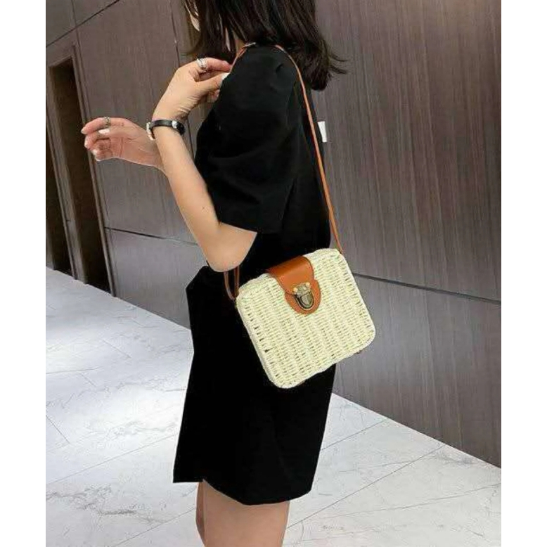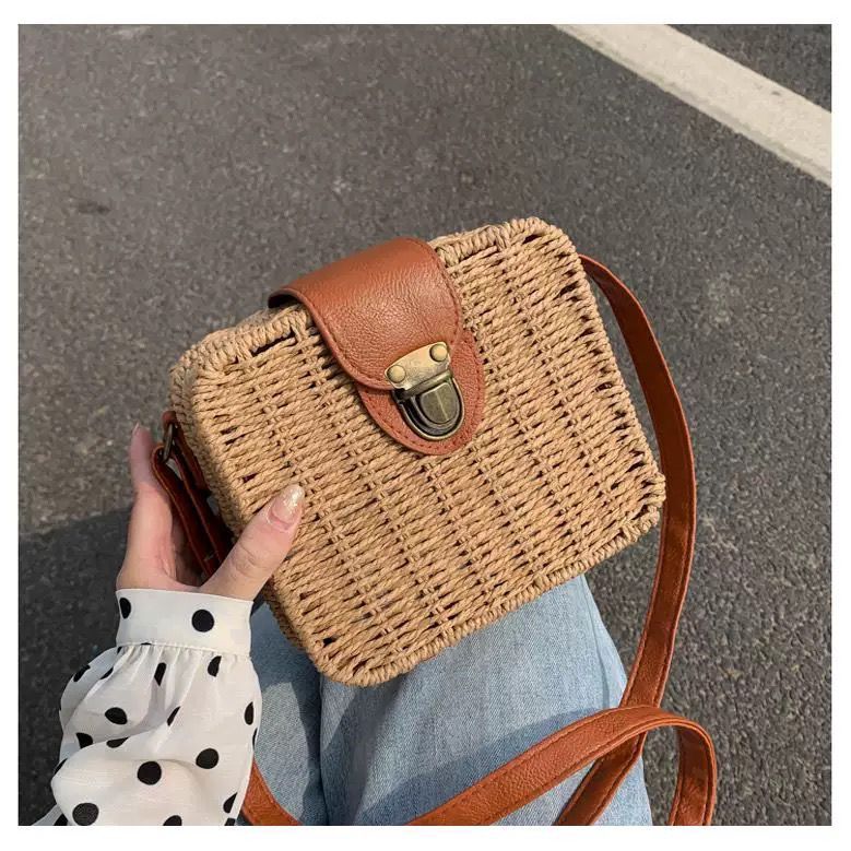 Bolsa Palha Boho Praia Quadrada Moda Forrada Verão Alça Cor Marrom Quadrada Cor da correia de ombro Couro Desenho do tec