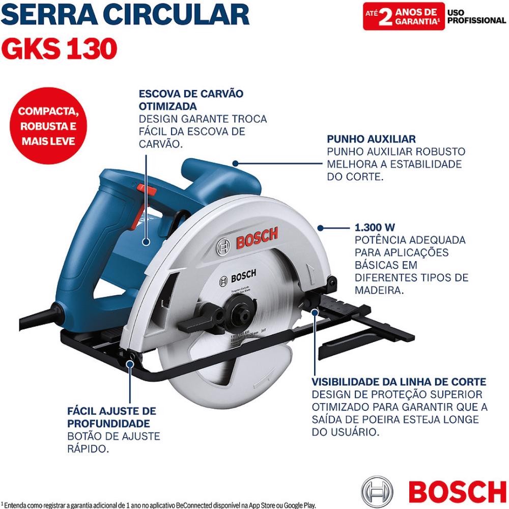 Serra Circular 184mm 1300W GKS 130 com Disco e Estojo Brocas e Pontas 30 Peças BOSCH 110V