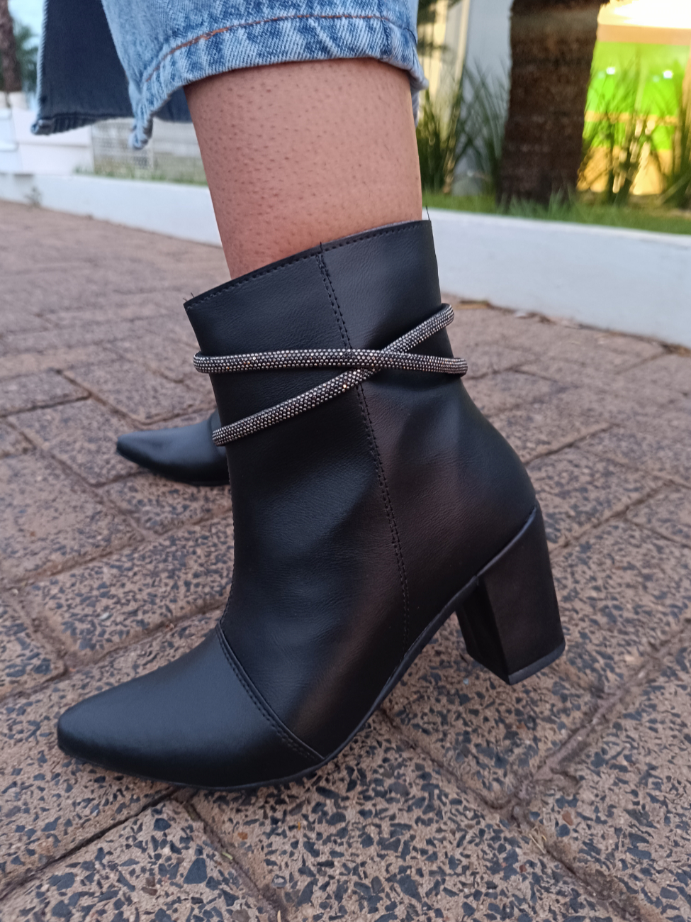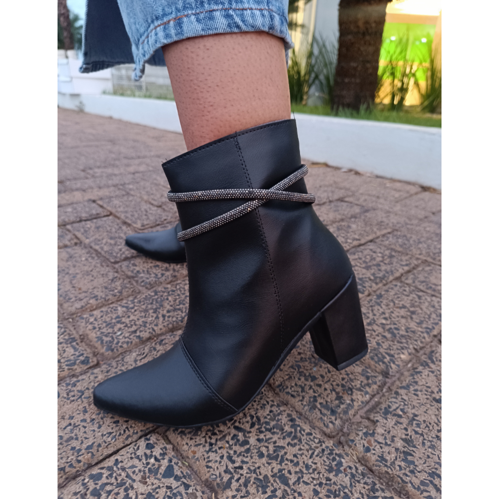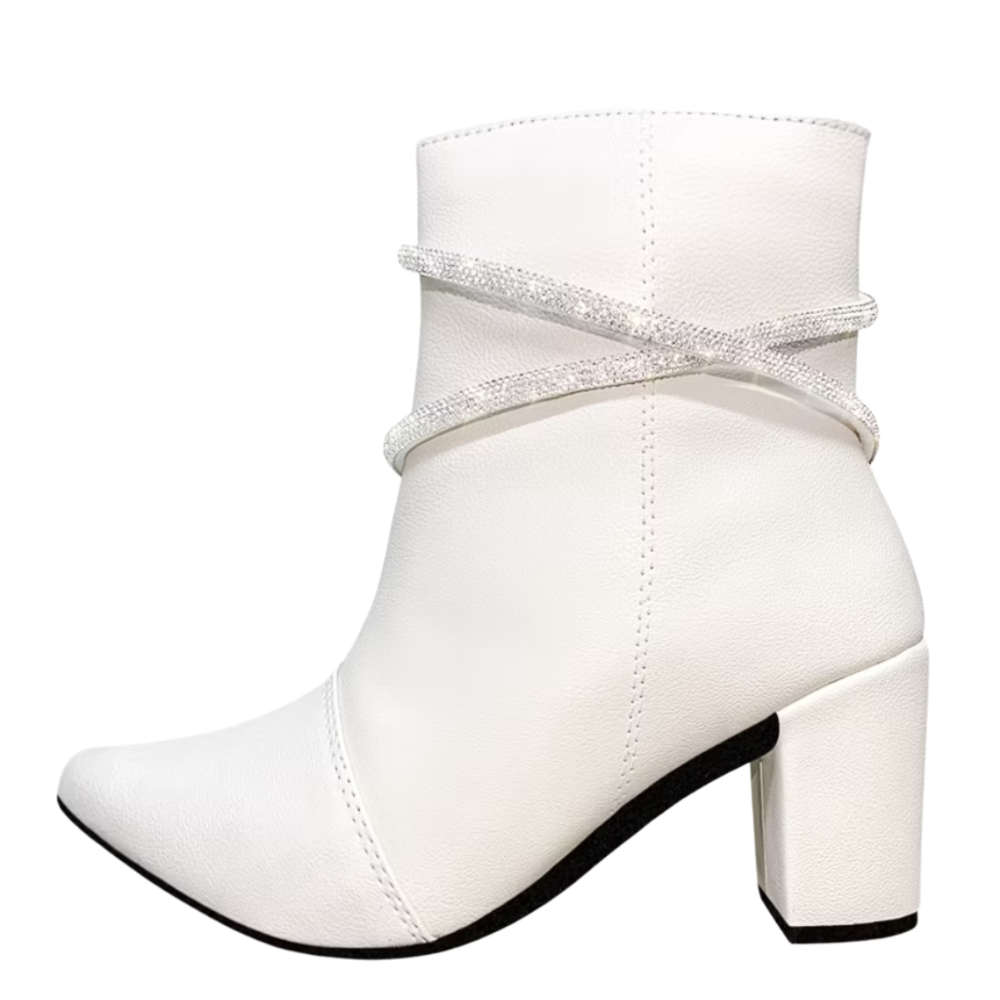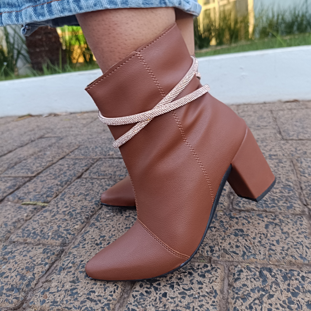 Bota Feminina Fashion Bico Fino com Tiras de Strass Salto Bloco Confortável Elegante