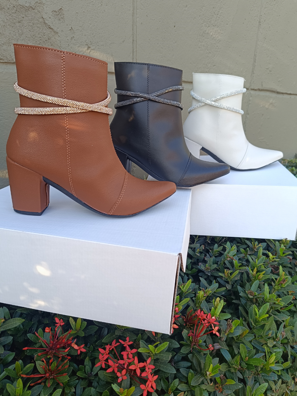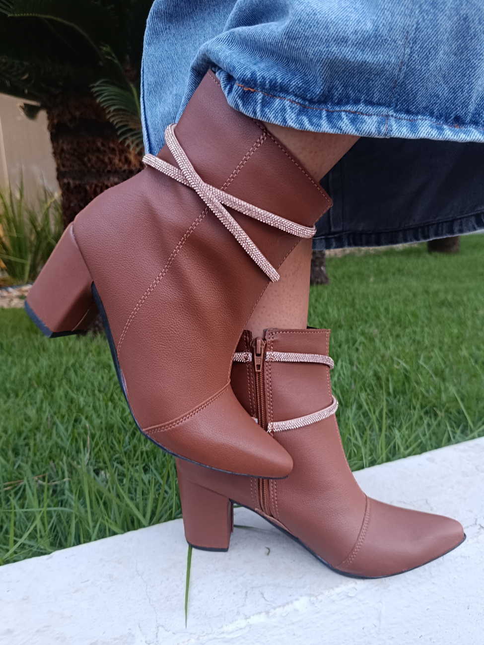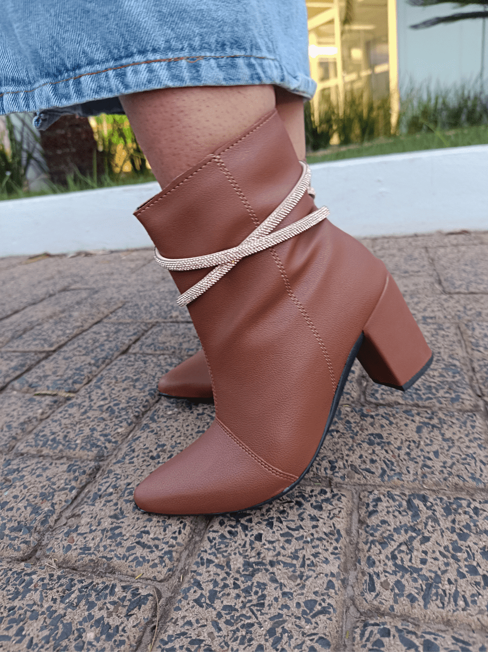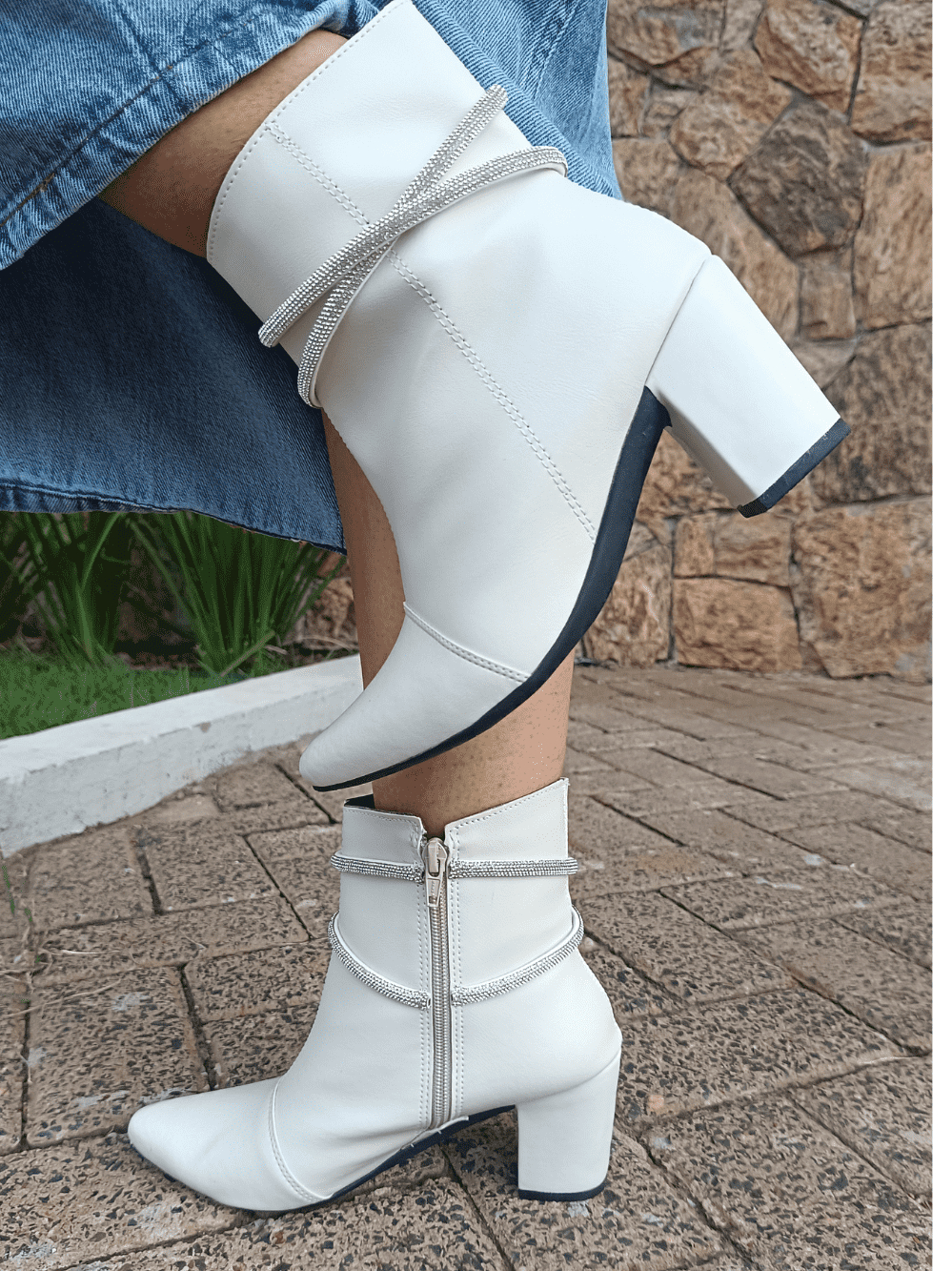 Bota Feminina Fashion Bico Fino com Tiras de Strass Salto Bloco Confortável Elegante
