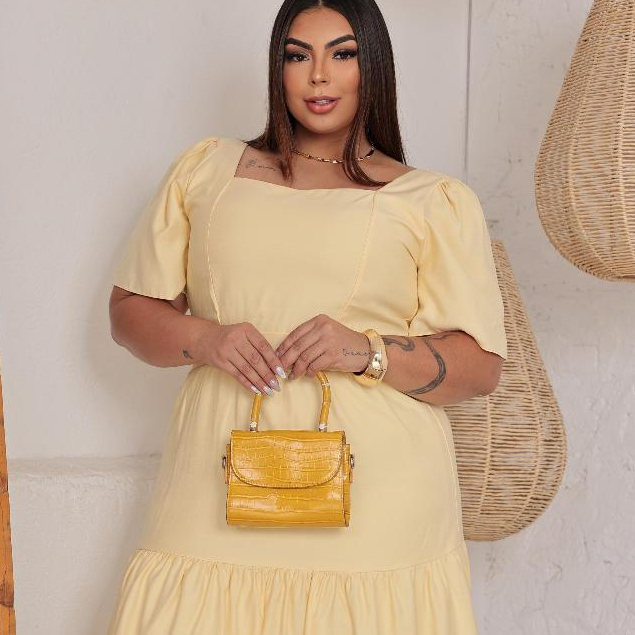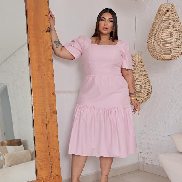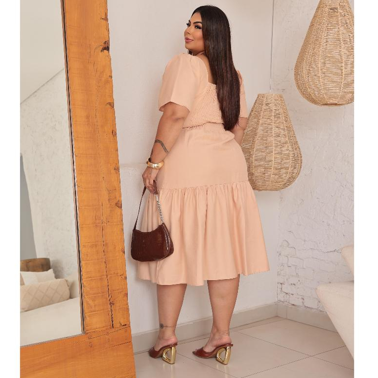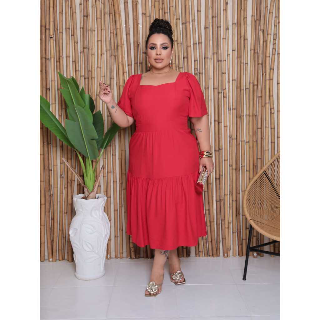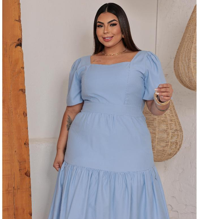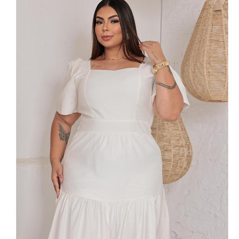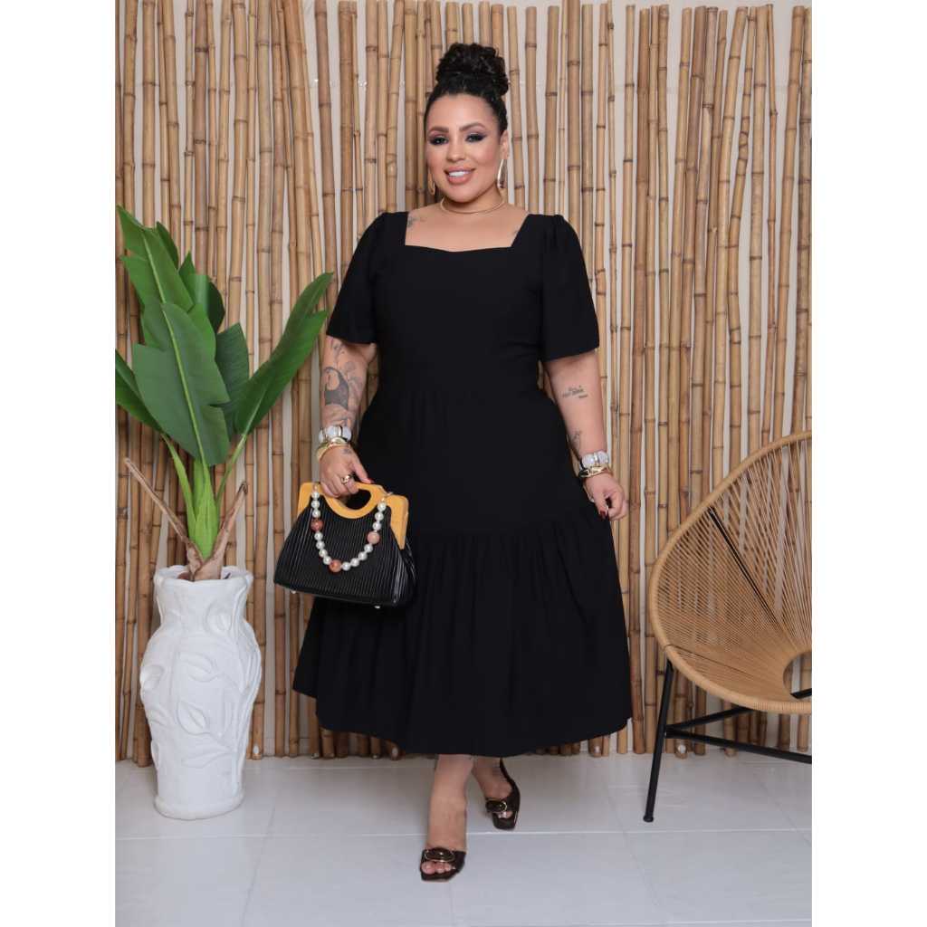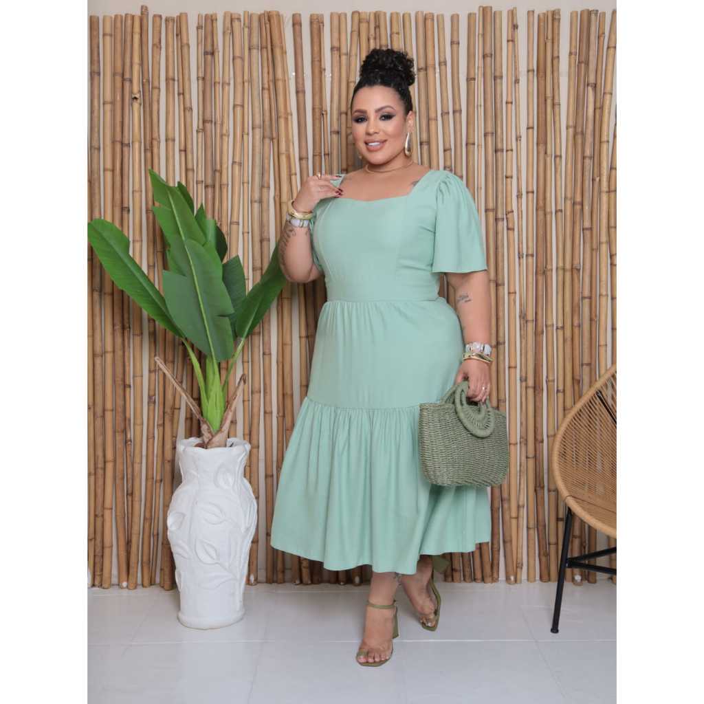 Vestido Midi Feminino Plus Size Veste Forro Sensorial Manga Bufante Decote Quadrado