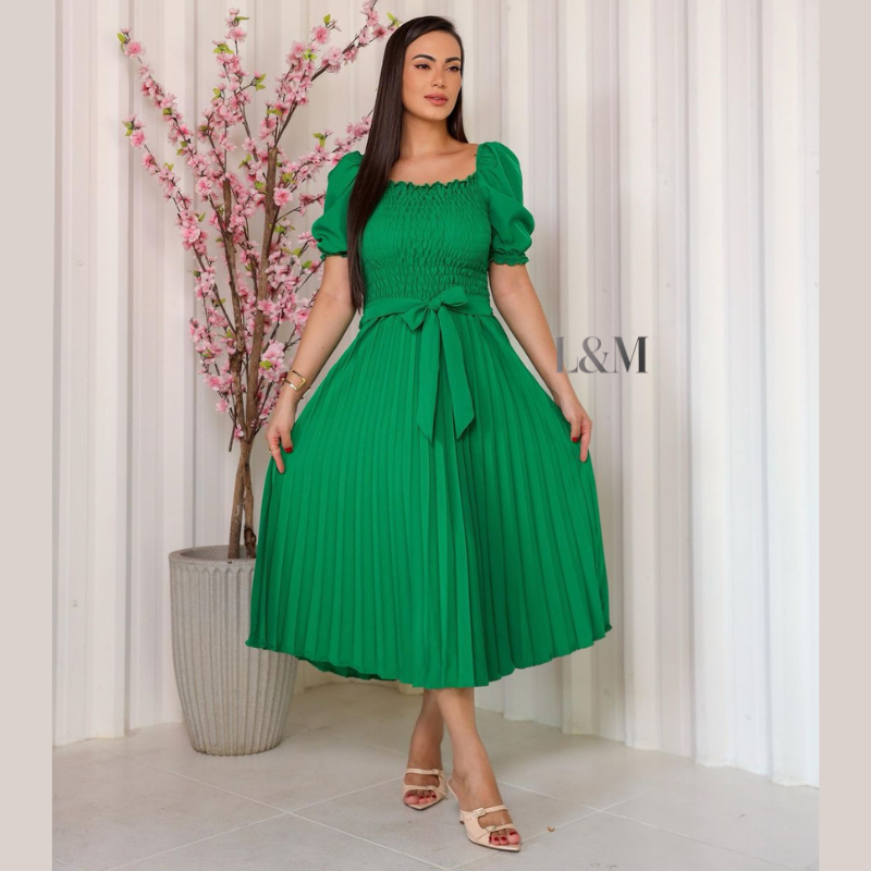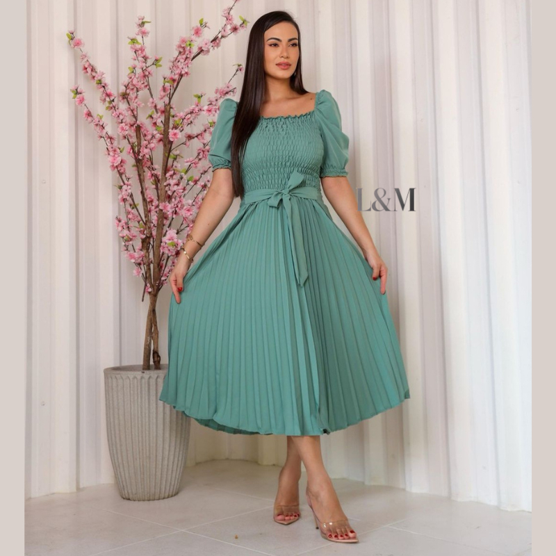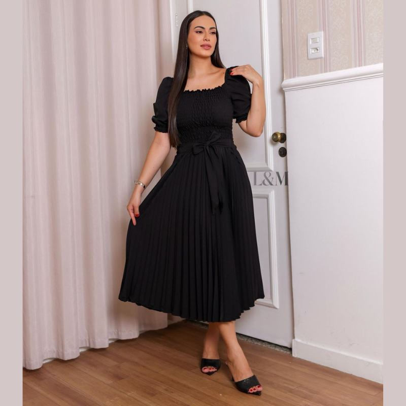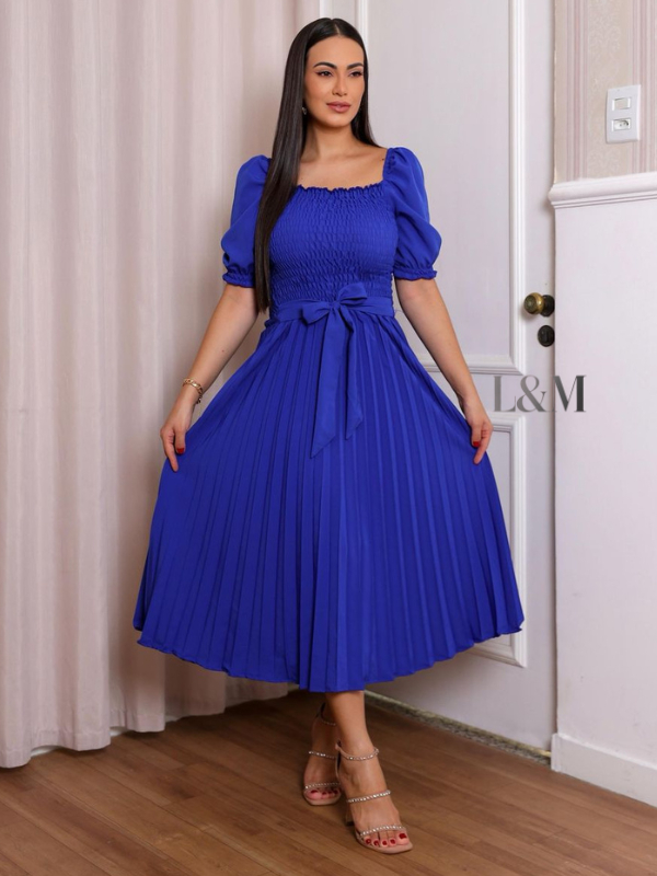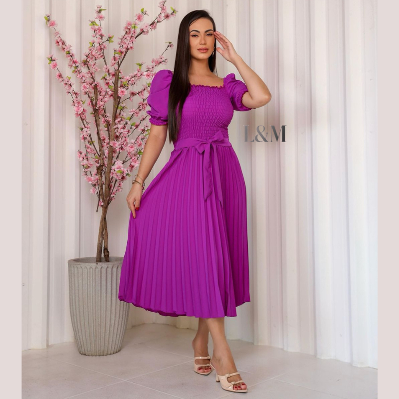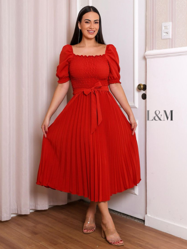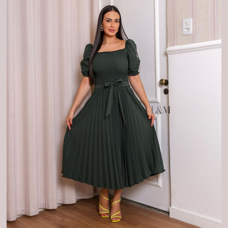 Vestido Plissado Liso Midi Feminino Plus Size Manga Bufante Curta com Elástex Moda Verão