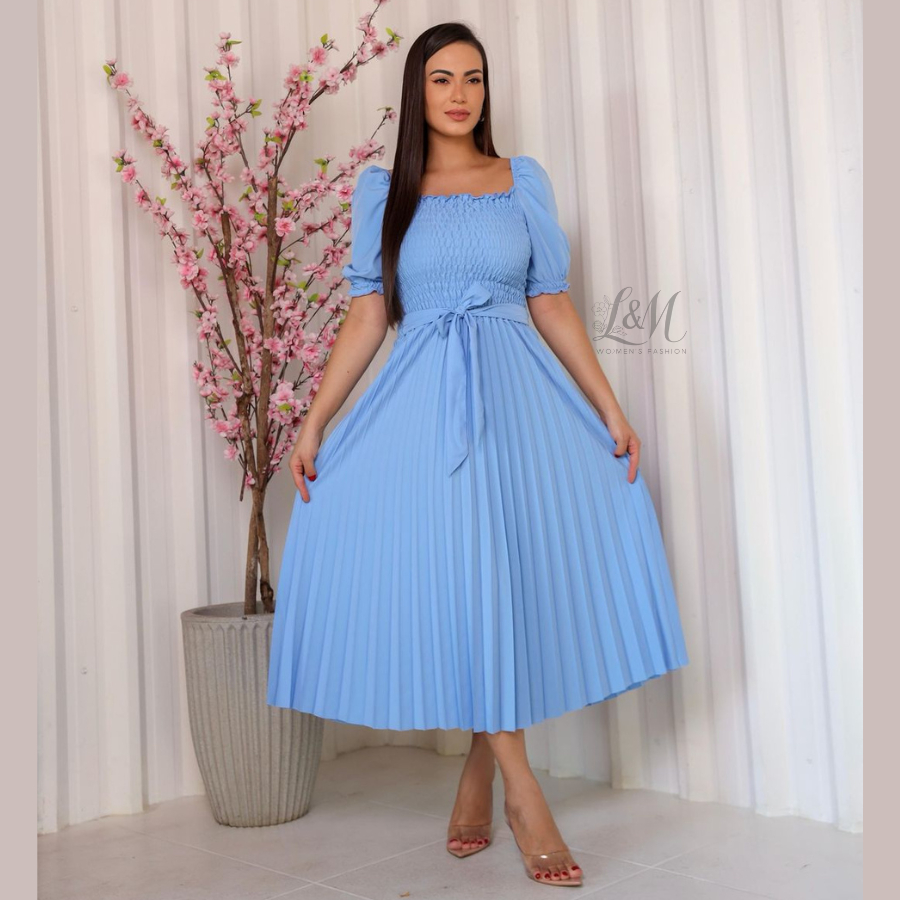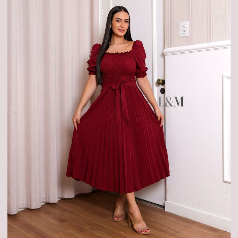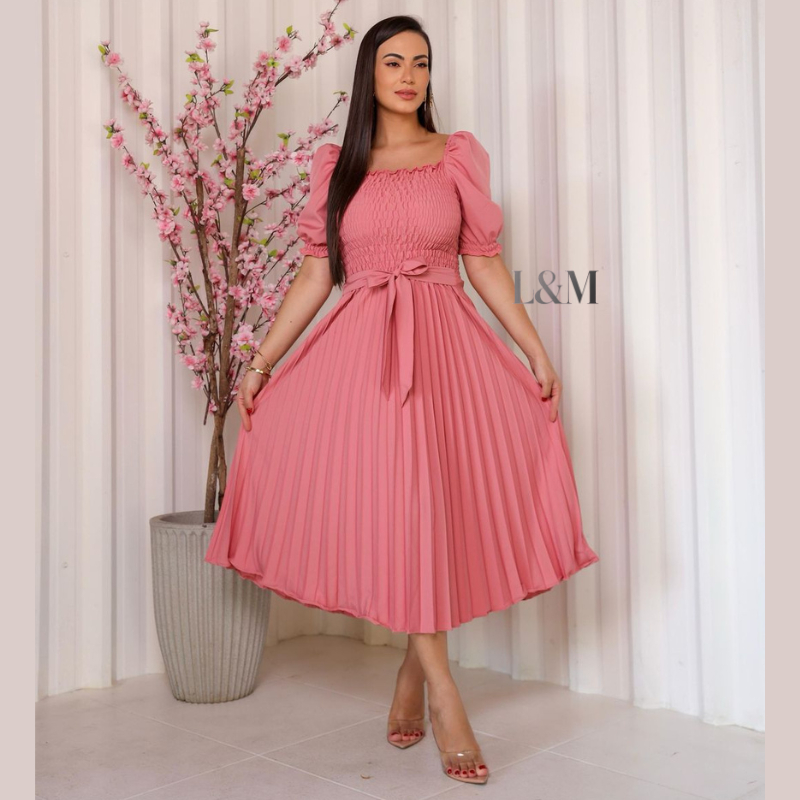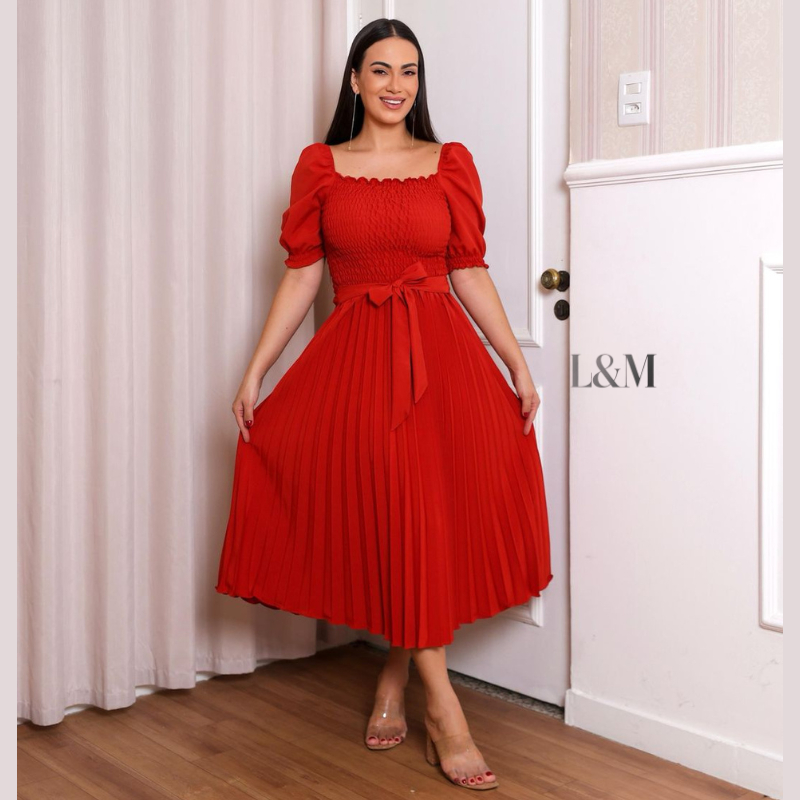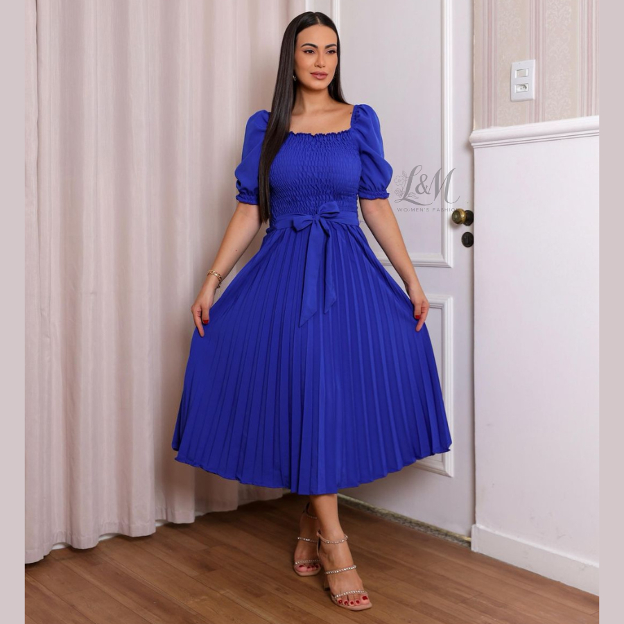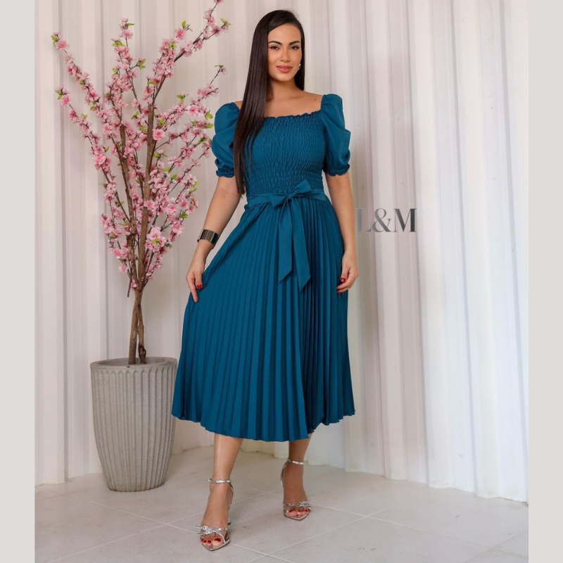 Vestido Plissado Liso Midi Feminino Plus Size Manga Bufante Curta com Elástex Moda Verão