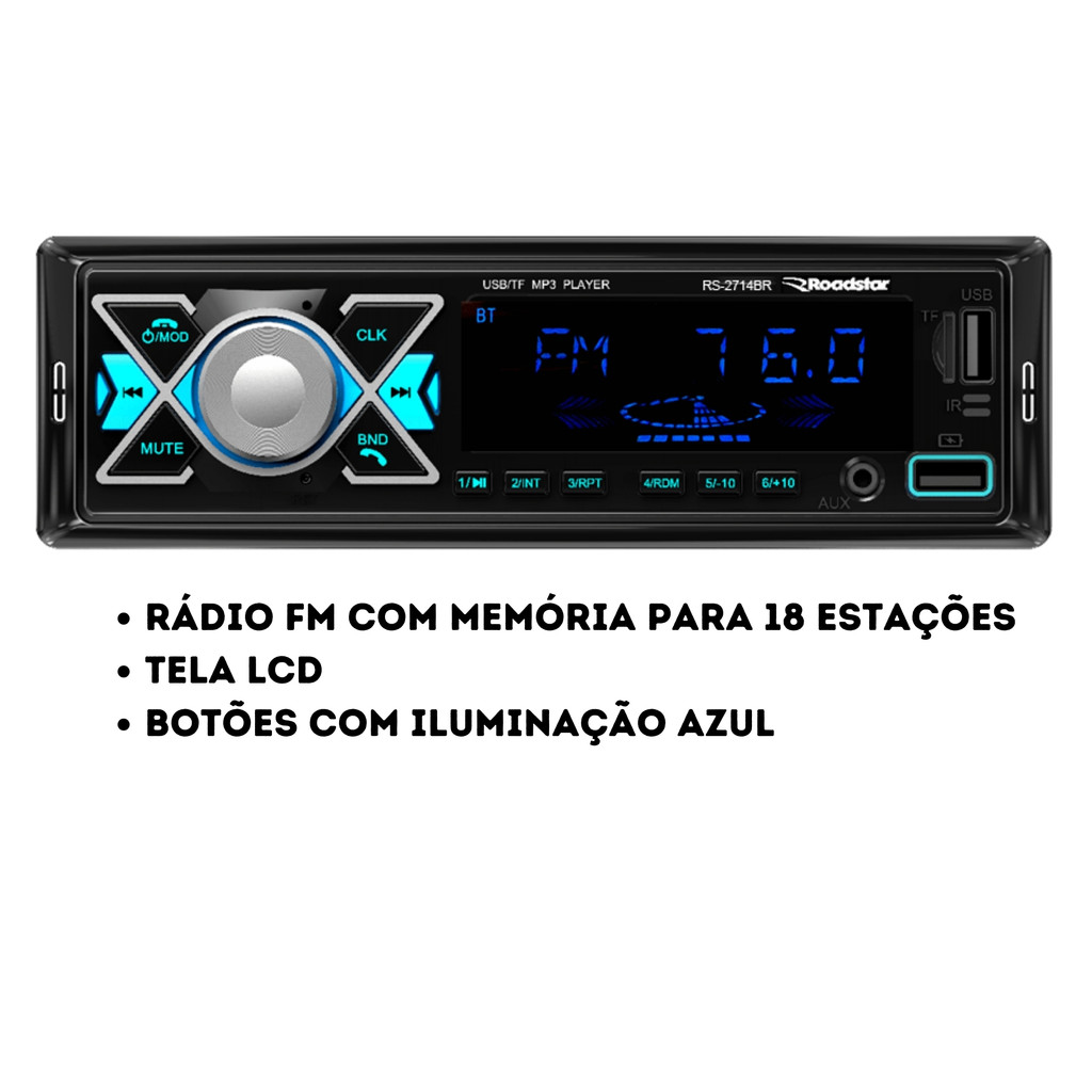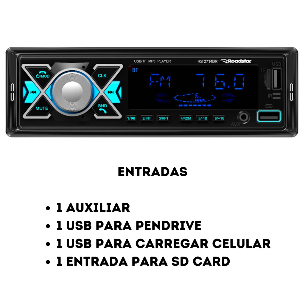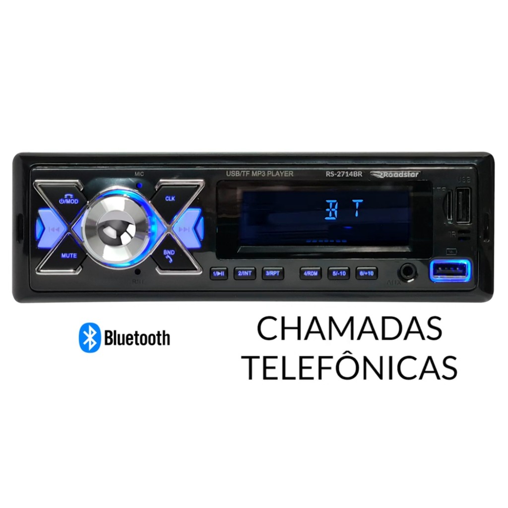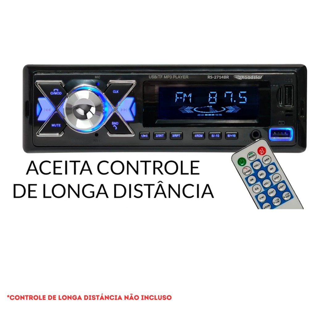 Auto Rádio Roadstar RS-2714BR Plus Som Carro Bluetooth USB Controle Automotivo 1 din Universal