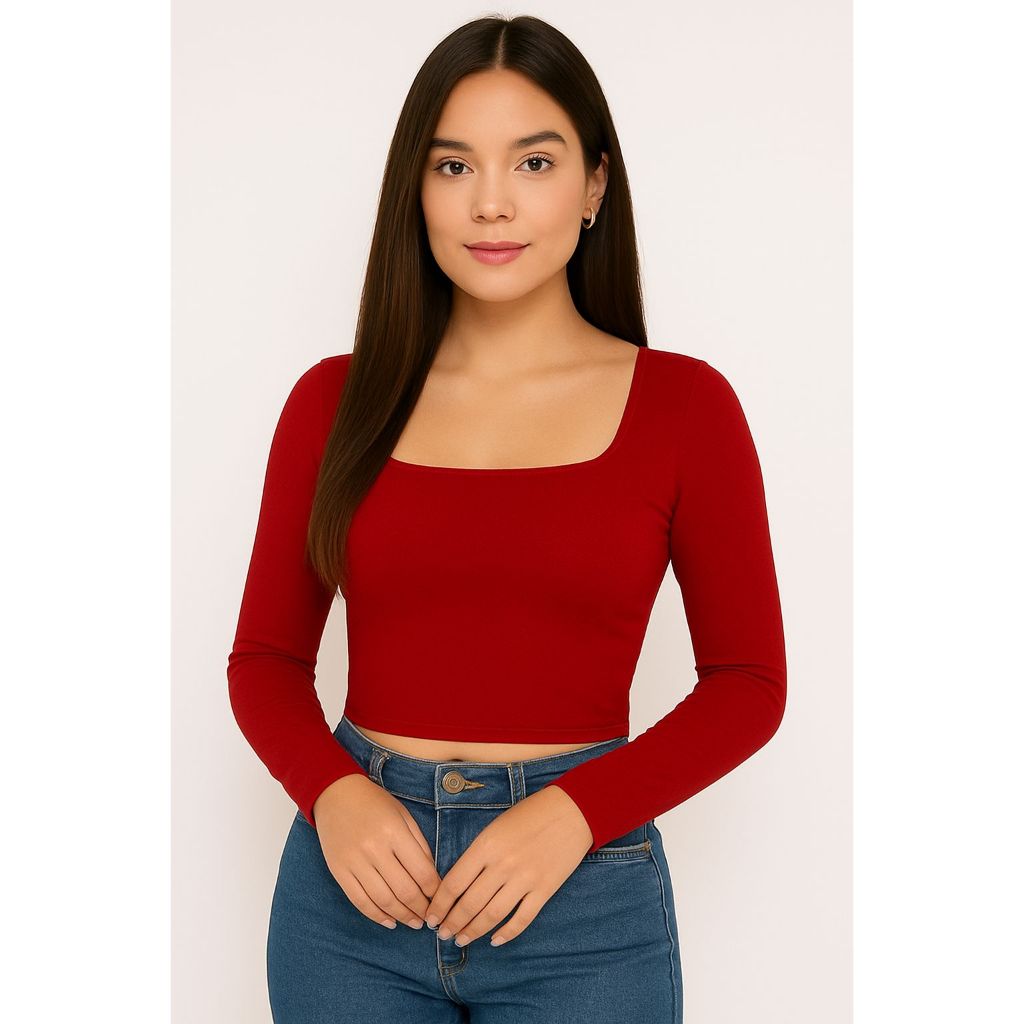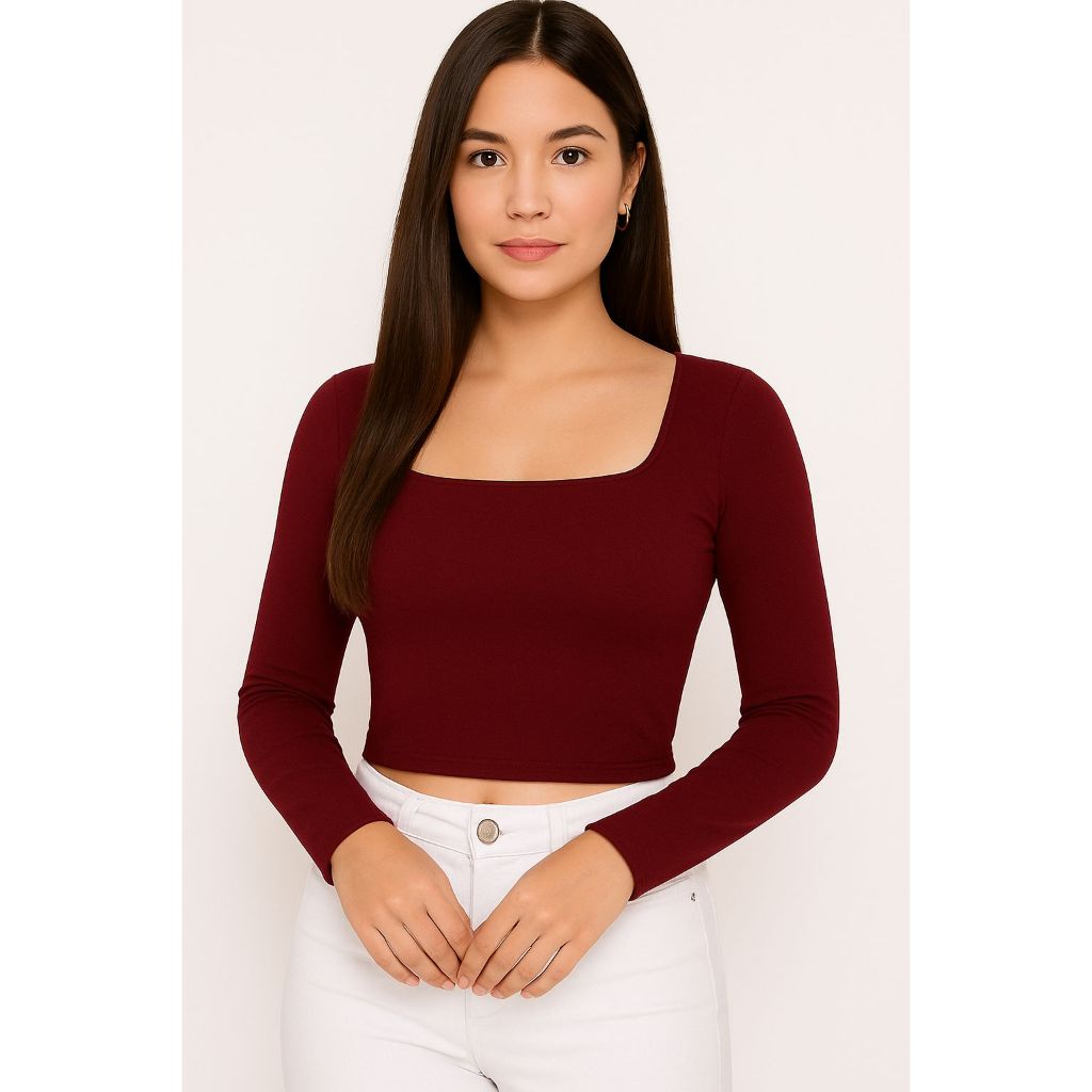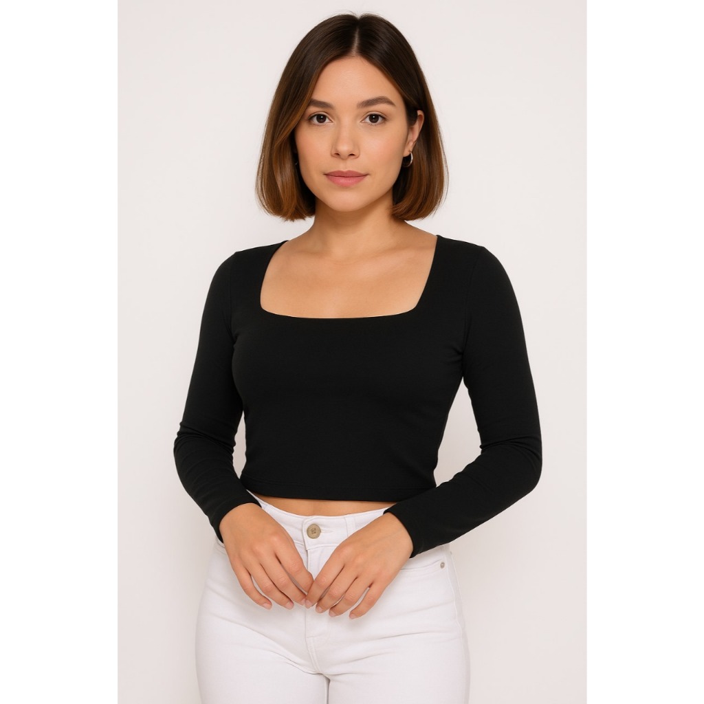Blusa Cropped Suplex Básico Liso Manga Longa Forrado Decote Quadrado