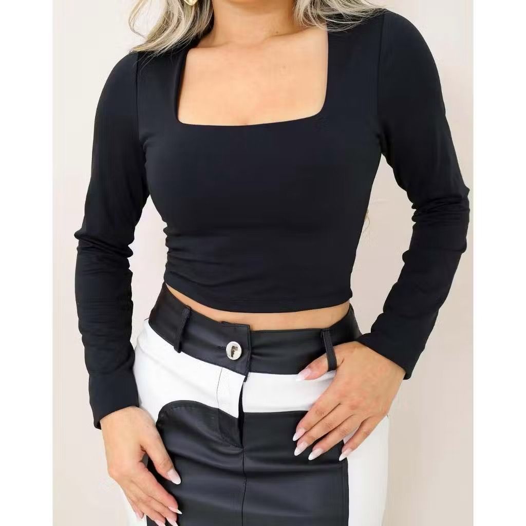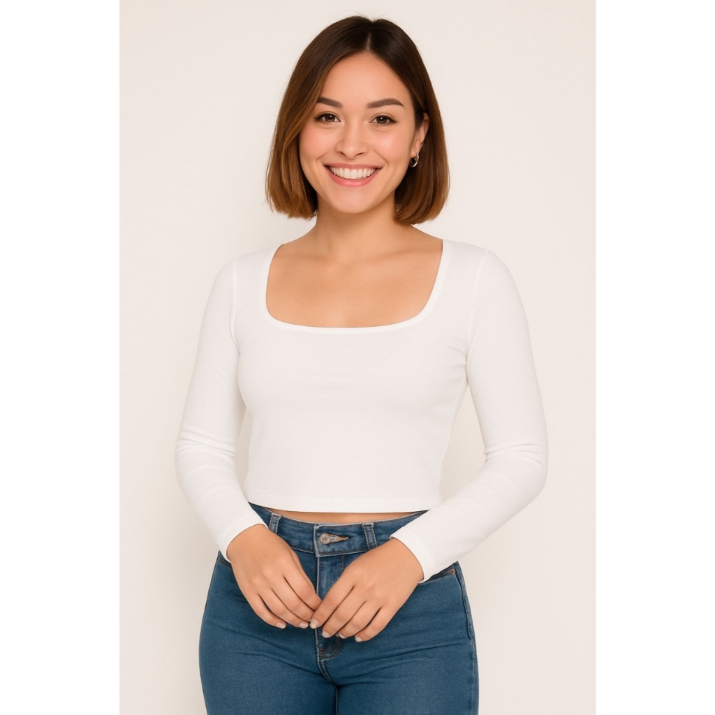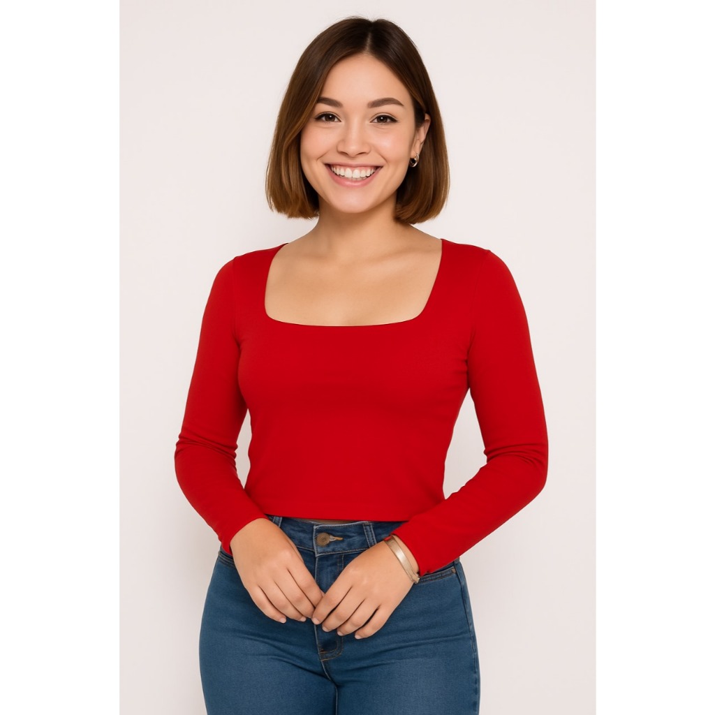 Blusa Cropped Suplex Básico Liso Manga Longa Forrado Decote Quadrado