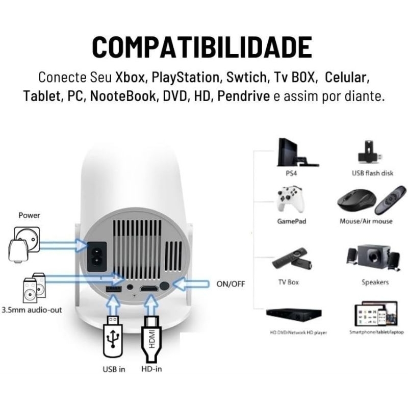 Projetor Multimídia Portátil T5, Projetor Led Espelhamento Celular 2500 Lúmens, Projetores de Vídeo 1080P Full HD LED