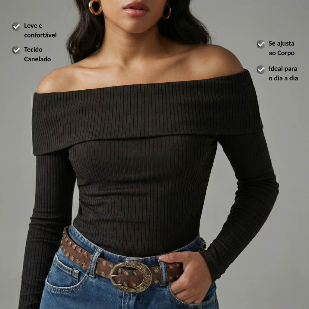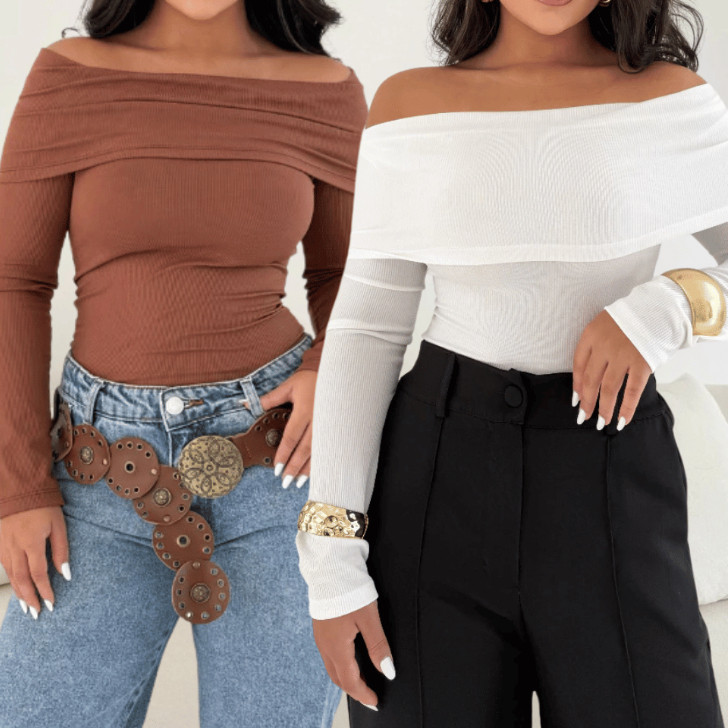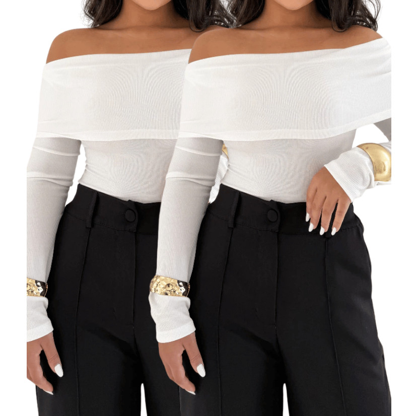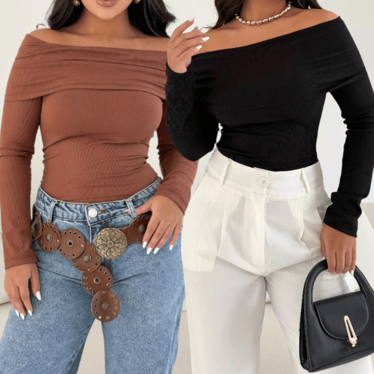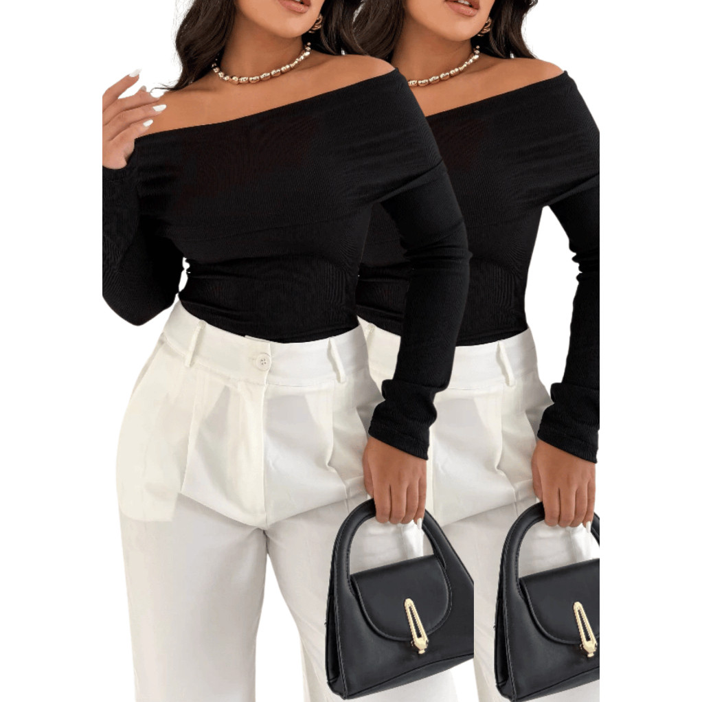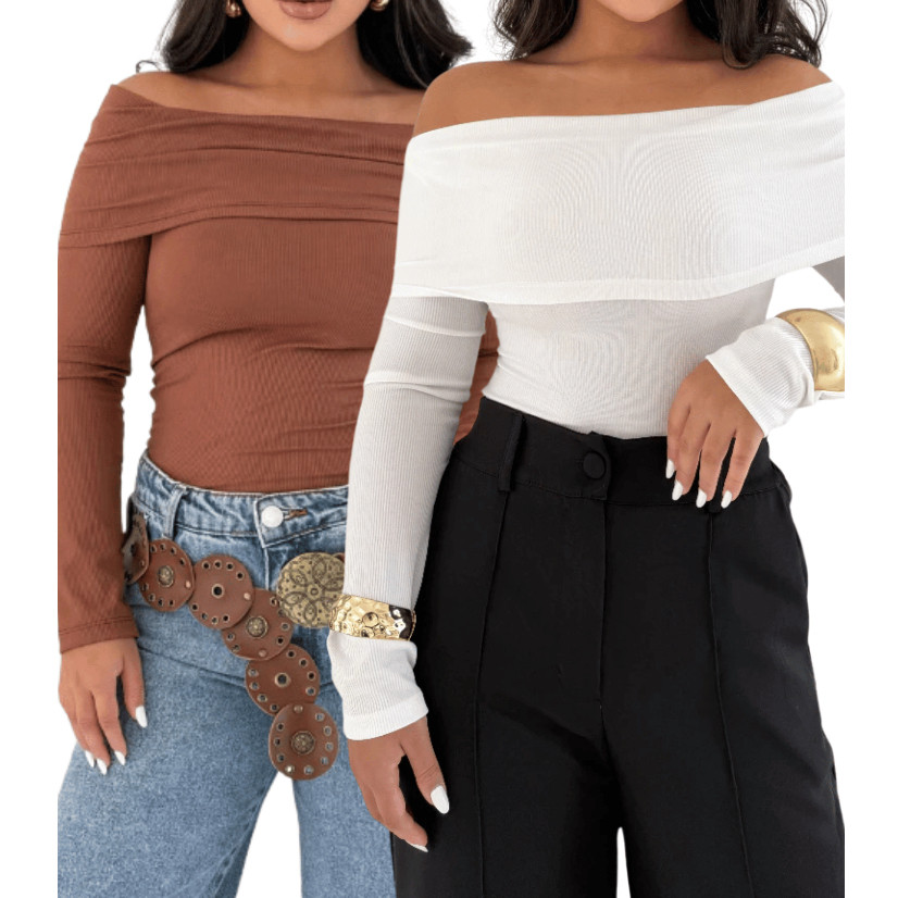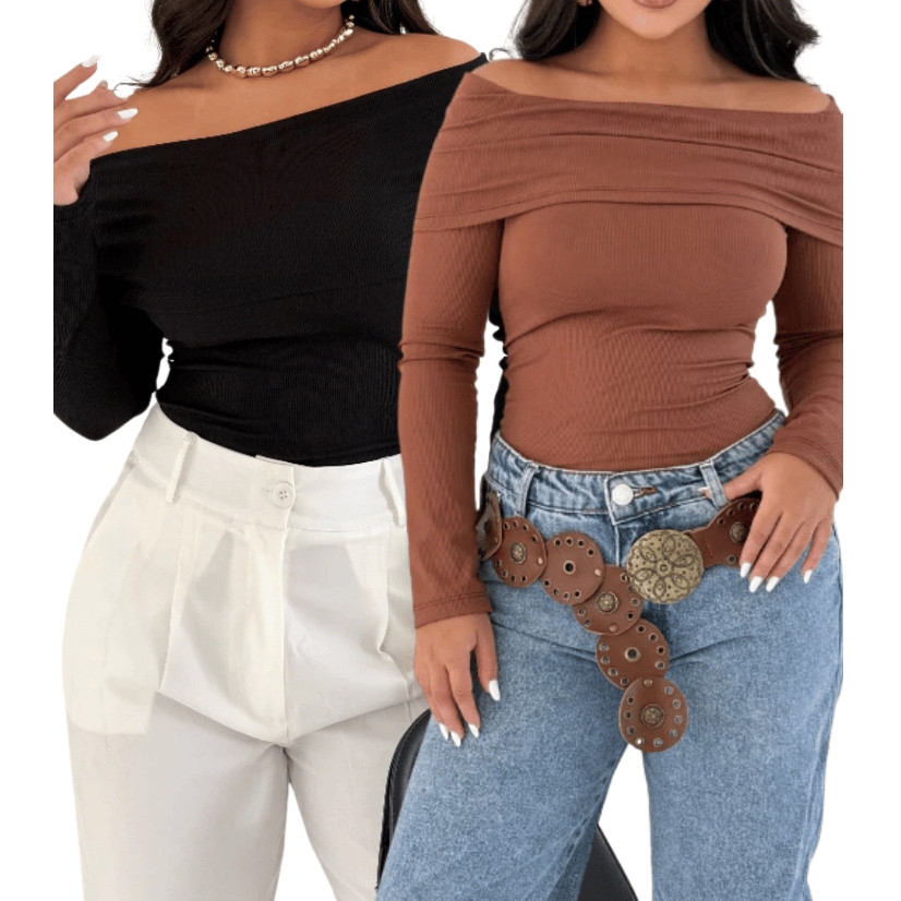 Blusa Decote Canoa Kit 2 Ombro Ombro Canelada Feminina Manga Longa Casual Elegante Tendencia Moderna