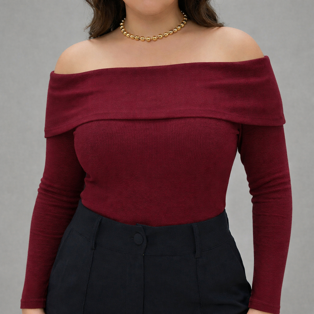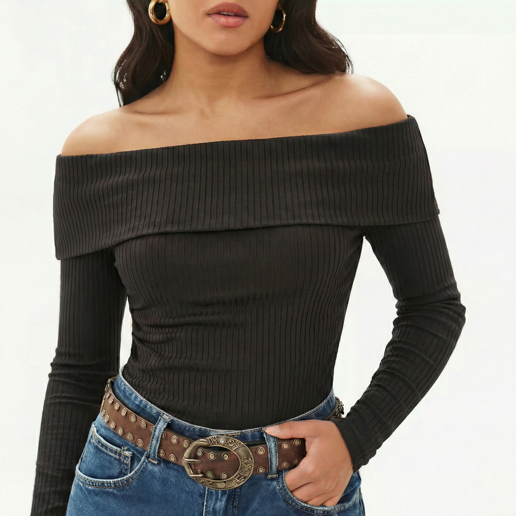 Blusa Ombro Ombro Canelada Elegante Manga Longa Babado Ribana Feminina Body Ciganinha Moda Exclusiva