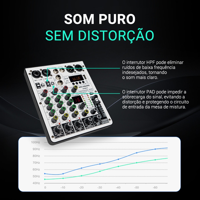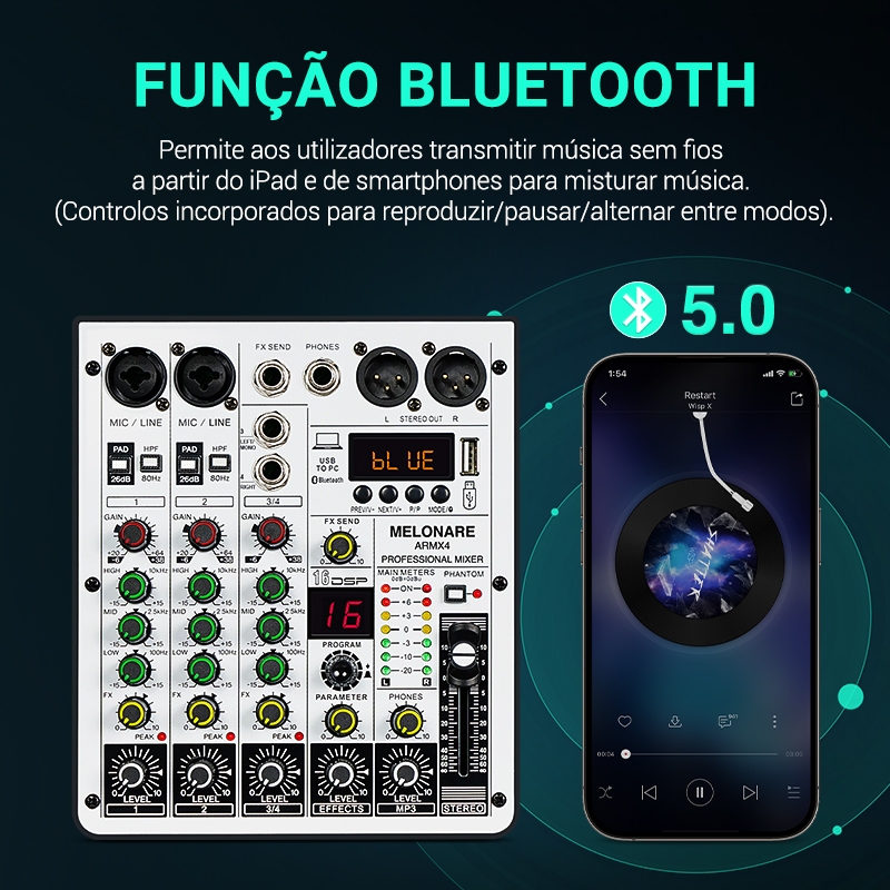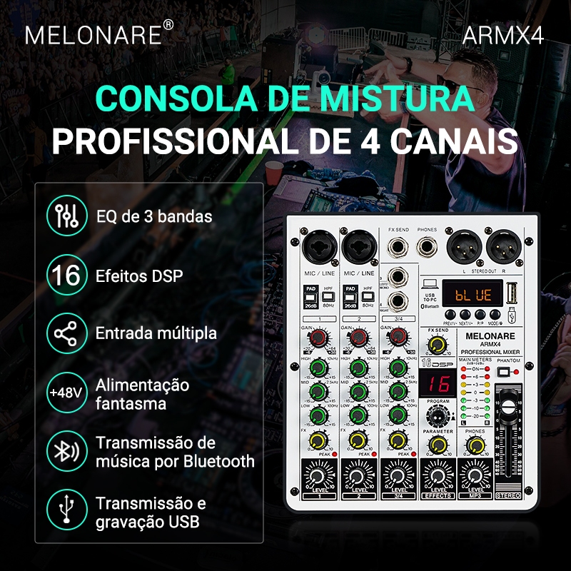 MELONARE ARMX-4 Mixer de áudio de 4 canais DJ Interface de áudio USB Função Bluetooth 16 efeitos DSP