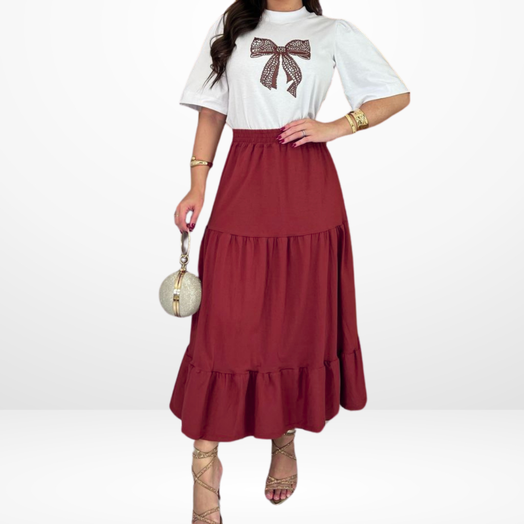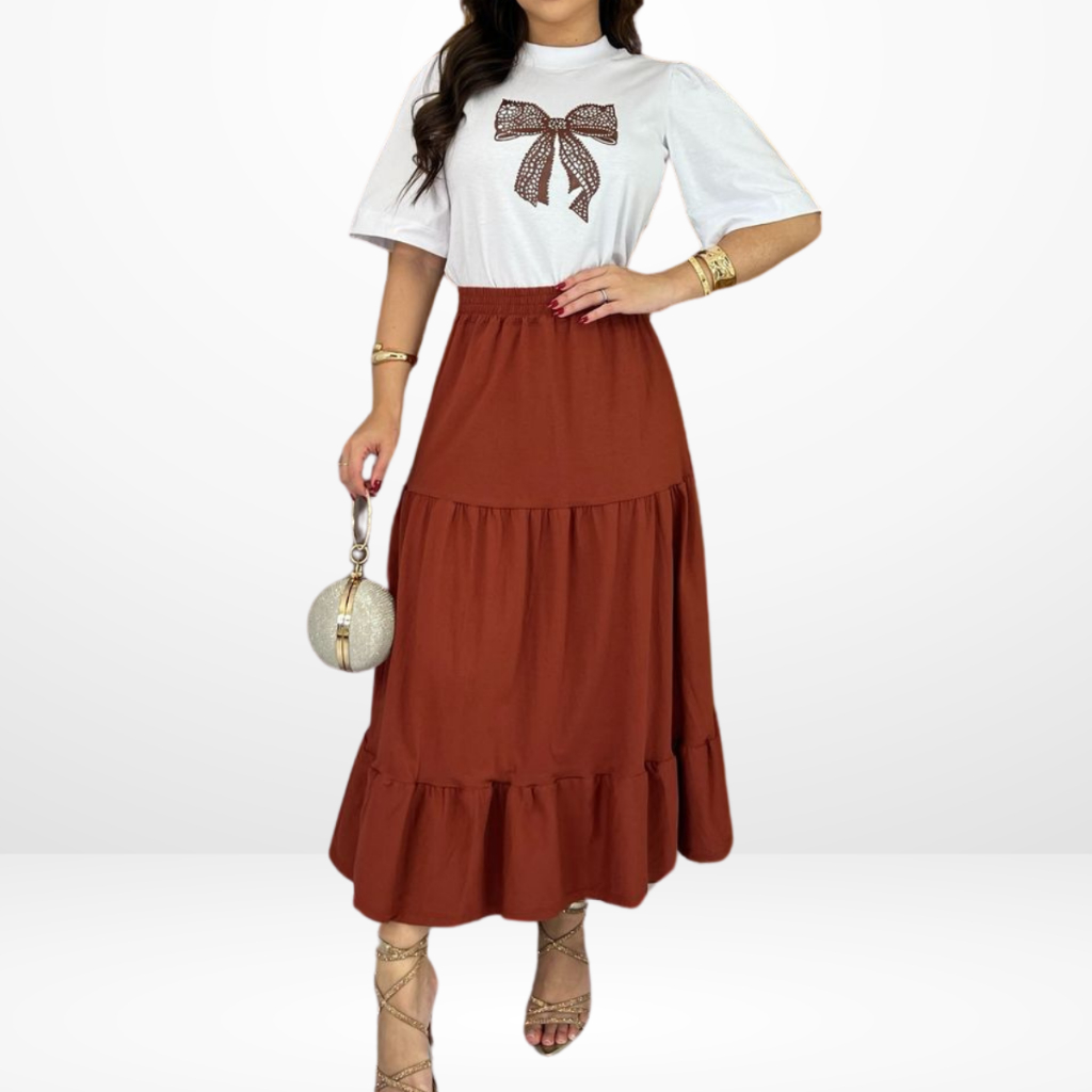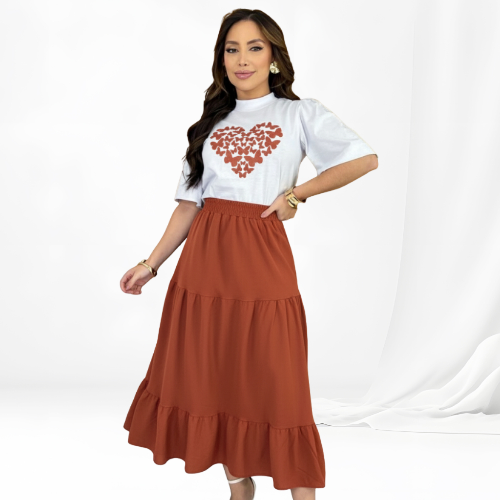 Conjunto Feminino Saia Midi + Blusa Tshirt - 100% Algodão Premium Blusa coração - Laço - Saia com elástico três Maria