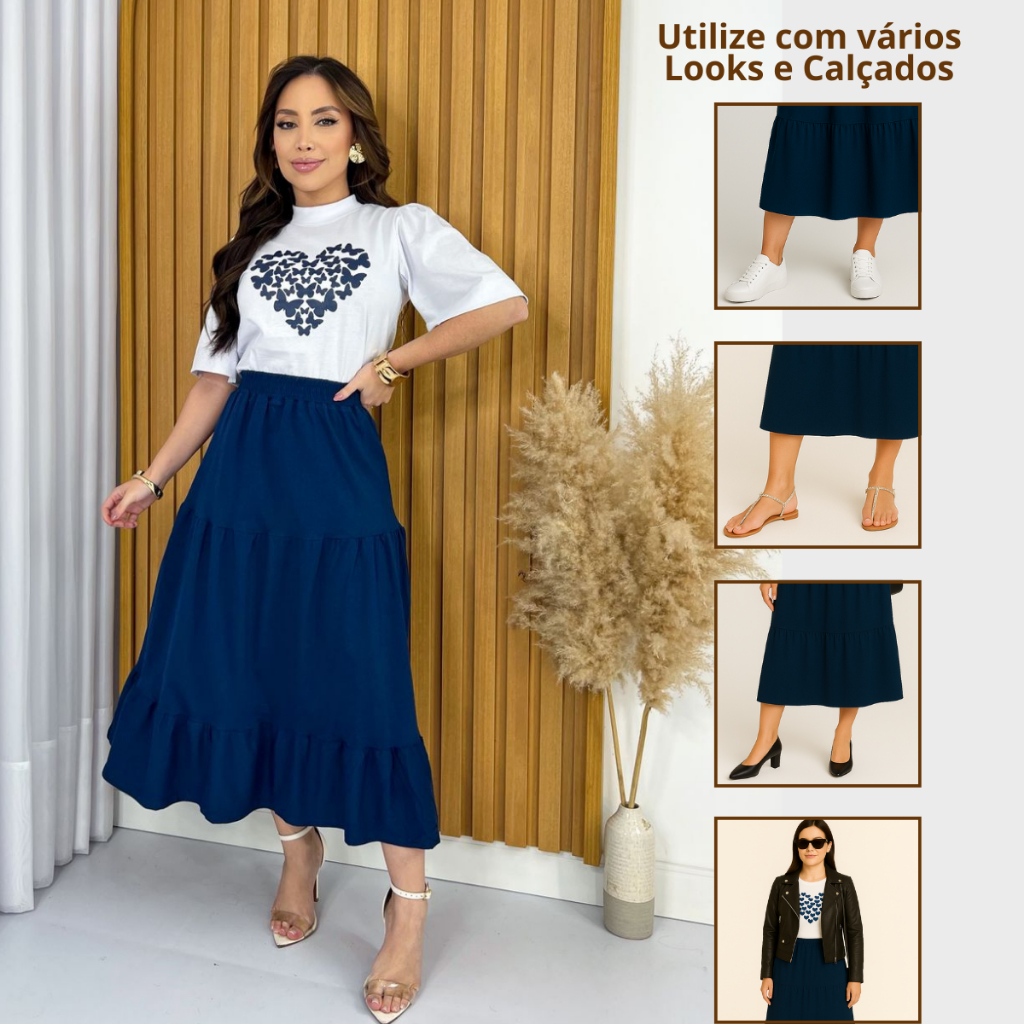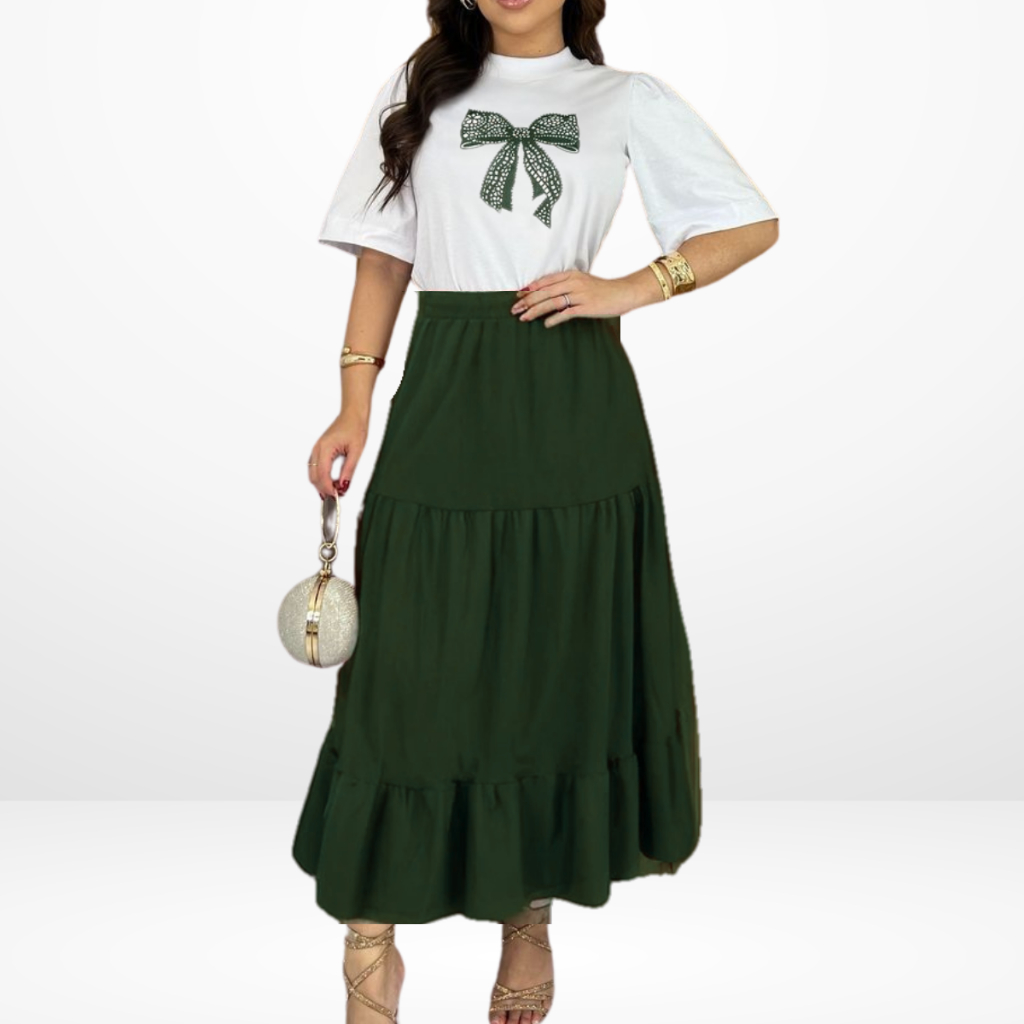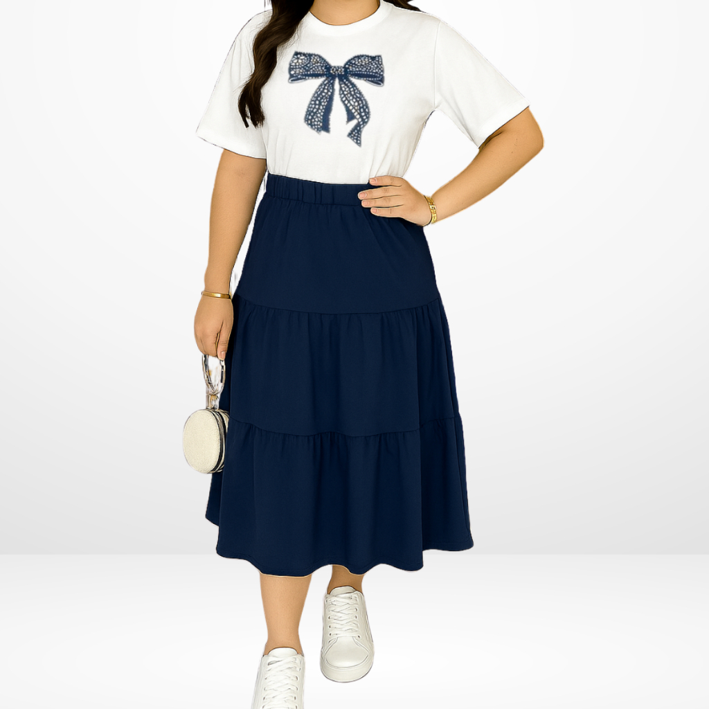 Conjunto Feminino Saia Midi + Blusa Tshirt - 100% Algodão Premium Blusa coração - Laço - Saia com elástico três Maria