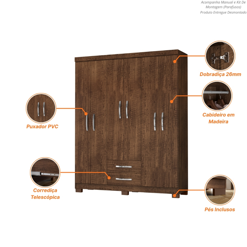 Kit Quarto Casal Completo Guarda Roupa 6 Portas Com Cômoda 5 Gavetas e Armário Multiuso Malbec