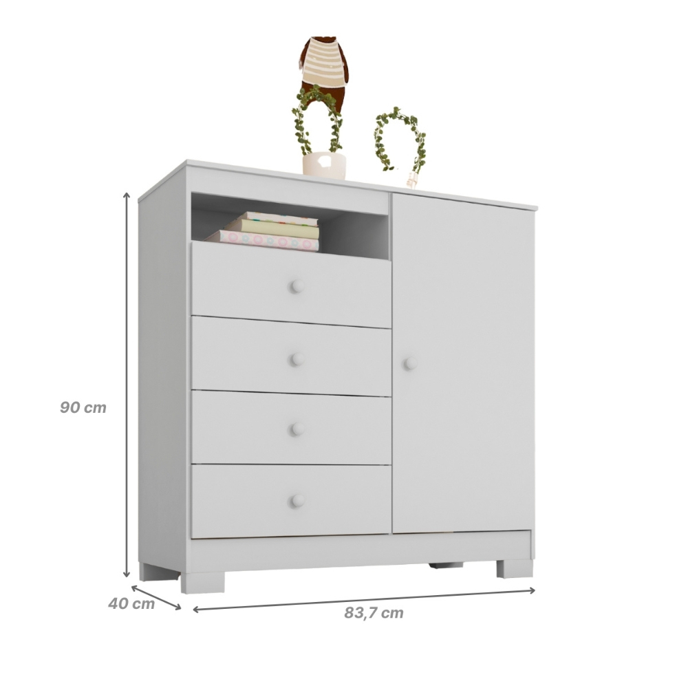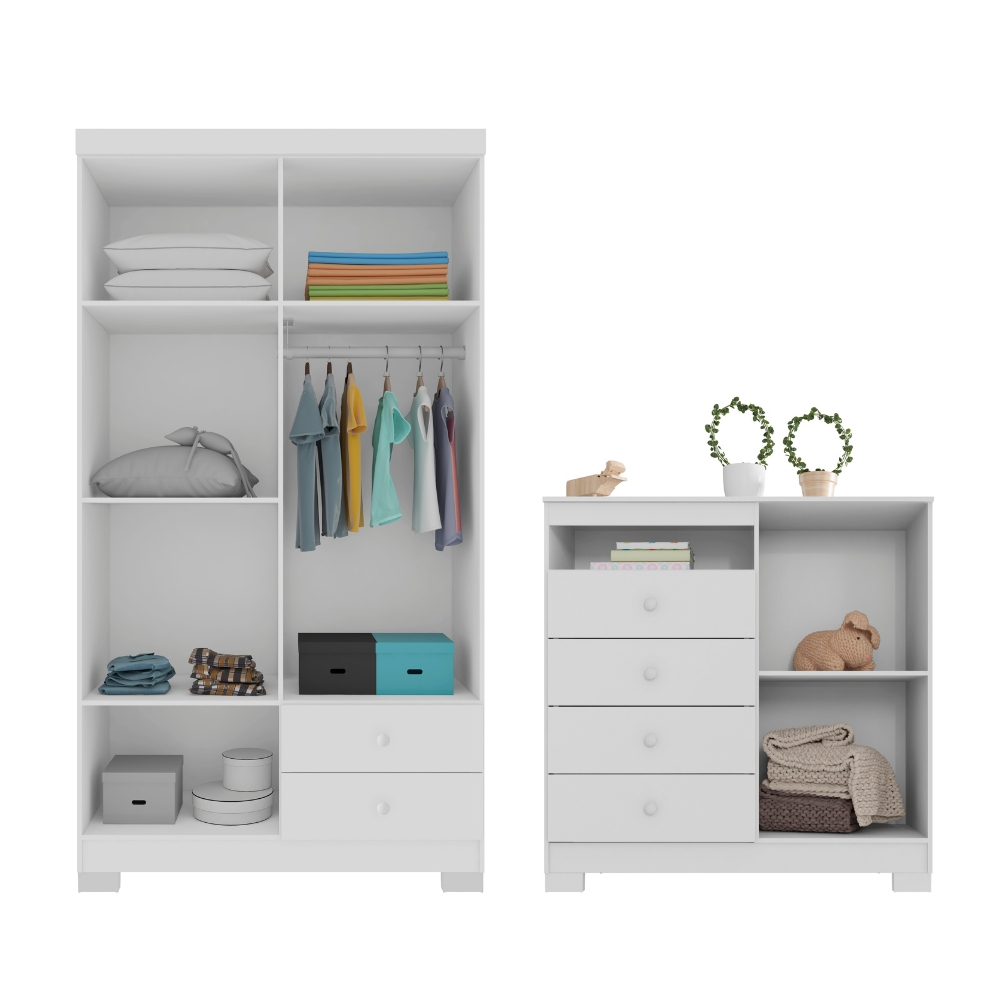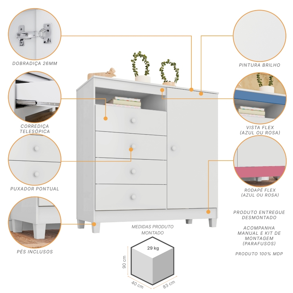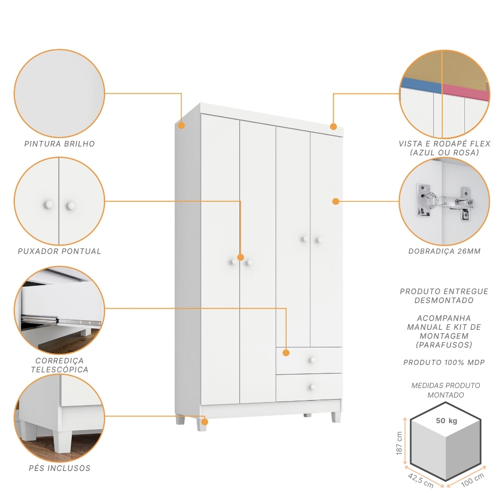 Guarda Roupa Infantil 4 Portas 2 Gavetas Com Cômoda 1 Porta 4 Gavetas Aquarela Branco Azul e Rosa Clique Chique Móveis