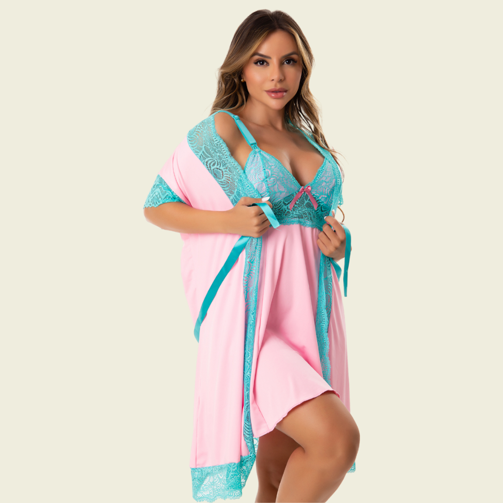 Kit Robe e Camisola Amamentação Pós Parto Bicolor Com Renda de Dormir Maternidade Gestante