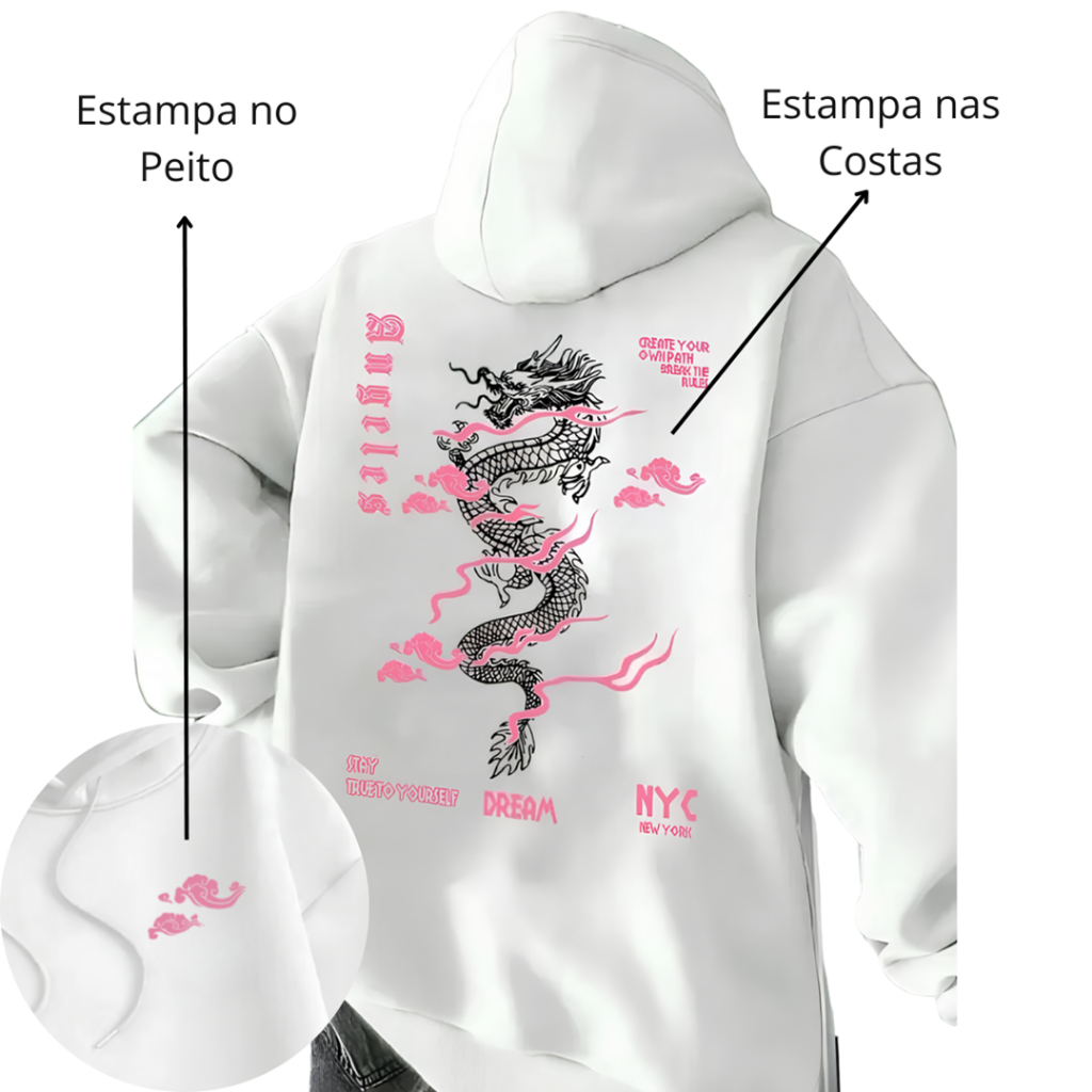 Moletom Unissex Canguru Capuz Estampado Inverno Flanelado Look Algodão Casual Quentinho Dragão