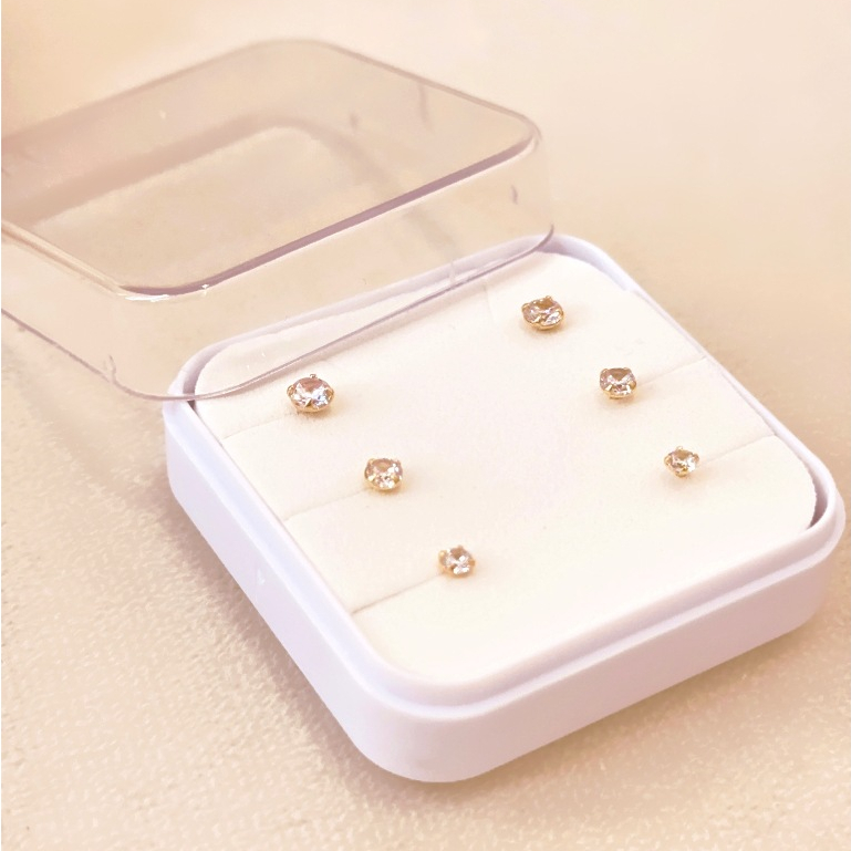 Caixinha com Trio de Brincos Infantis Zircônia P, M e G Folheado a Ouro 18K-Hipoalergênico com Tarraxa Baby de Segurança