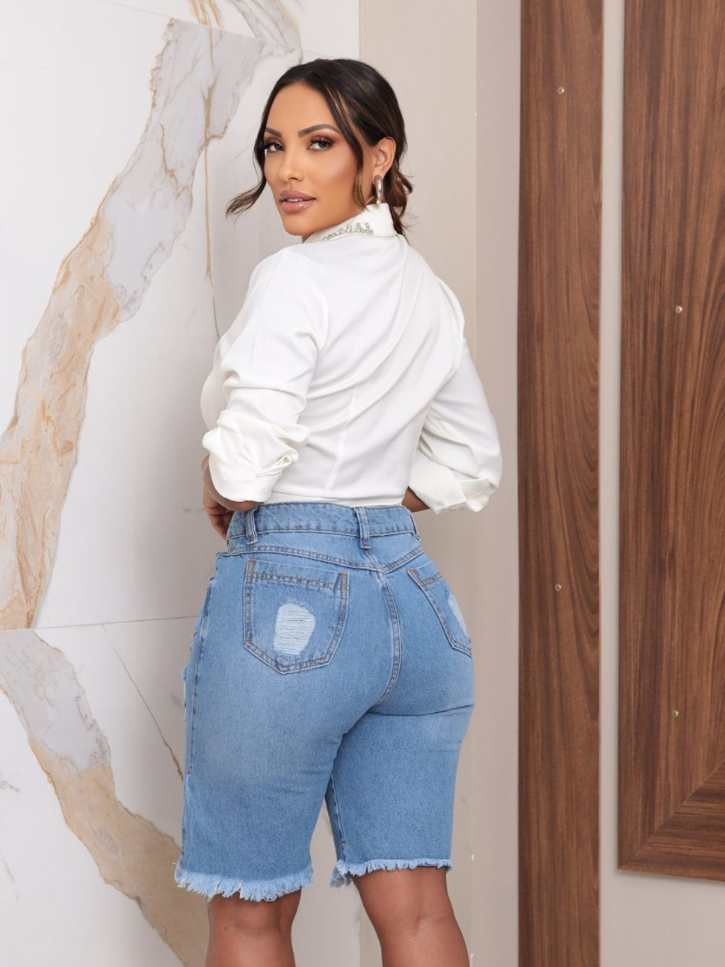 Bermuda Jeans Feminina Jorts Cintura Alta 100% Algodão Barra Desfiada Shorts Jeans Shorts Ciclista