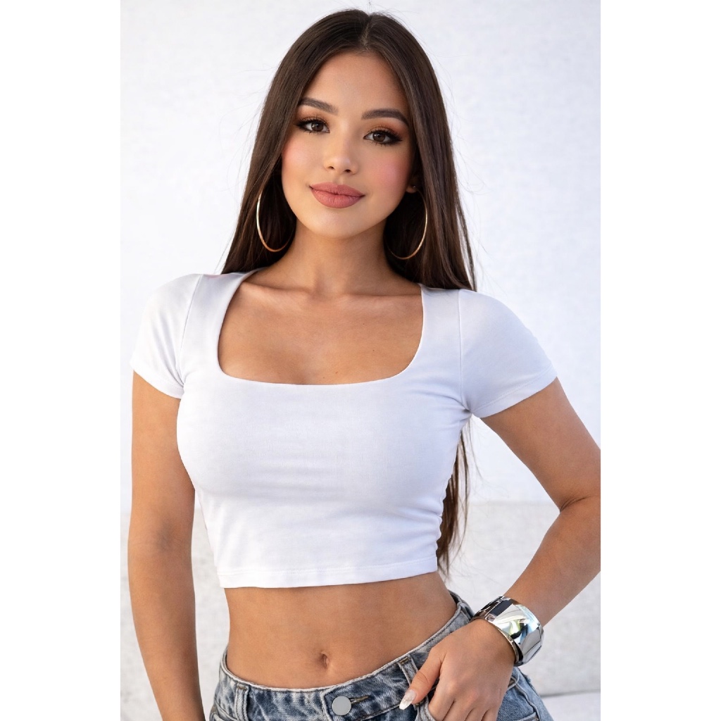 Cropped Gola Quadrada Decote Feminino Manga Curta Croped Básico Suplex Tamanho Unico