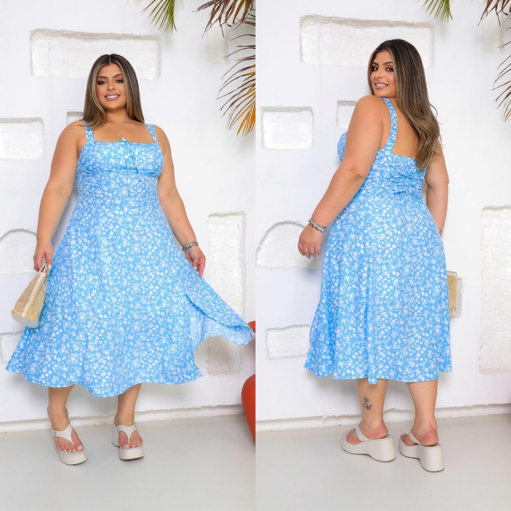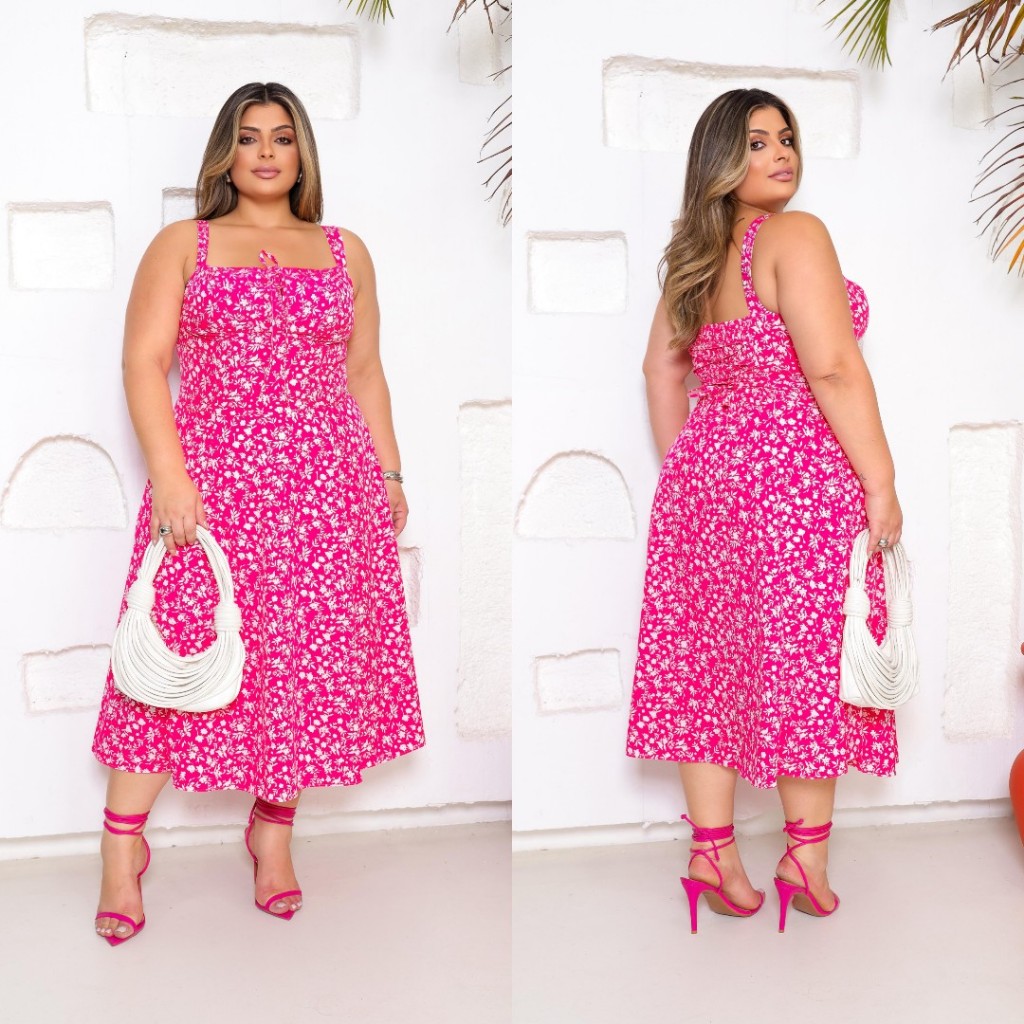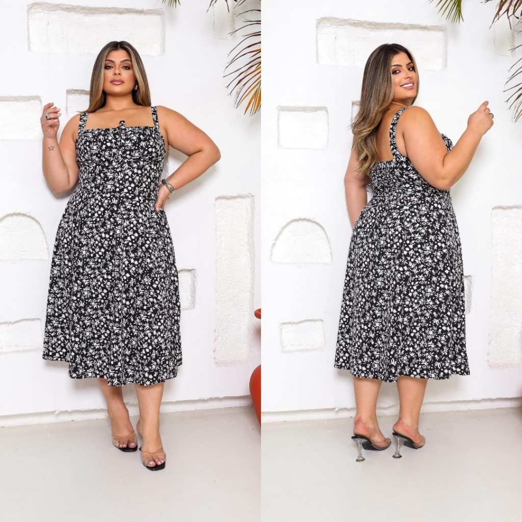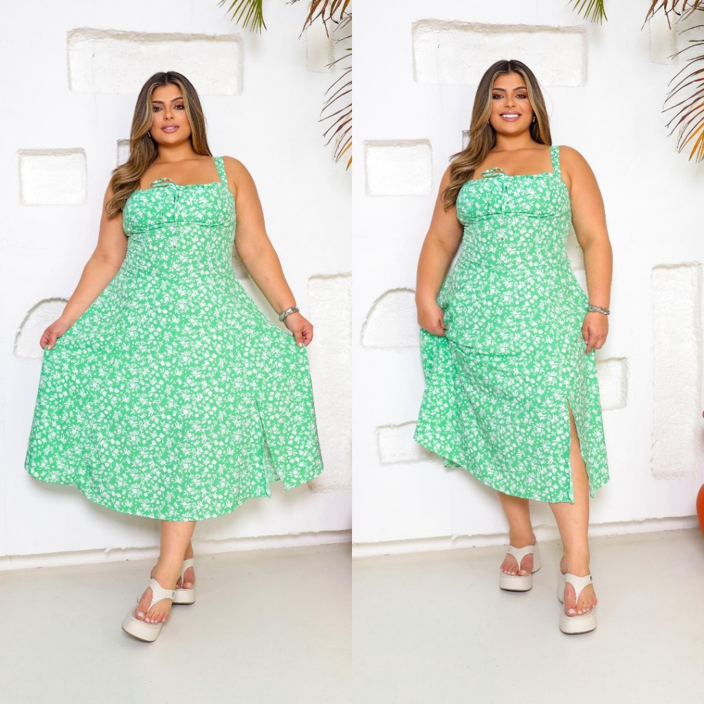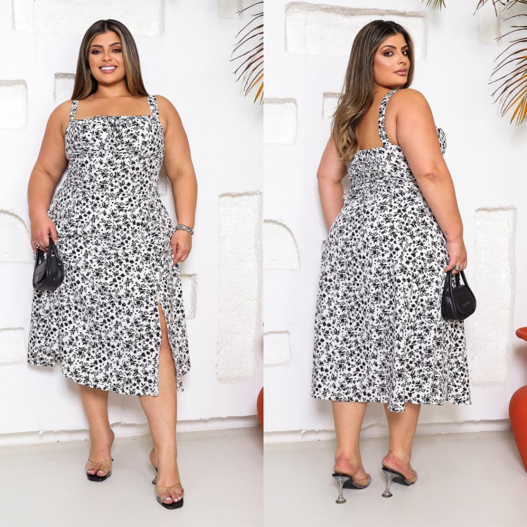 Vestido Camponesa Mídi Plus Size, Feminina, Estampa Floral com Elastex nas Costas, com Fenda frontal