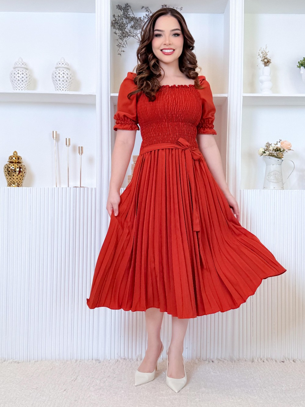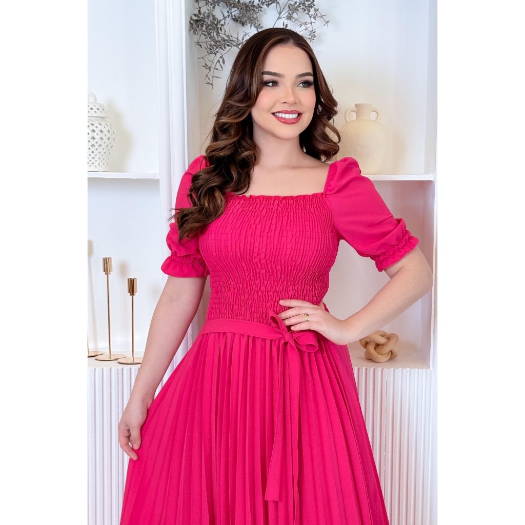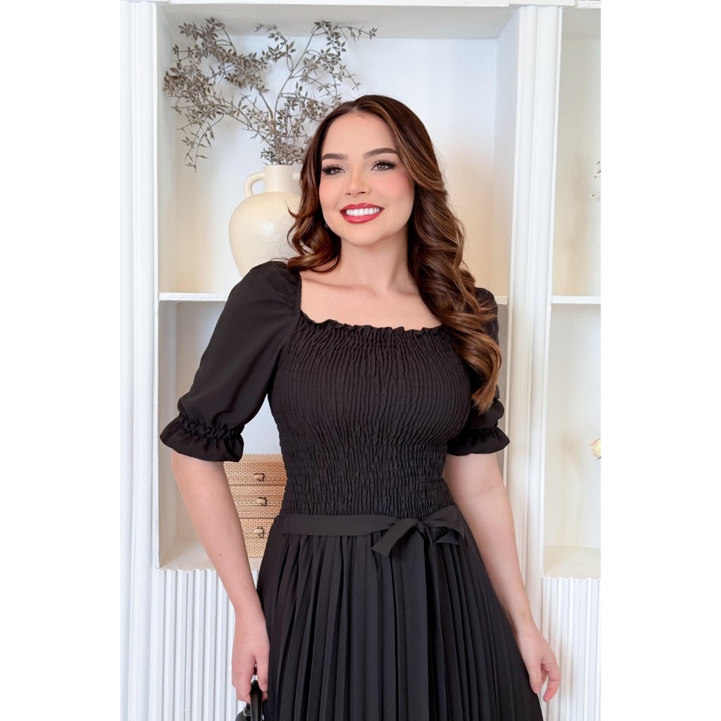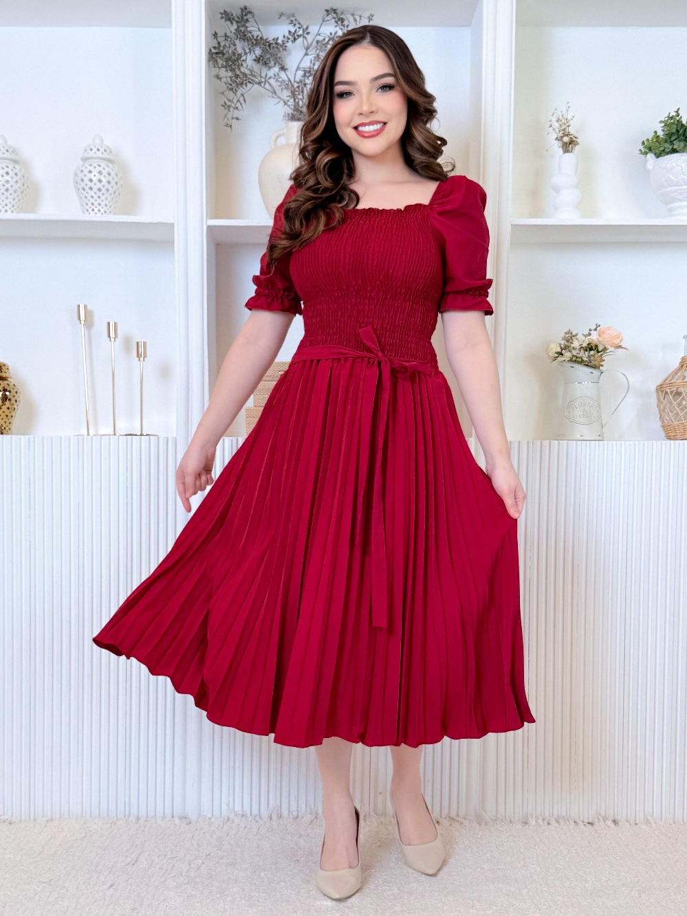 Vestido Feminino Midi Plissado Lisa, Manga Bufante Cintura Alta com Elastex e Cinto, Moda Evangélica