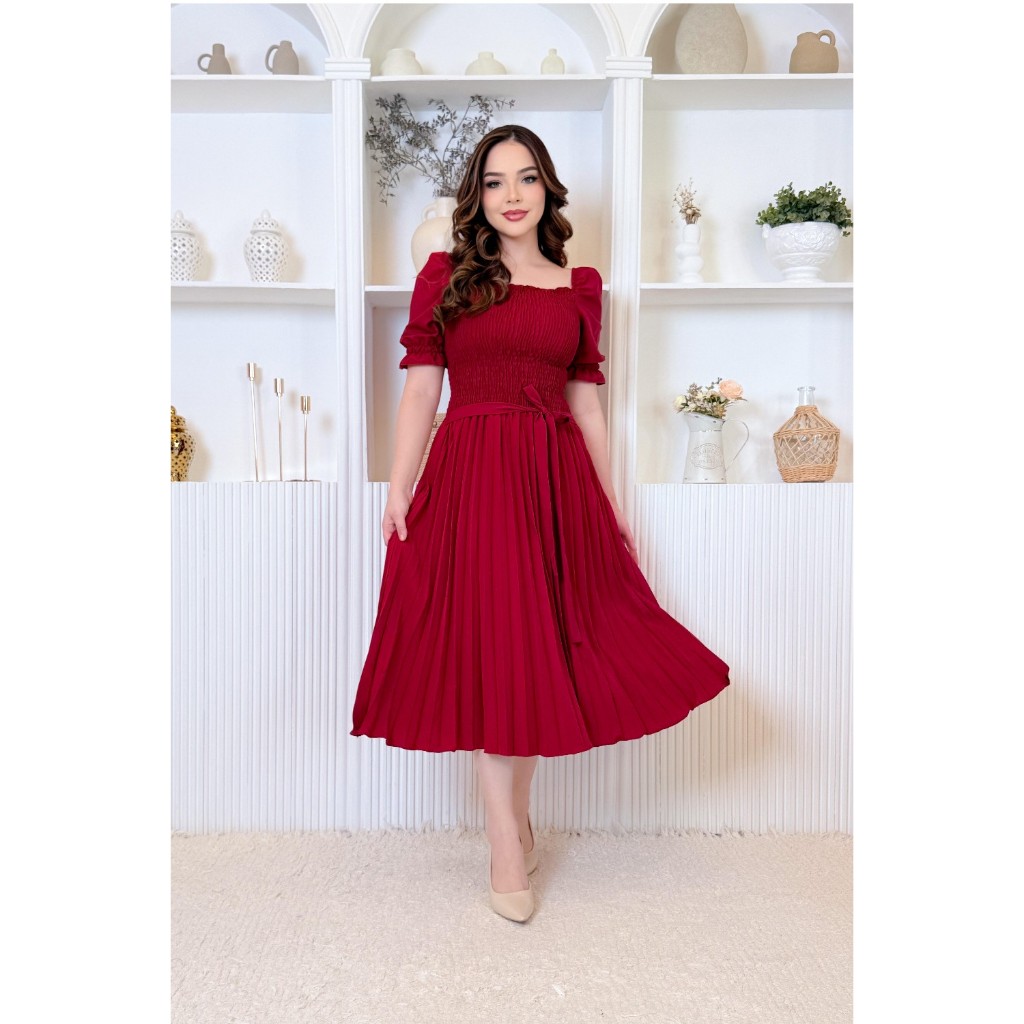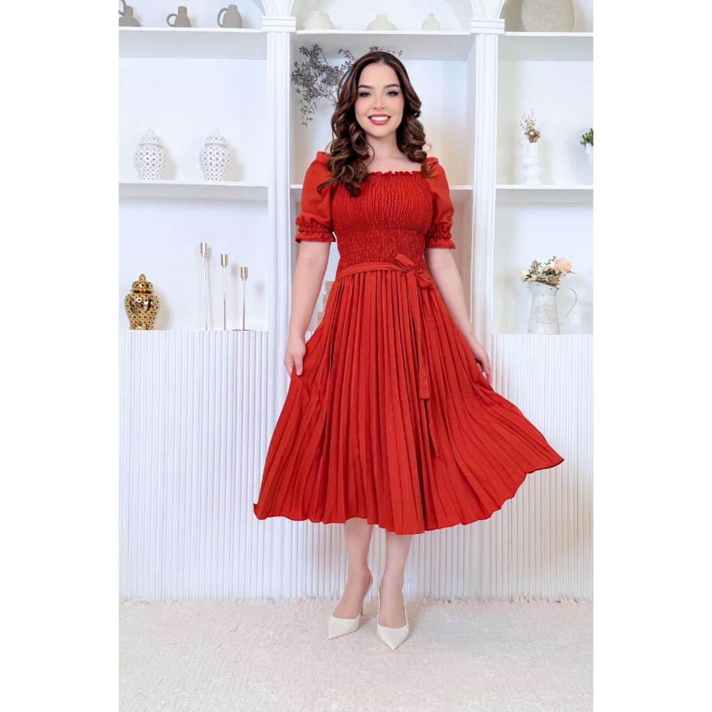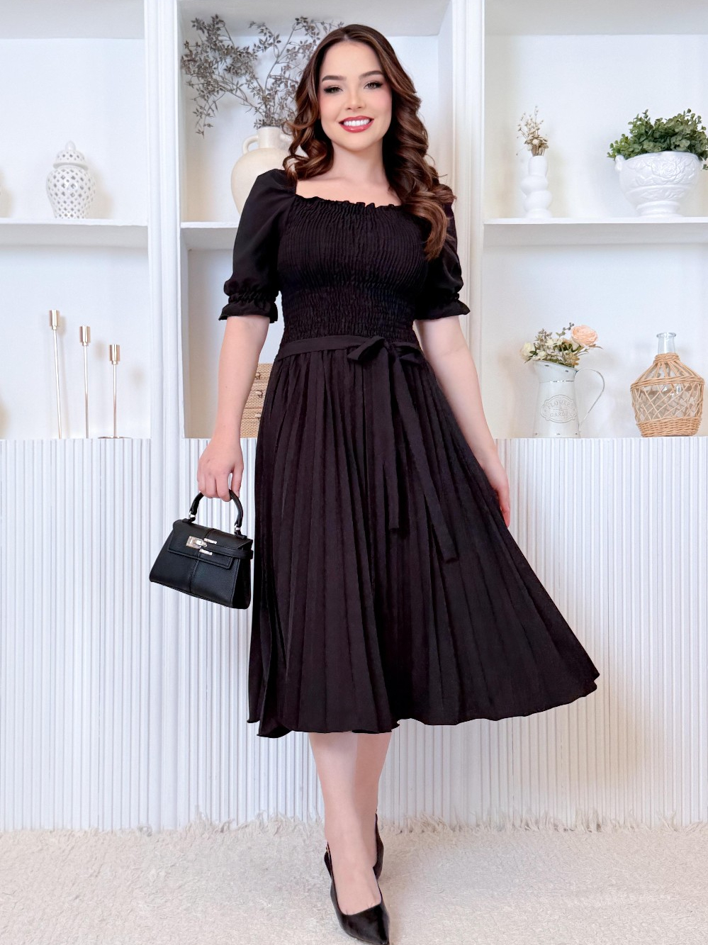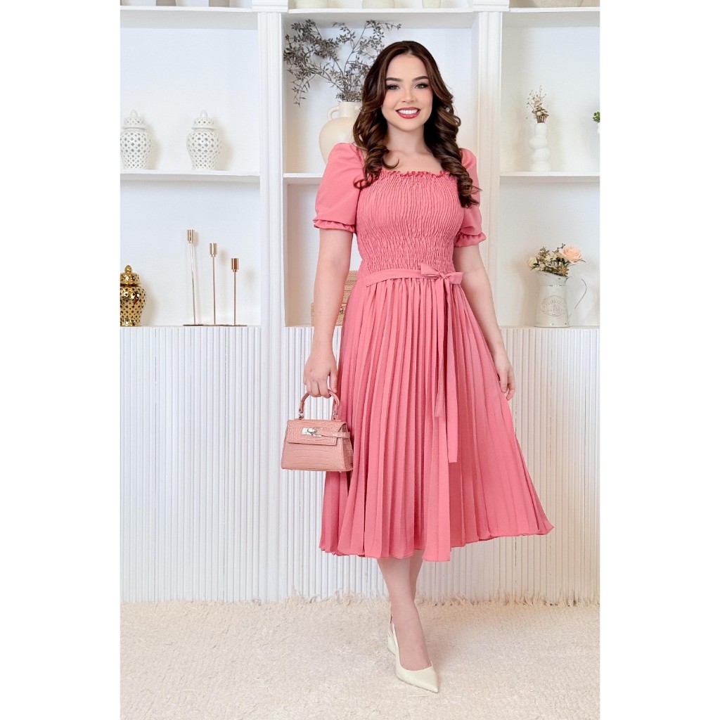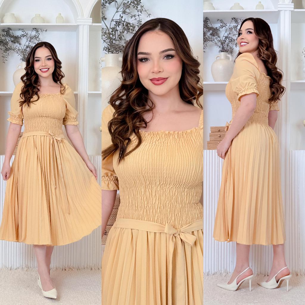 Vestido Feminino Midi Plissado Lisa, Manga Bufante Cintura Alta com Elastex e Cinto, Moda Evangélica