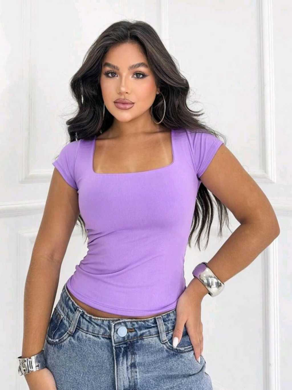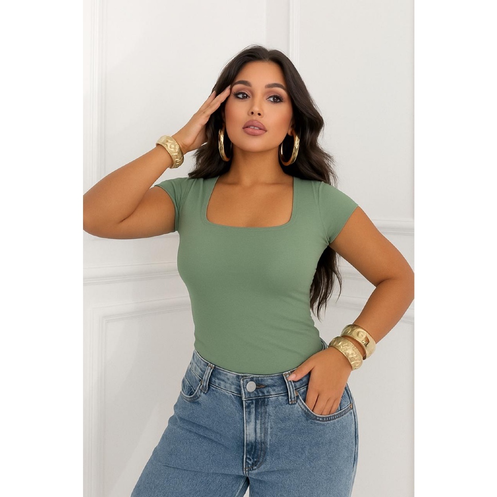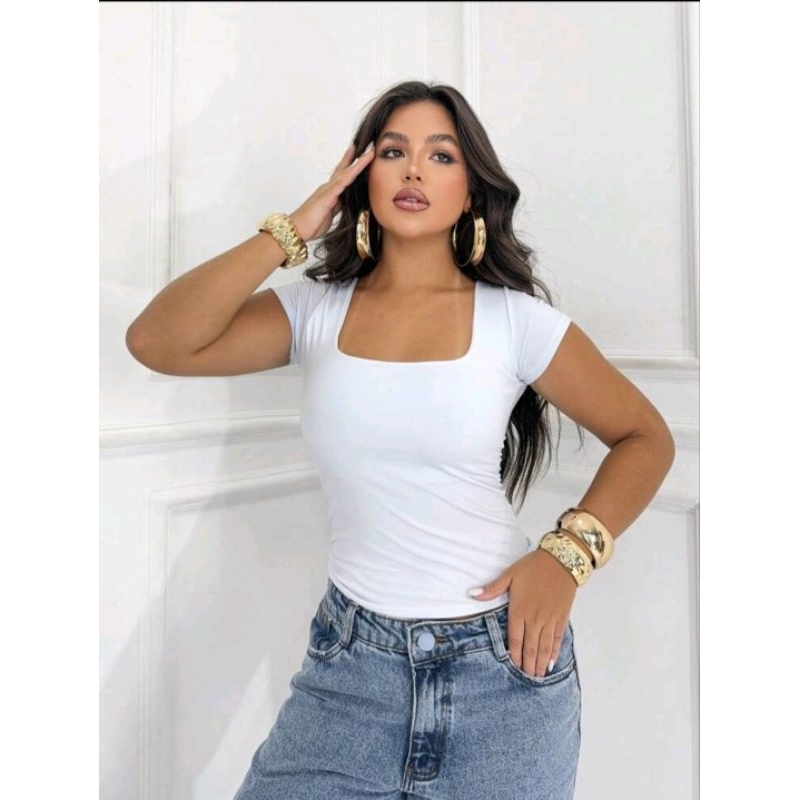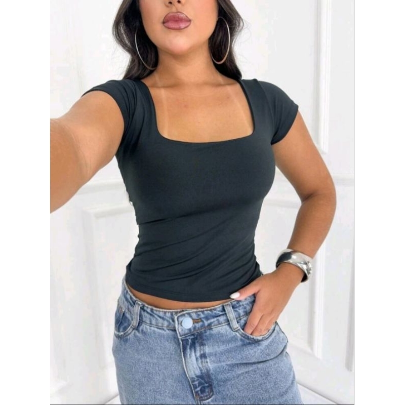 Blusa Baby Look Feminina Básica Com Decote Quadrado Com Manga Curta Moda Casual Versátil Blogueira