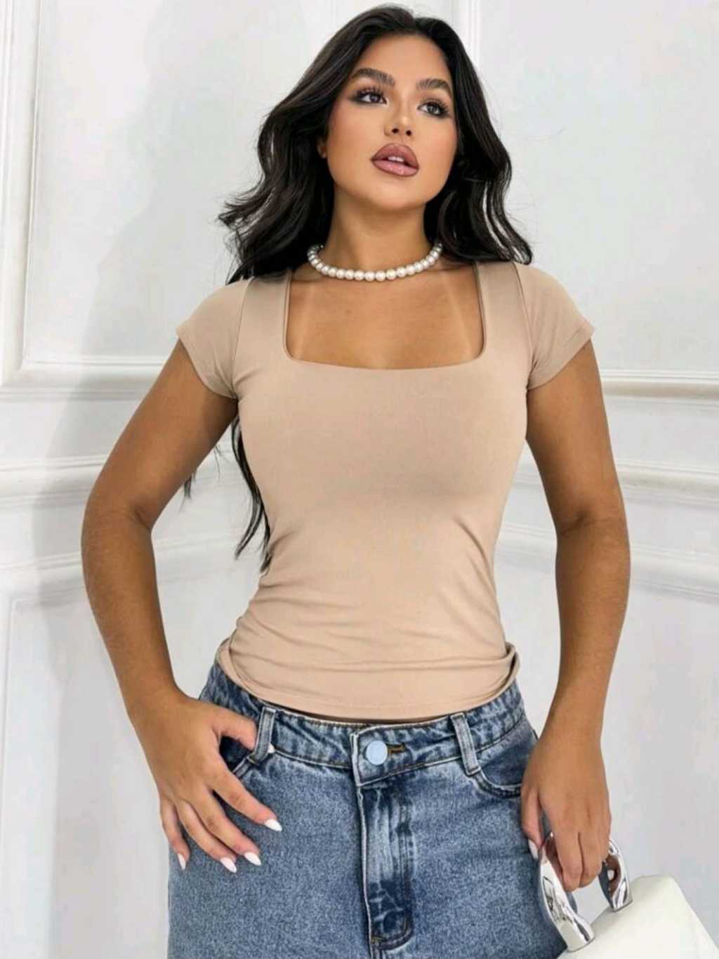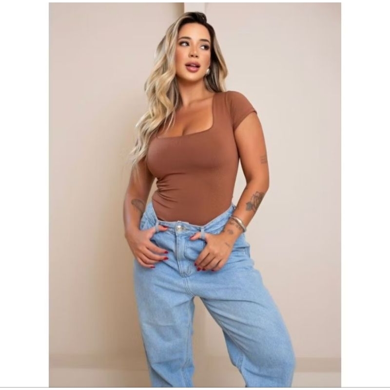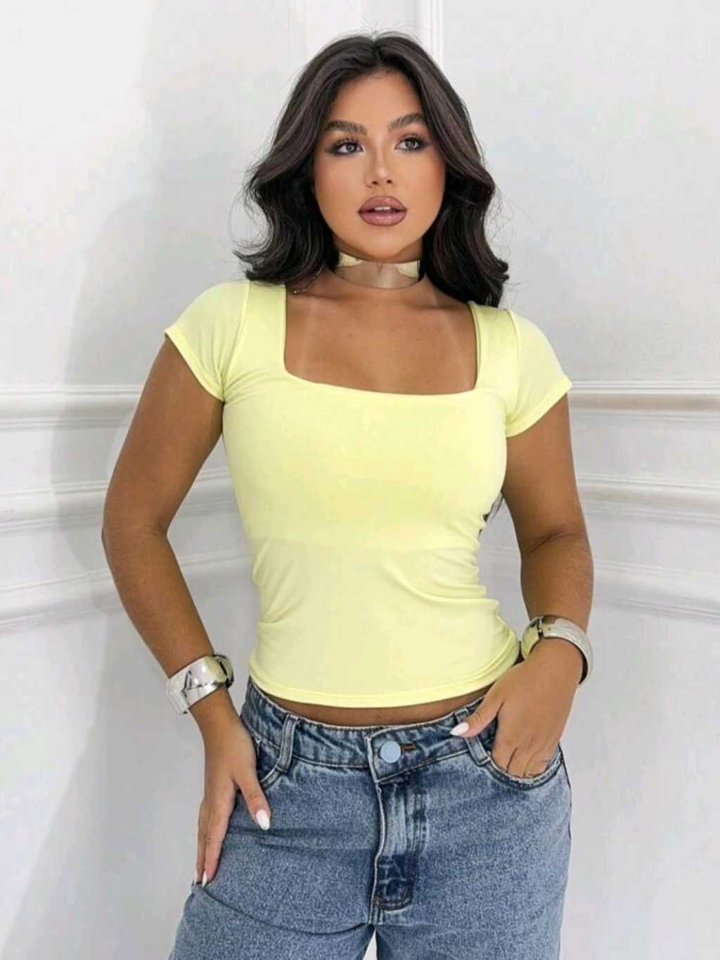 Blusa Baby Look Feminina Básica Com Decote Quadrado Com Manga Curta Moda Casual Versátil Blogueira