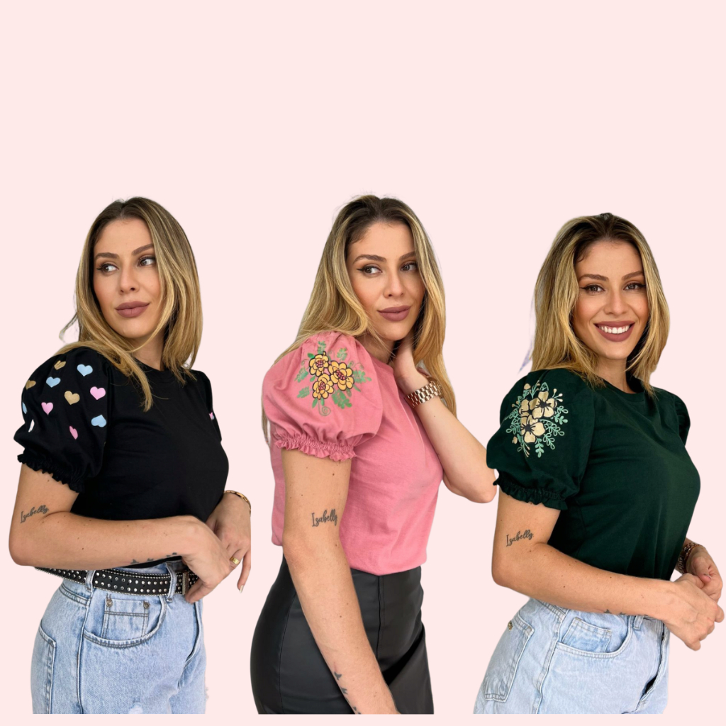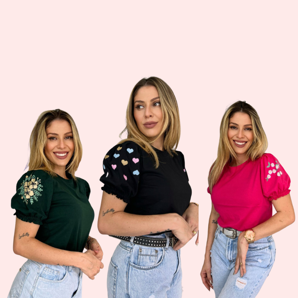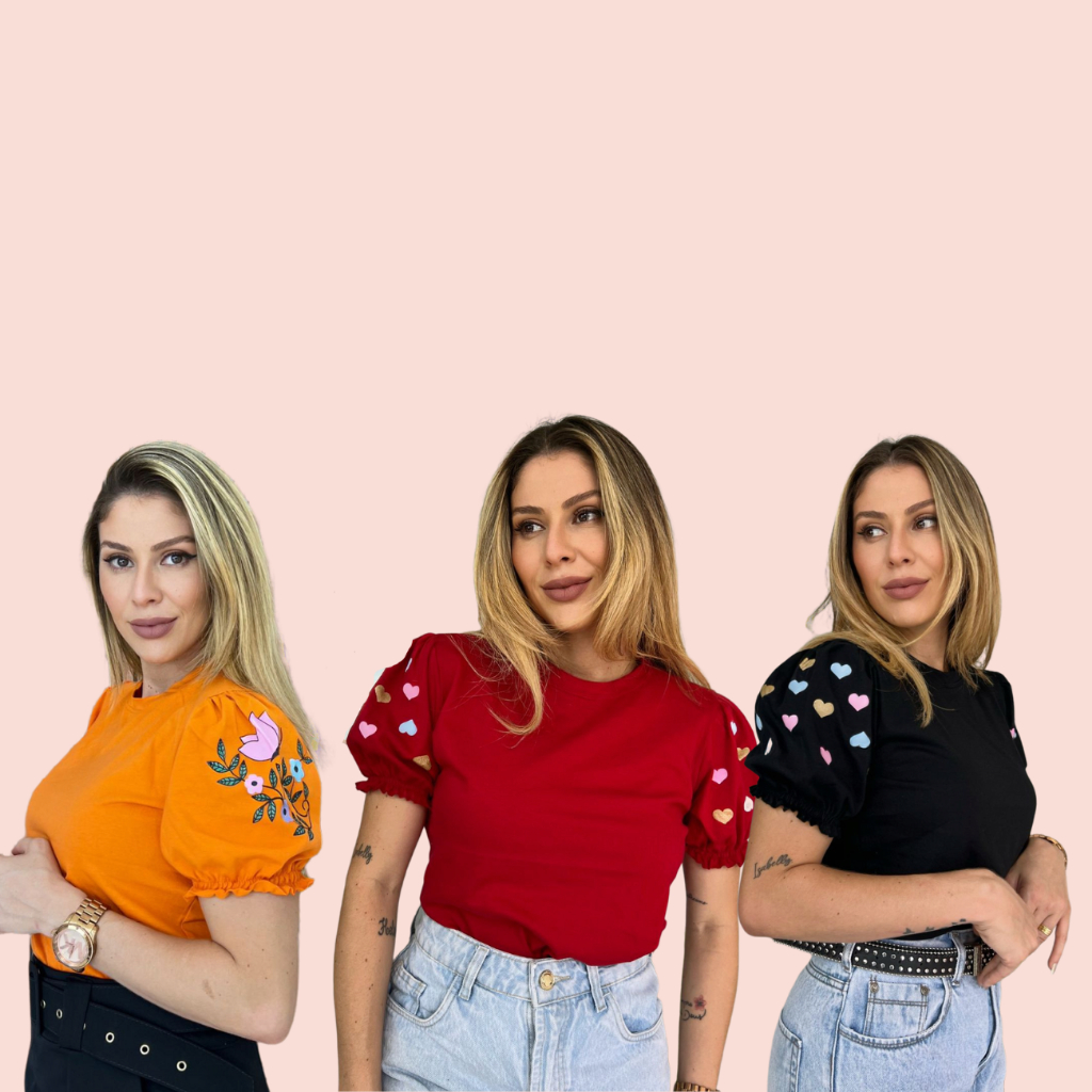 3 Blusas T-shirt Femininas com Manga Princesa e Estampa Silk 3D em Algodão 100% Fio 30, Sofisticação