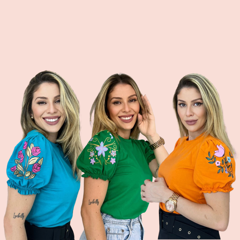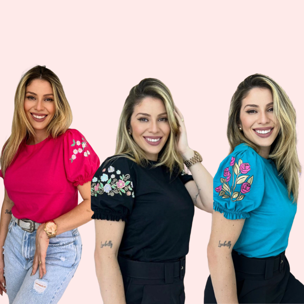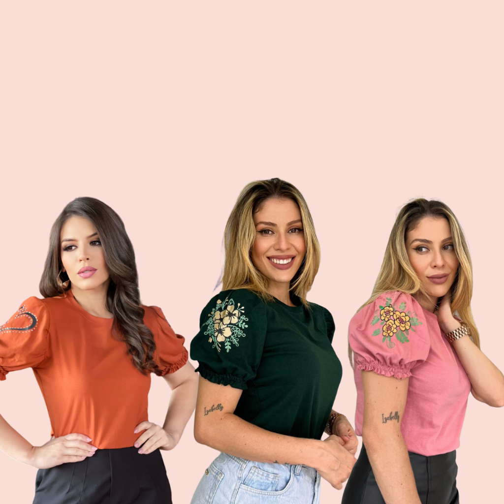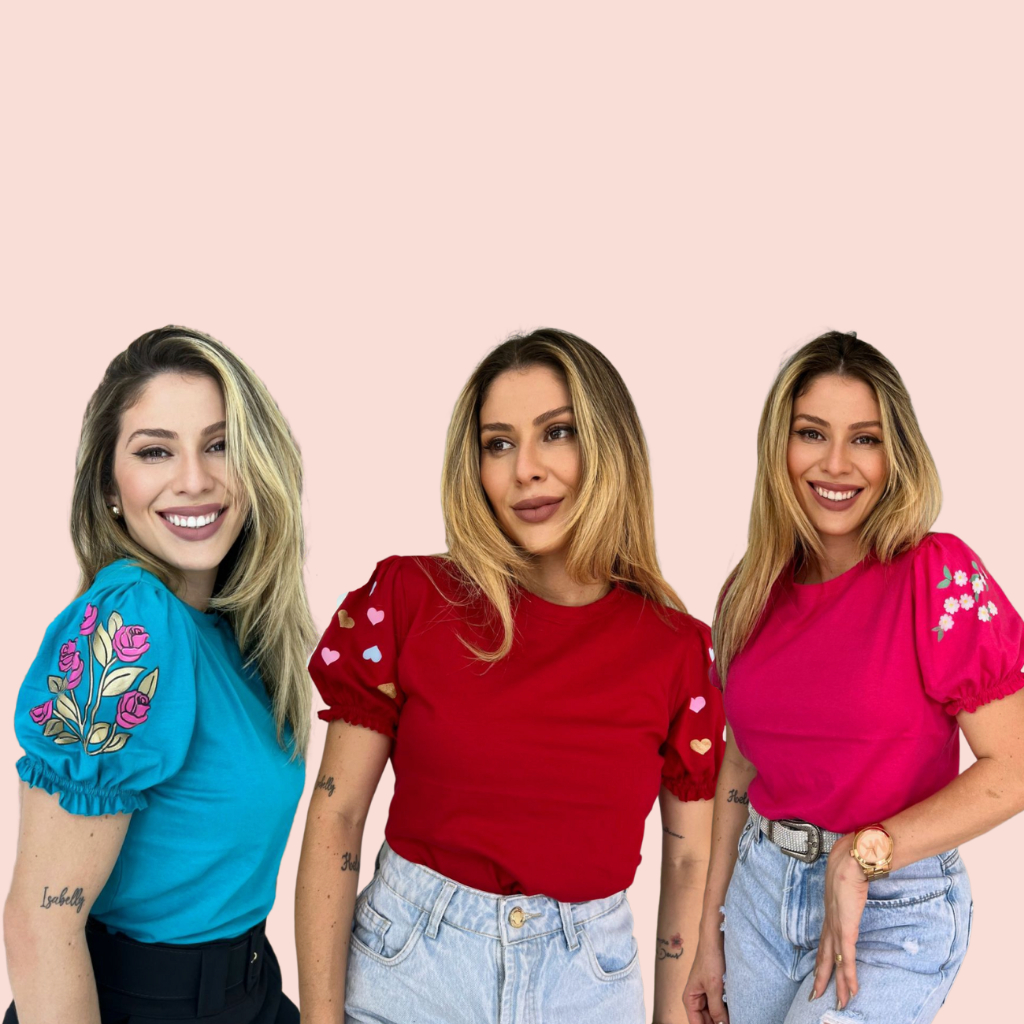 3 Blusas T-shirt Femininas com Manga Princesa e Estampa Silk 3D em Algodão 100% Fio 30, Sofisticação