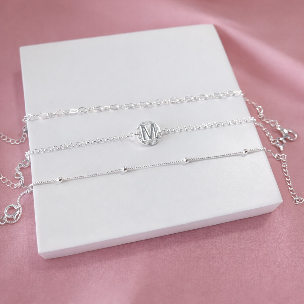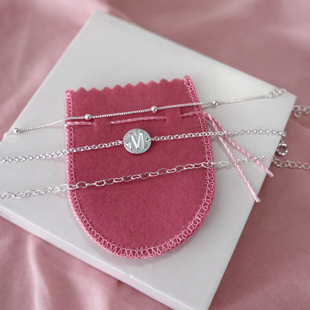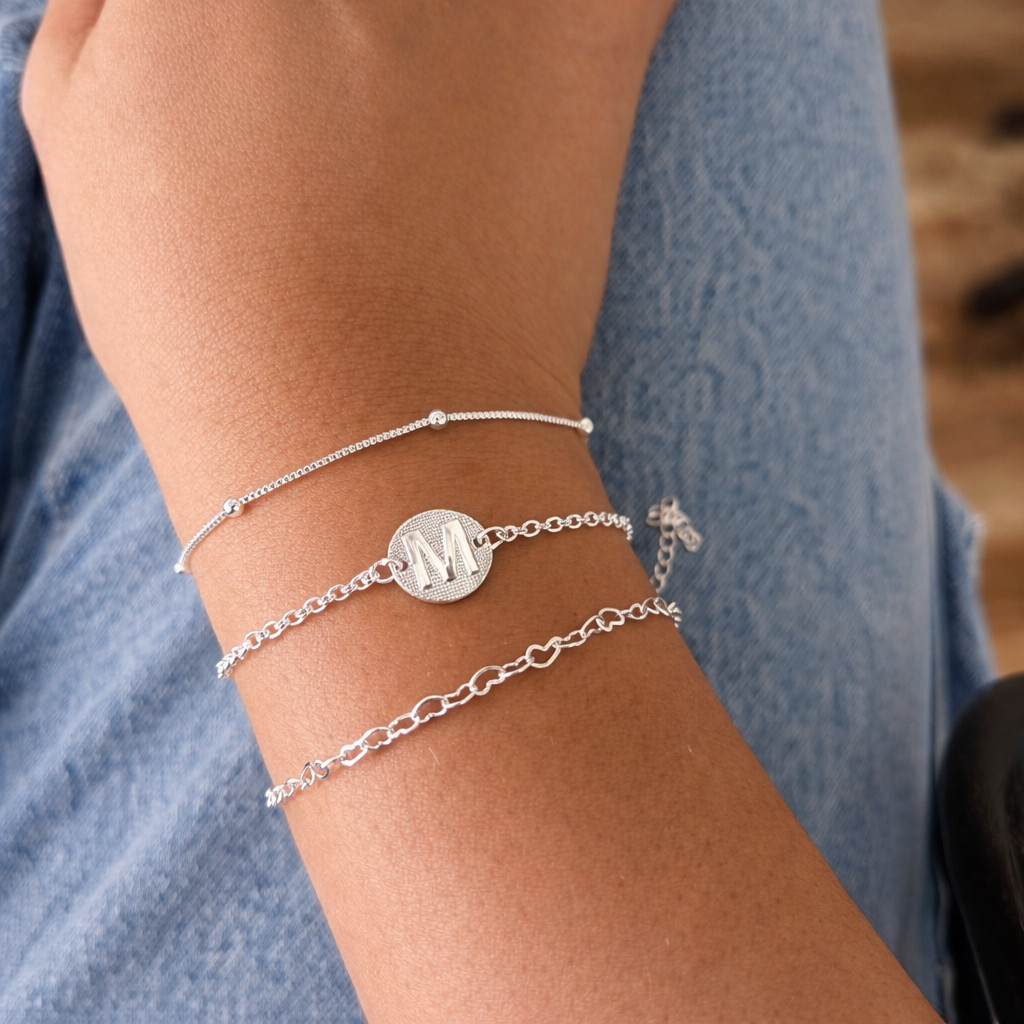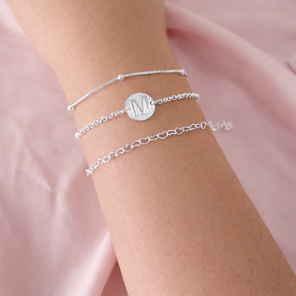 Kit 03 Pulseiras Veneziana Bolinha, Corações e Elo Portuges Com Pingente Letra Inicial Nome Banhada Prata 925