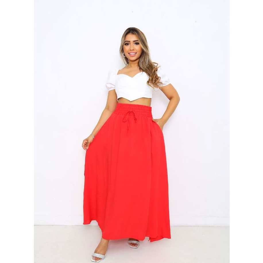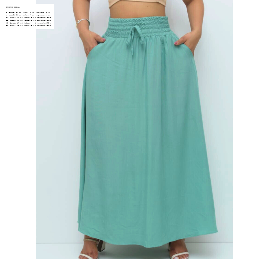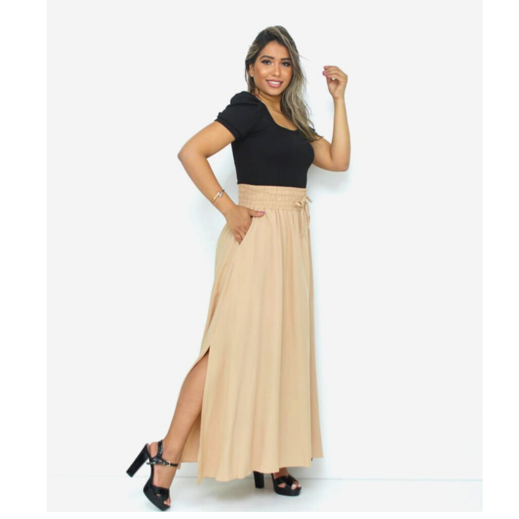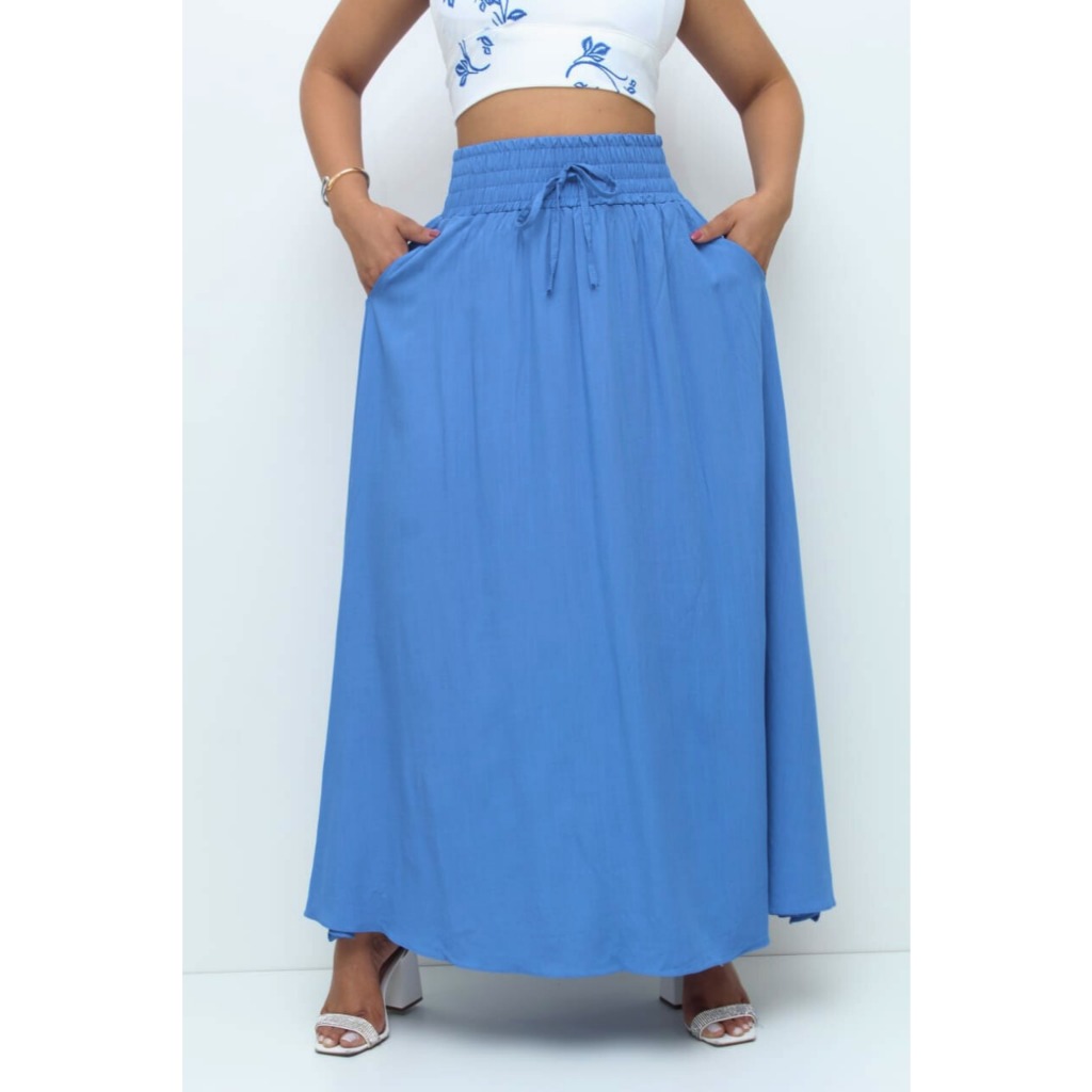 Saia Longa Feminina Forrada Cós Largo De Elástico Cintura Alta Com Bolso Viscolinho