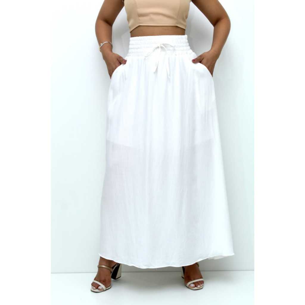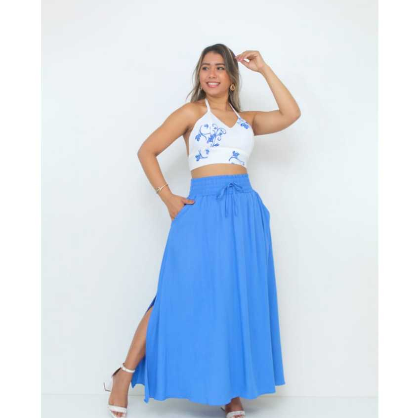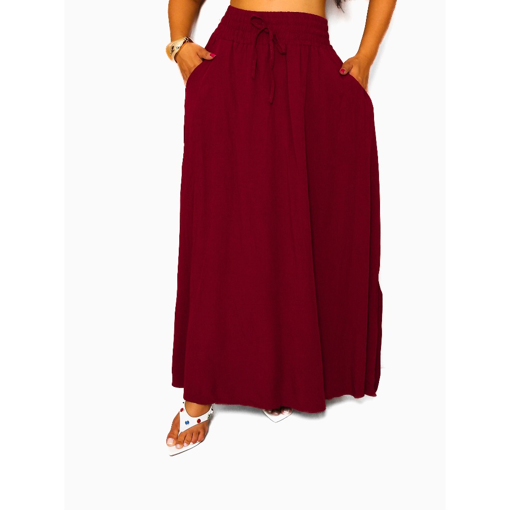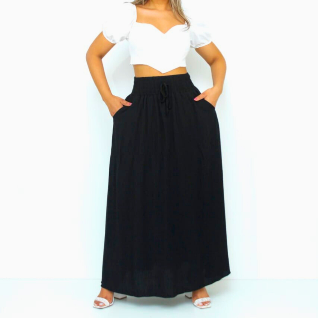 Saia Longa Feminina Forrada Cós Largo De Elástico Cintura Alta Com Bolso Viscolinho