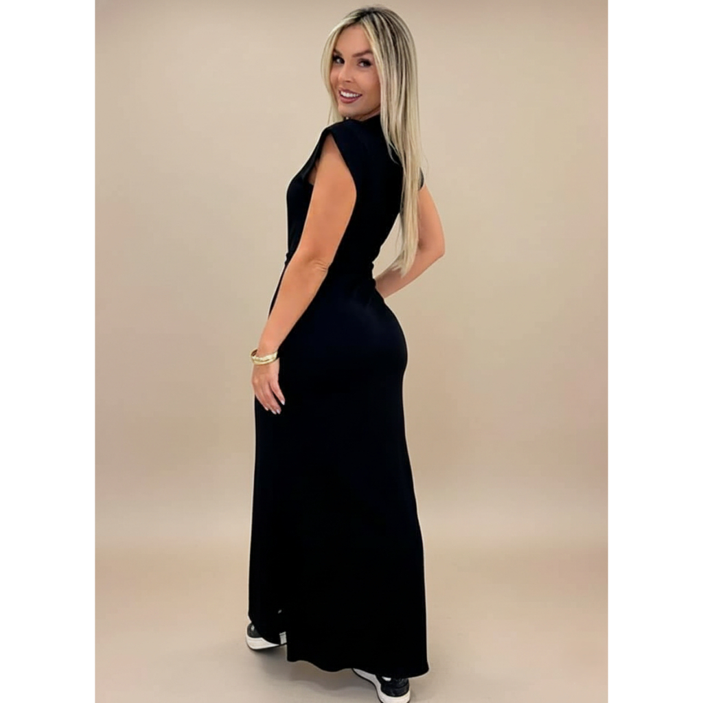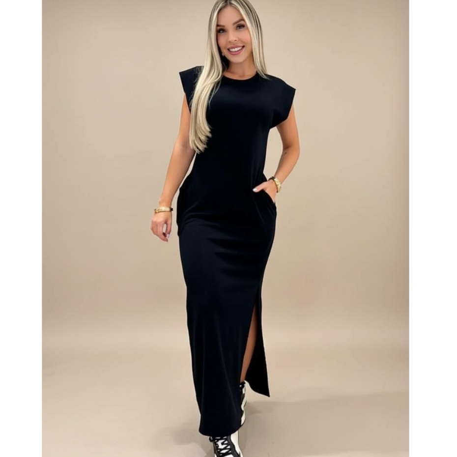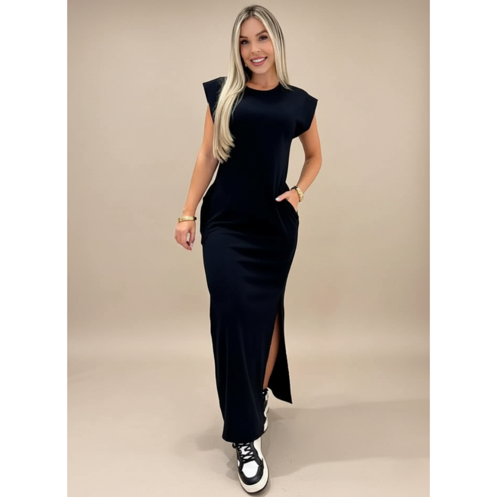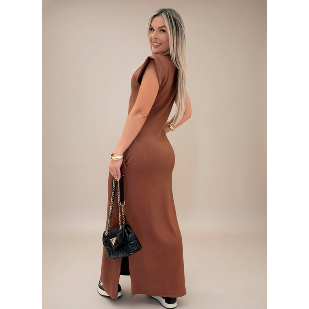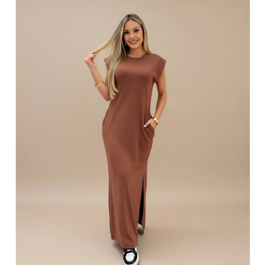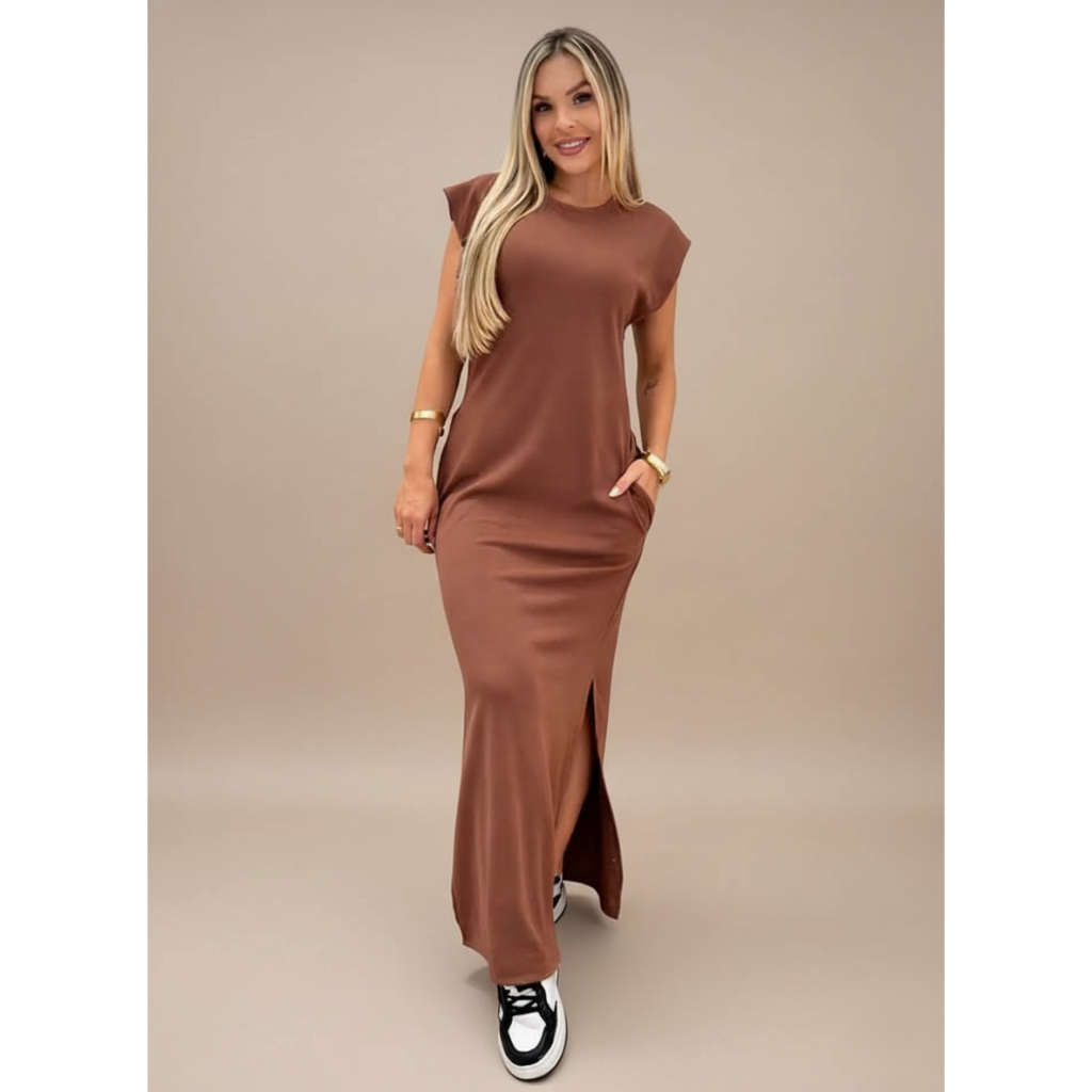 Vestido longo casual básico feminino ribana manga canelada muscle fashion gringa preto marrom