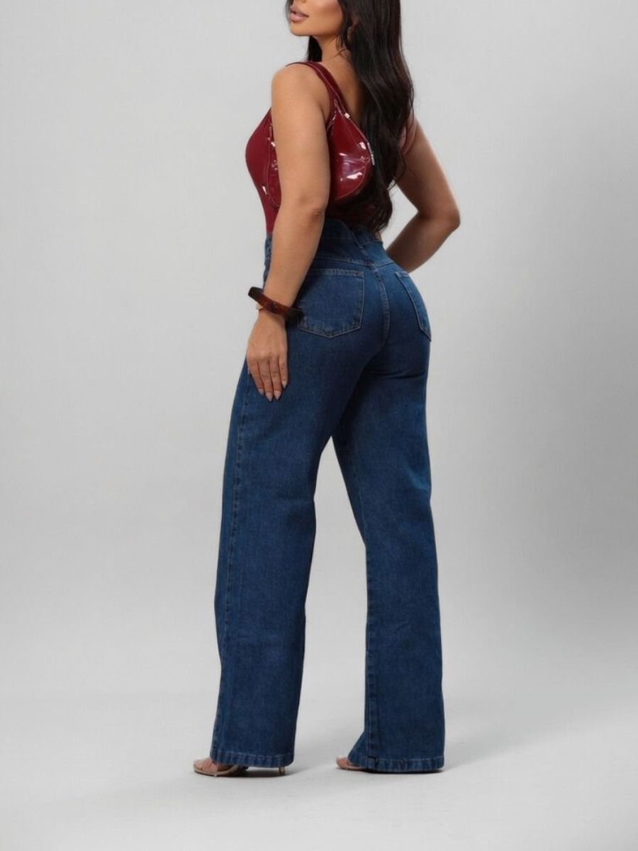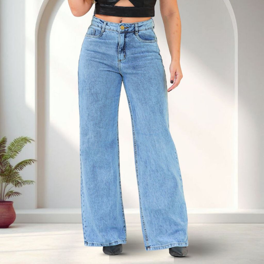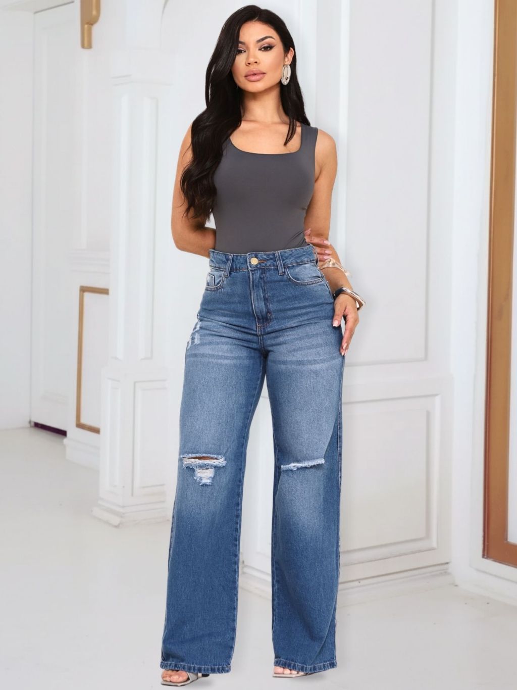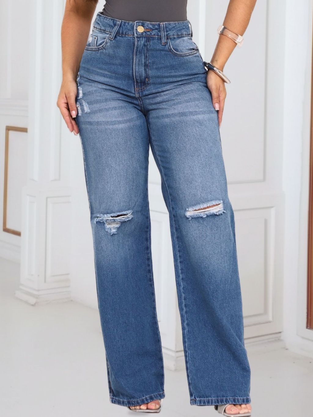 Calça Wide Leg Jeans Feminina Rasgada no Joelho Cintura Alta 100% Algodão Moda Influencer Digital