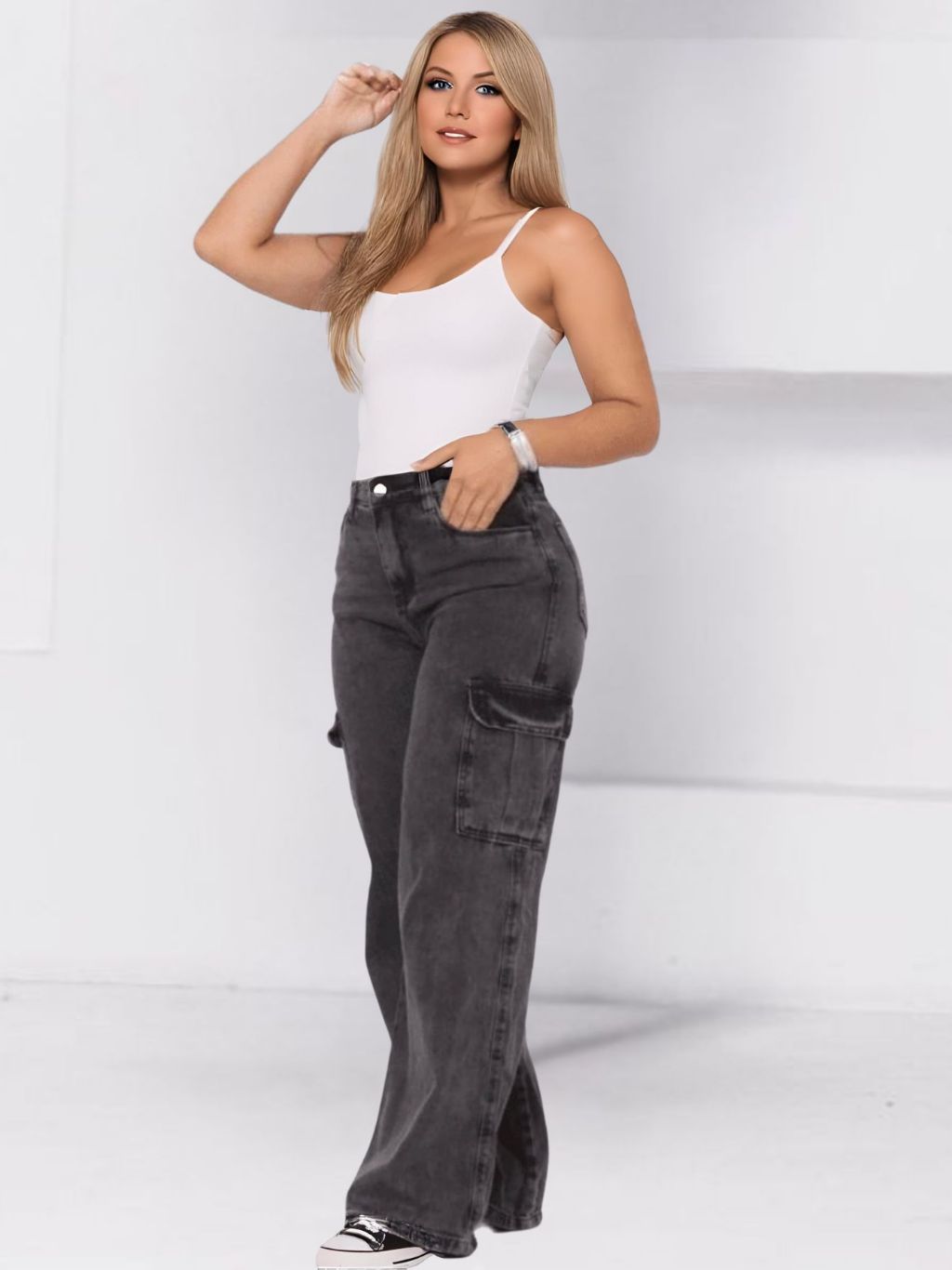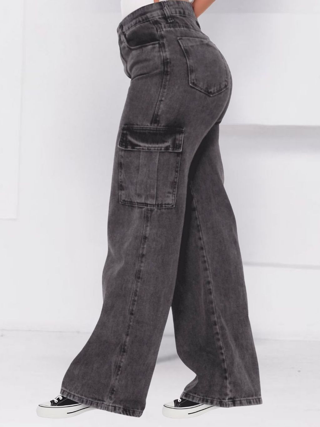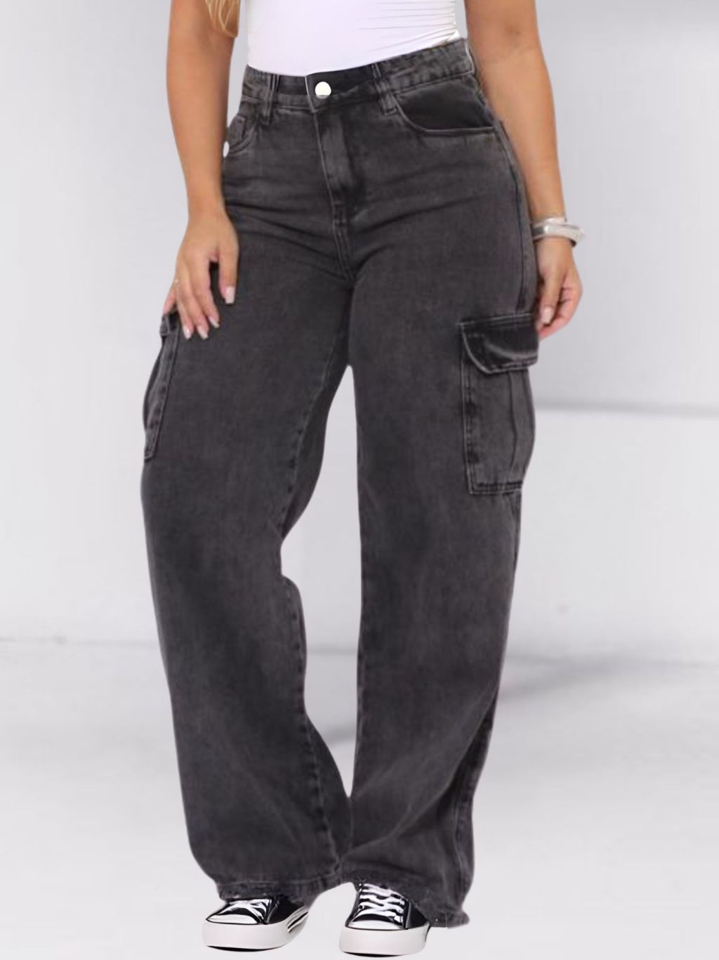 Calça Cargo Feminina Jeans Grafite Perna Larga Wide Leg Cintura Alta Bolsos