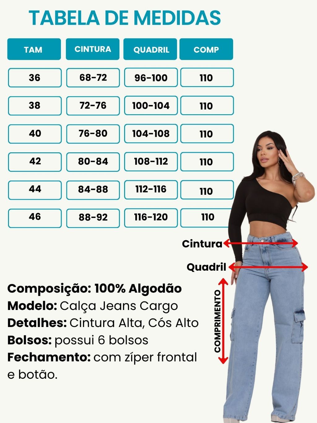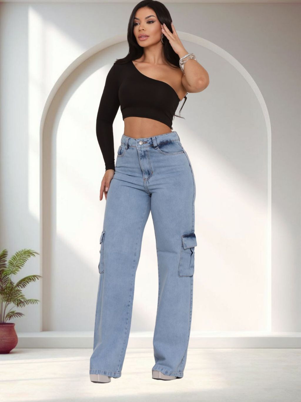 Calça Jeans Cargo Feminina Wide Leg Cintura Alta Lavagem Clara tecido grosso 100% Algodão