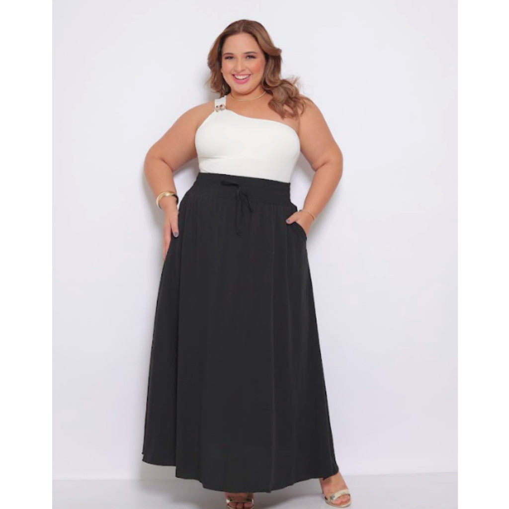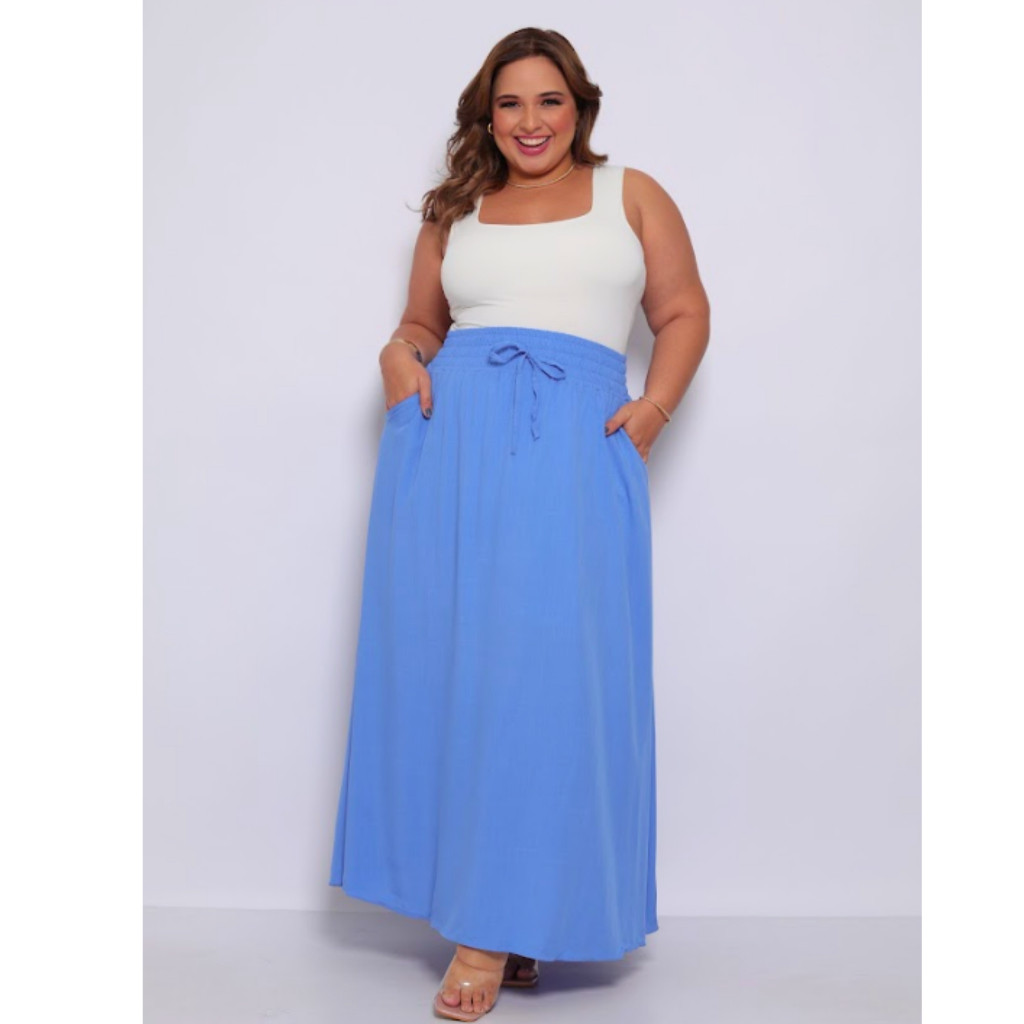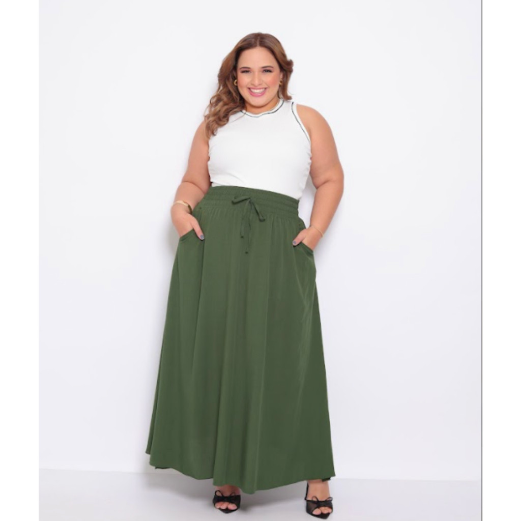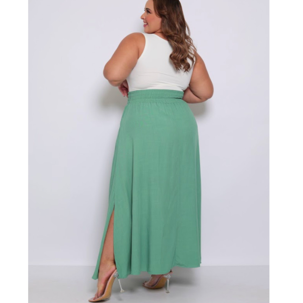 Saia Longa Plus Size Viscolinho Cintura Alta com Bolsos e Fendas Laterais