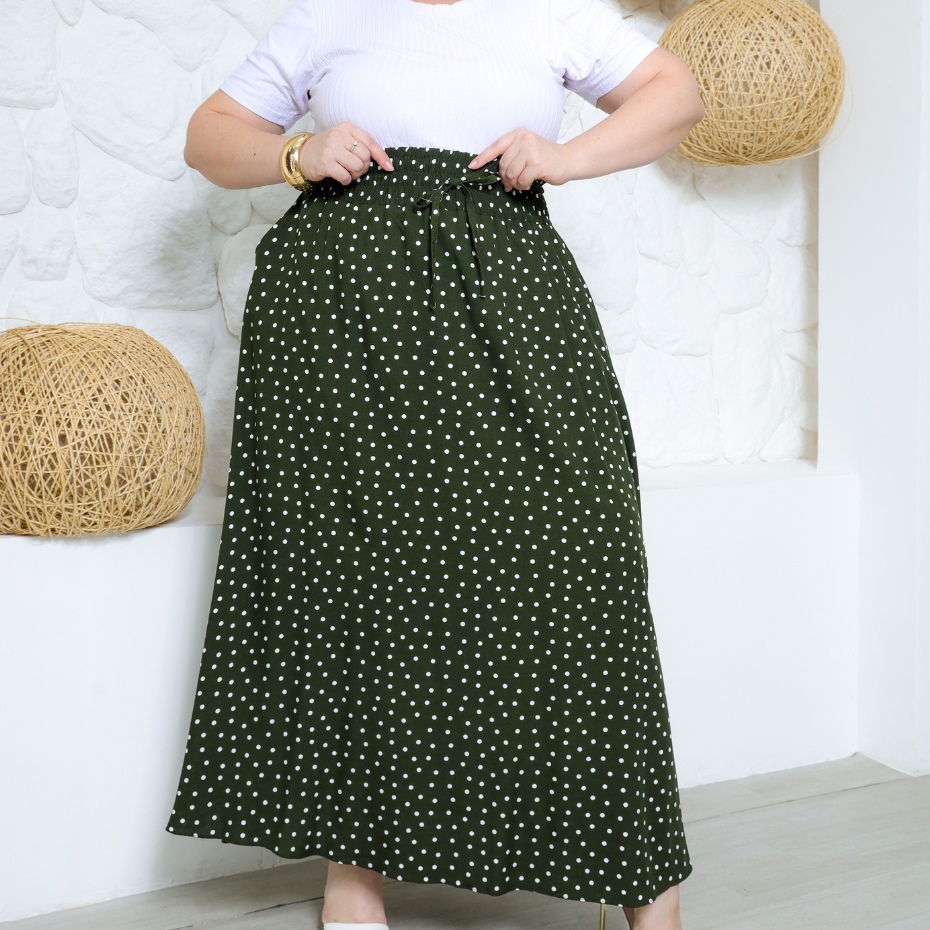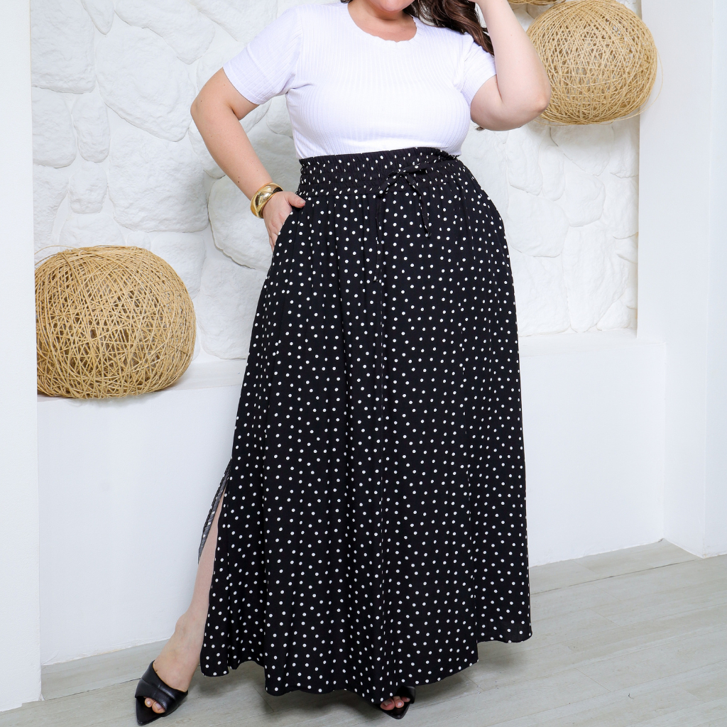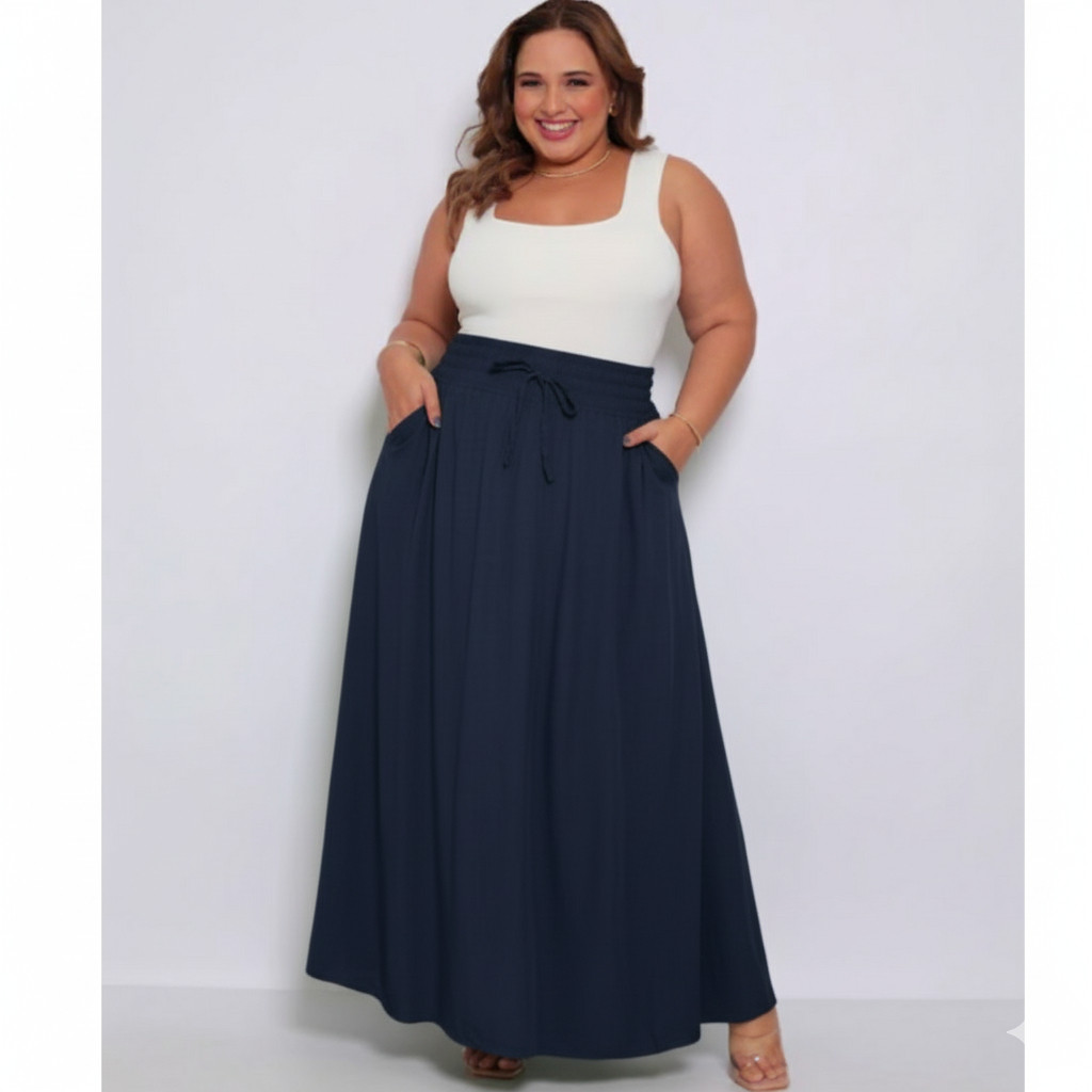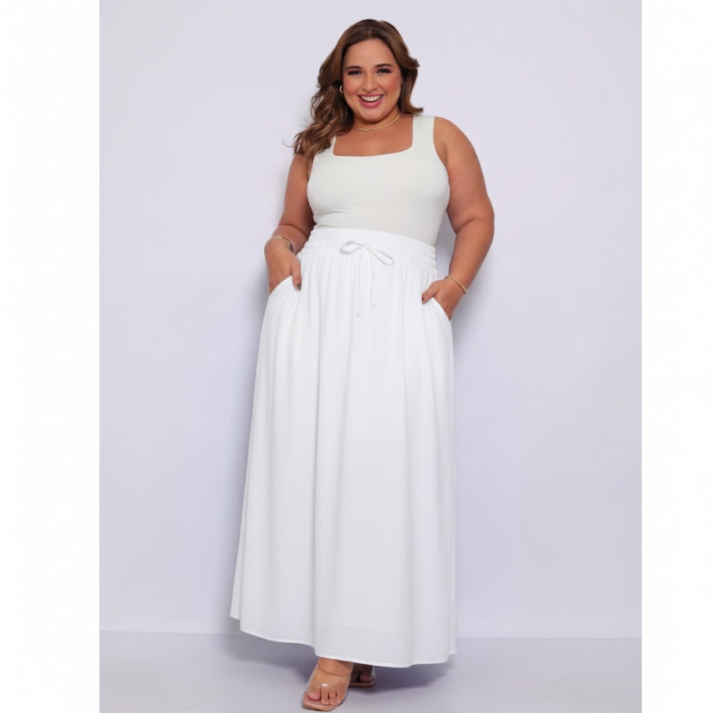 Saia Longa Plus Size Viscolinho Cintura Alta com Bolsos e Fendas Laterais