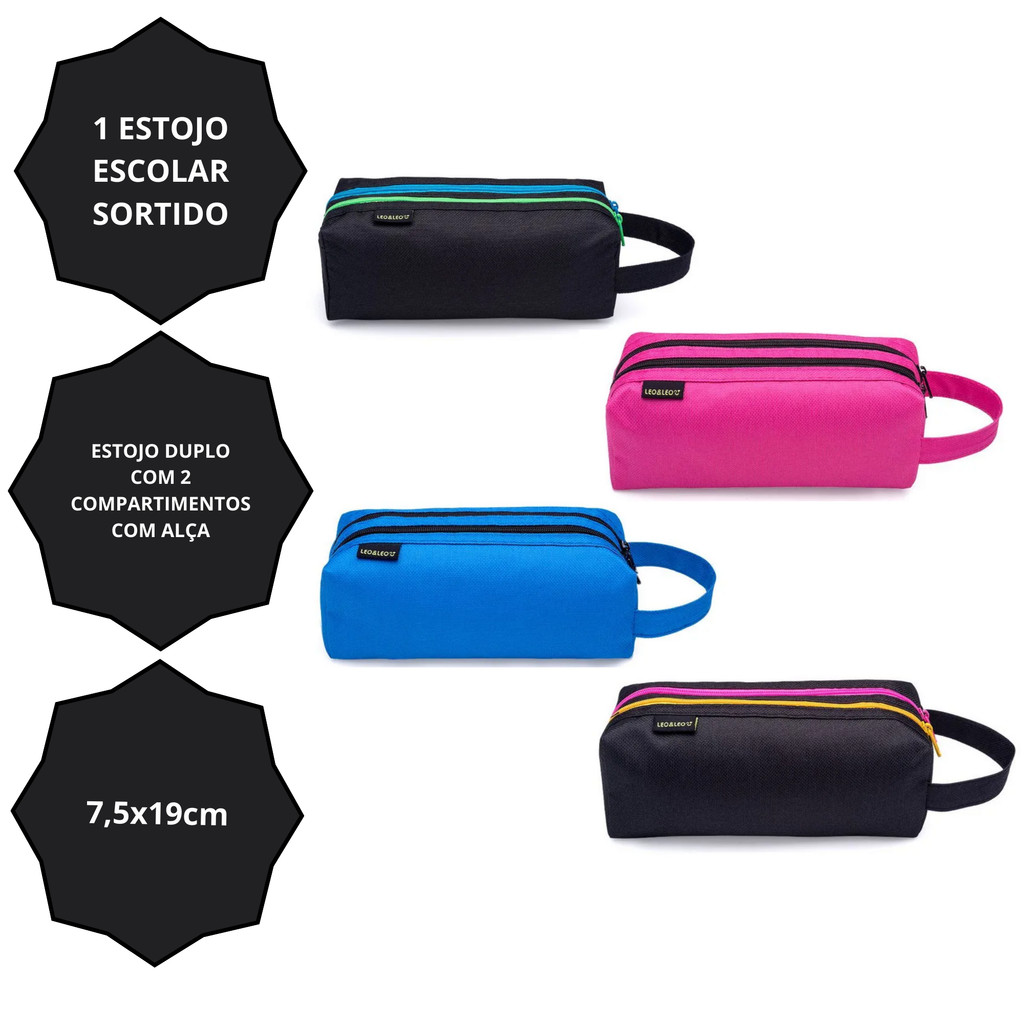 Estojo Escolar Juvenil Duplo Carbon 7,5x19cm 2 Compartimentos + Alça Leo&Leo Sortida